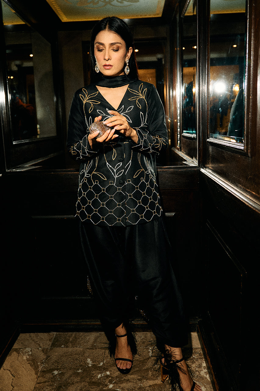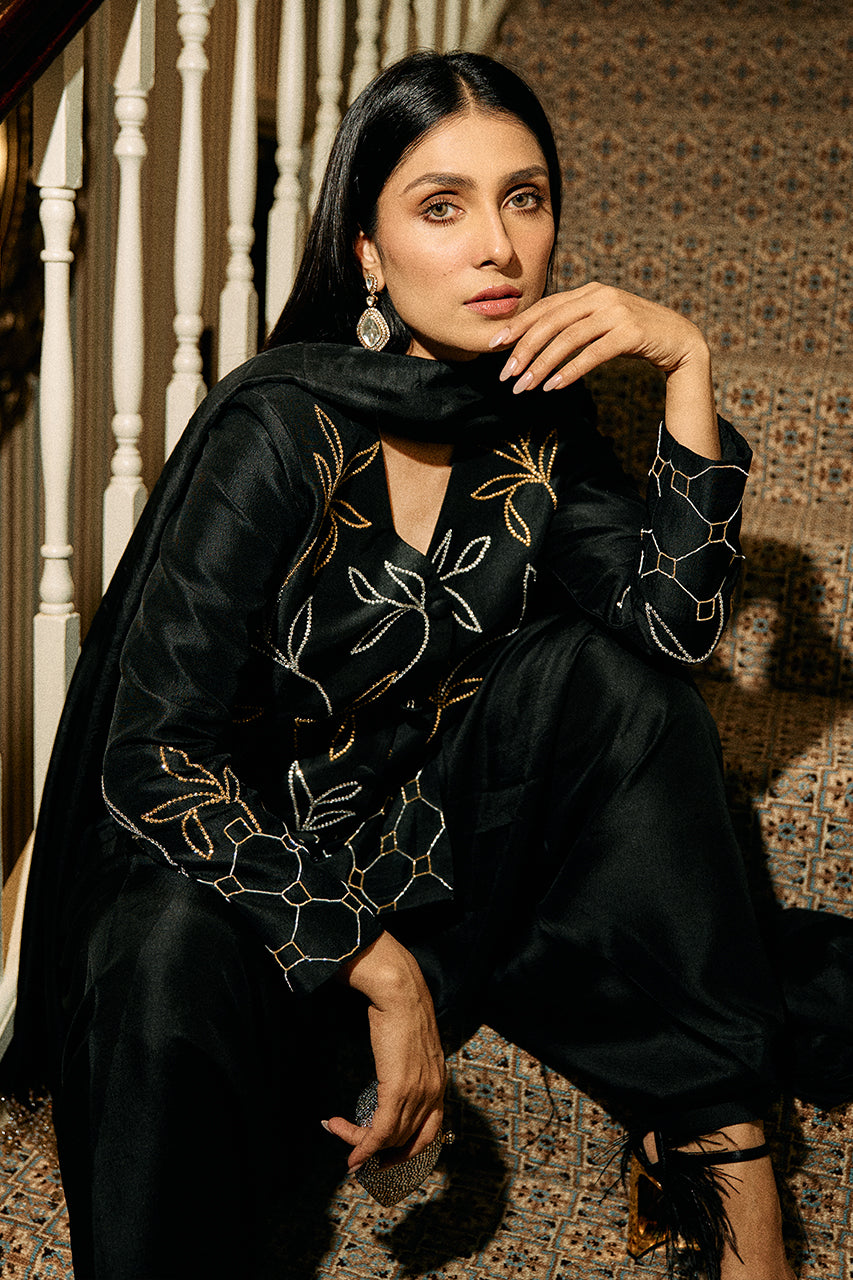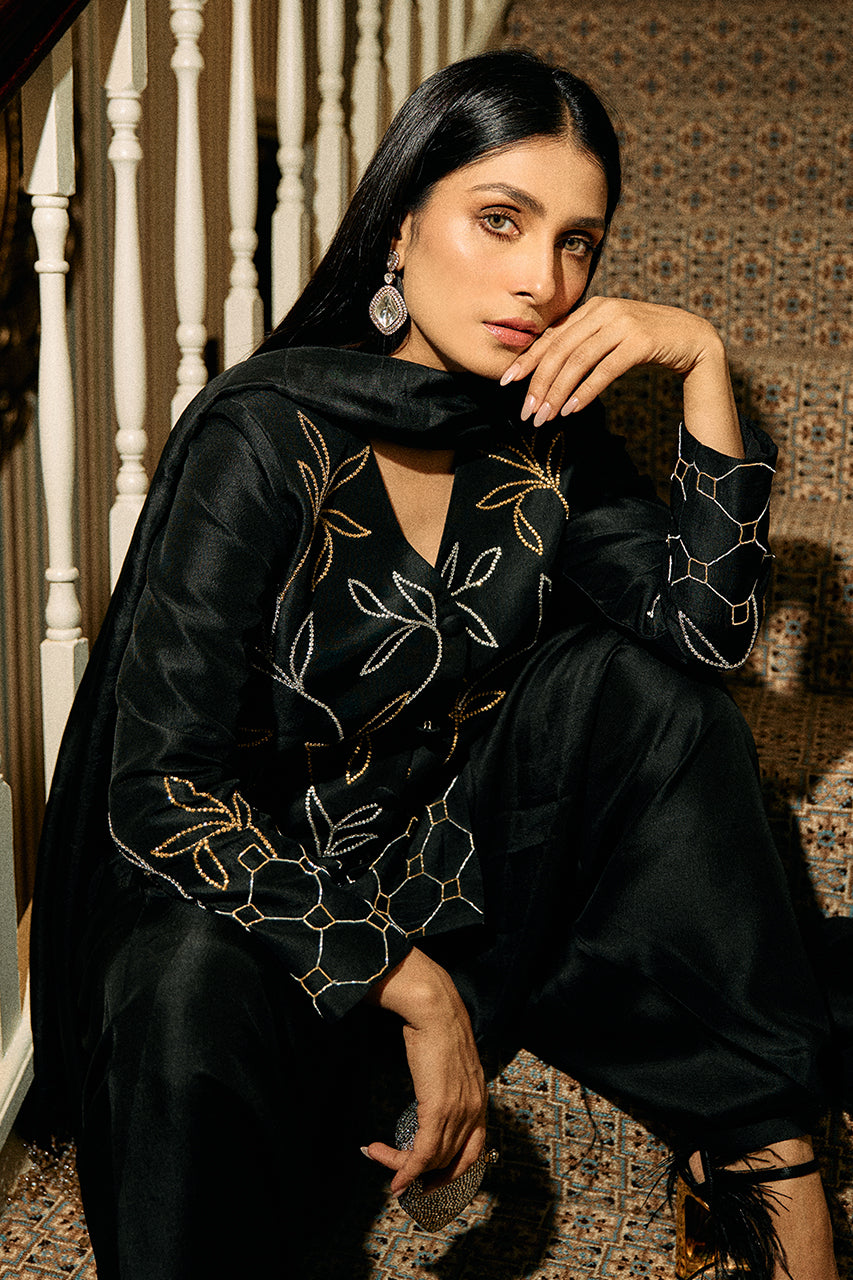 Presenting an astonishing black silk jacket meticulously fused with embroidery and embellishments forming beautiful geometric and floral patterns. It is paired with draped raw silk trousers and a lustrous black silk dupatta, completing the look enthrallingly.