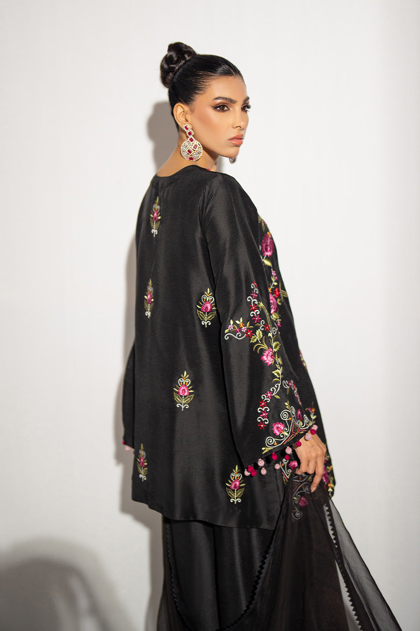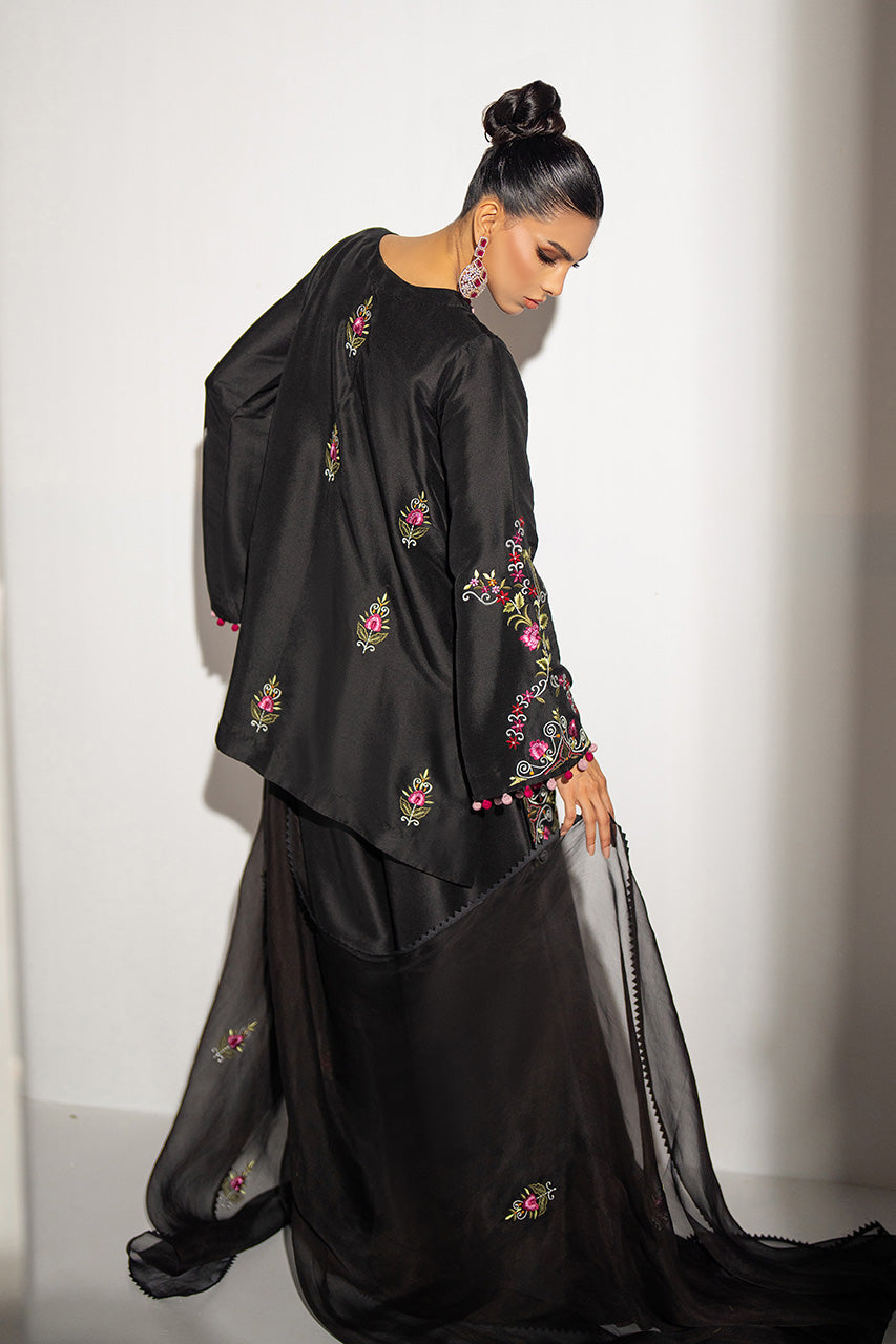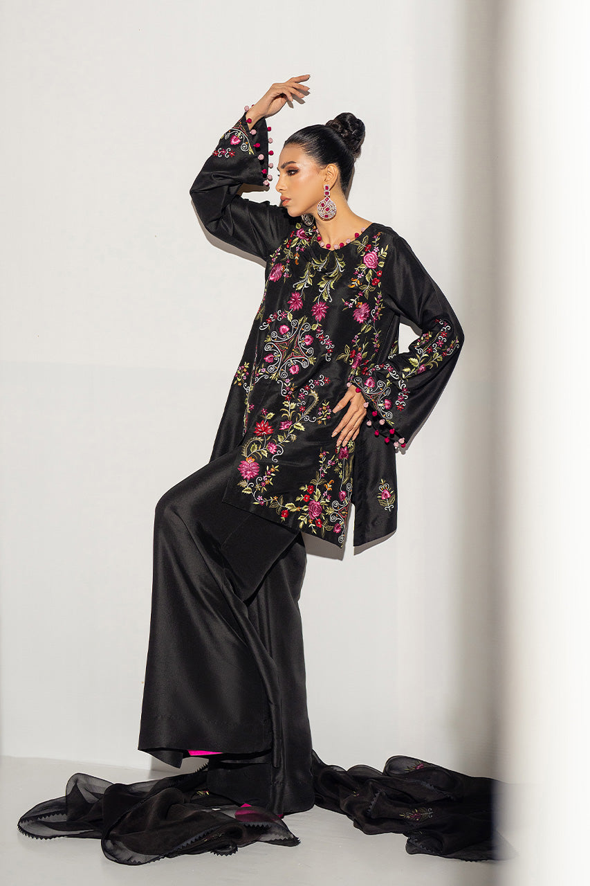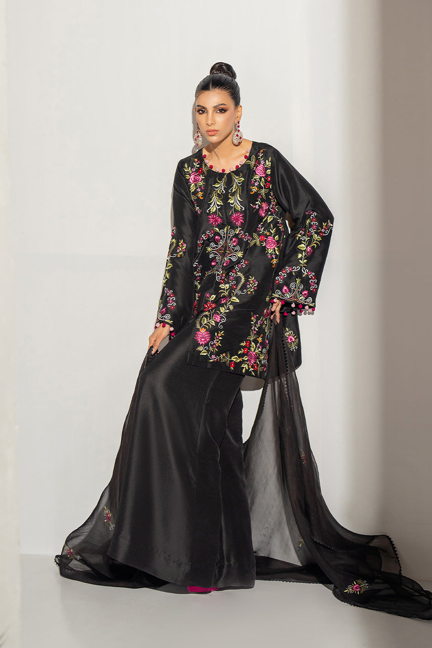 This Raw Silk ensemble intricate flannel machine embroidery creating a luminous and textured appearance adorned with multi loop buttons on detailing elevating its overall look, paired with organza dupatta and Dhaka pants!