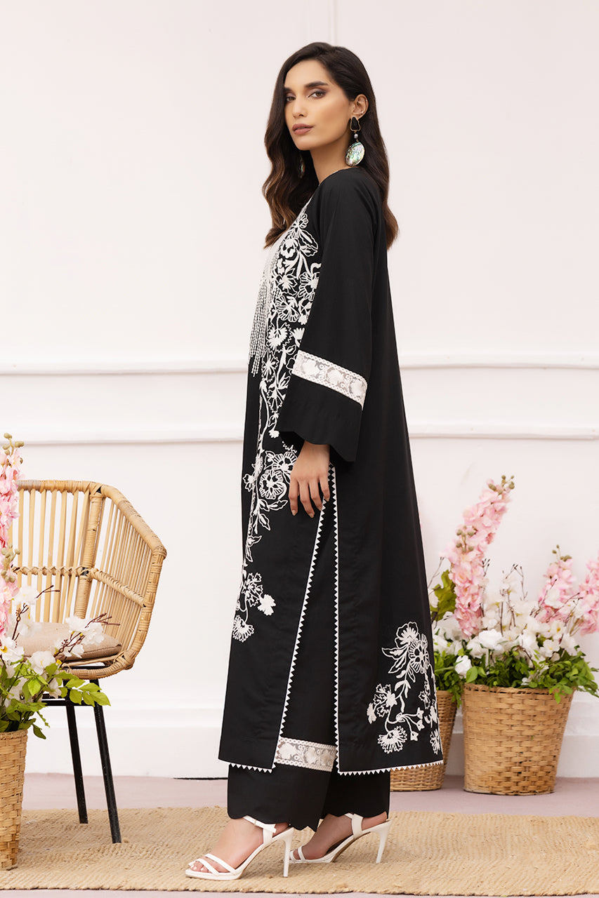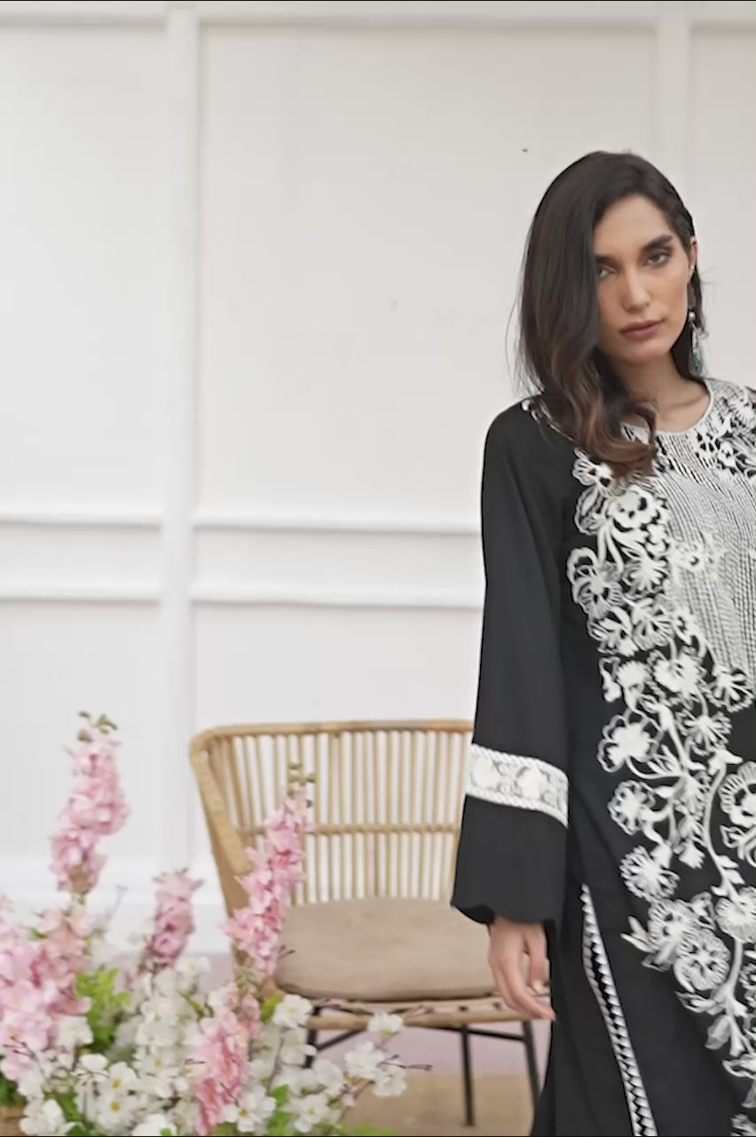 Introducing our elegant ensemble, featuring a black luxurious two-piece attire which is masterfully designed from pure, wrinkle-free cotton it showcases intricate ari embroidery on both the front and back. Skillfully adorned with lace and graced with the distinctive charm of namak para lace, it is complemented exquisitely by tailored ezar pants, symbolizing the pinnacle/Zenith of classic elegance.