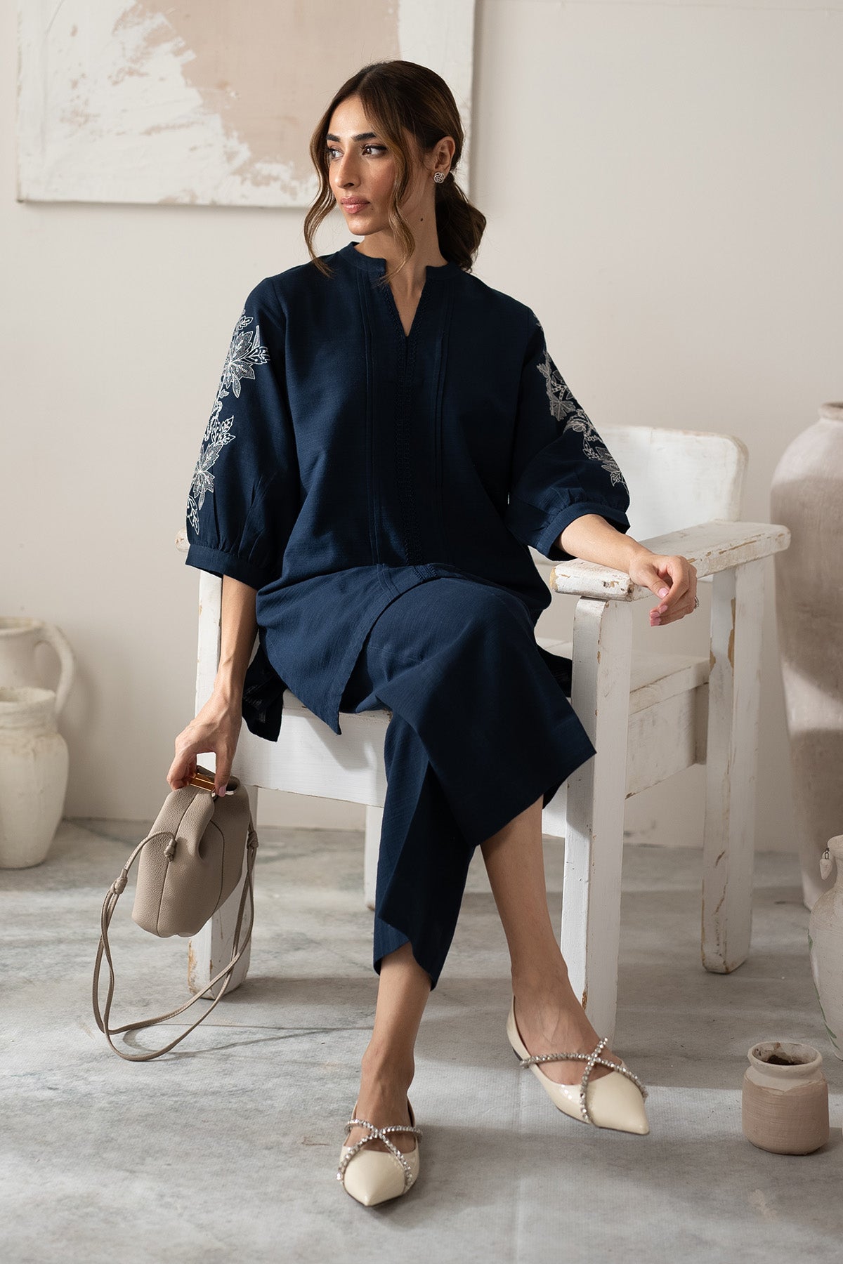 This Cobalt Blue Co-Ord Set Features A V-Neckline With Pintuck And Lace Details Along With Floral Embroidered Sleeves. Paired With Matching Culotte Pants.