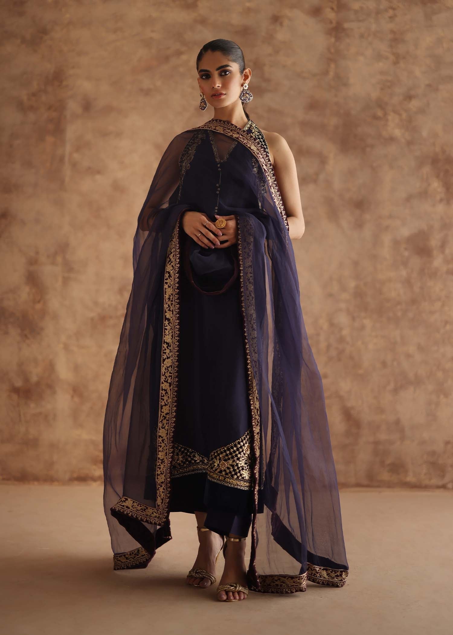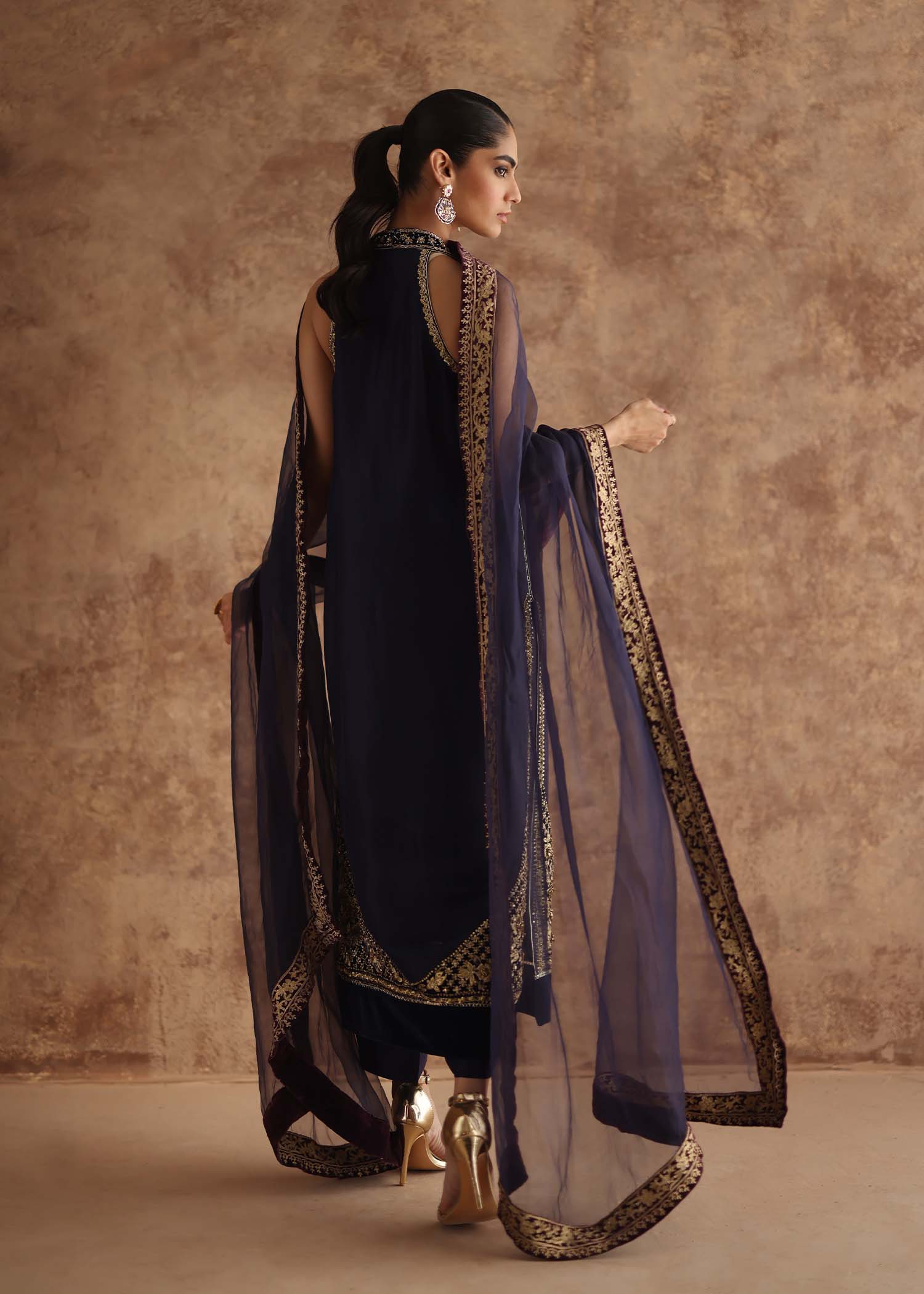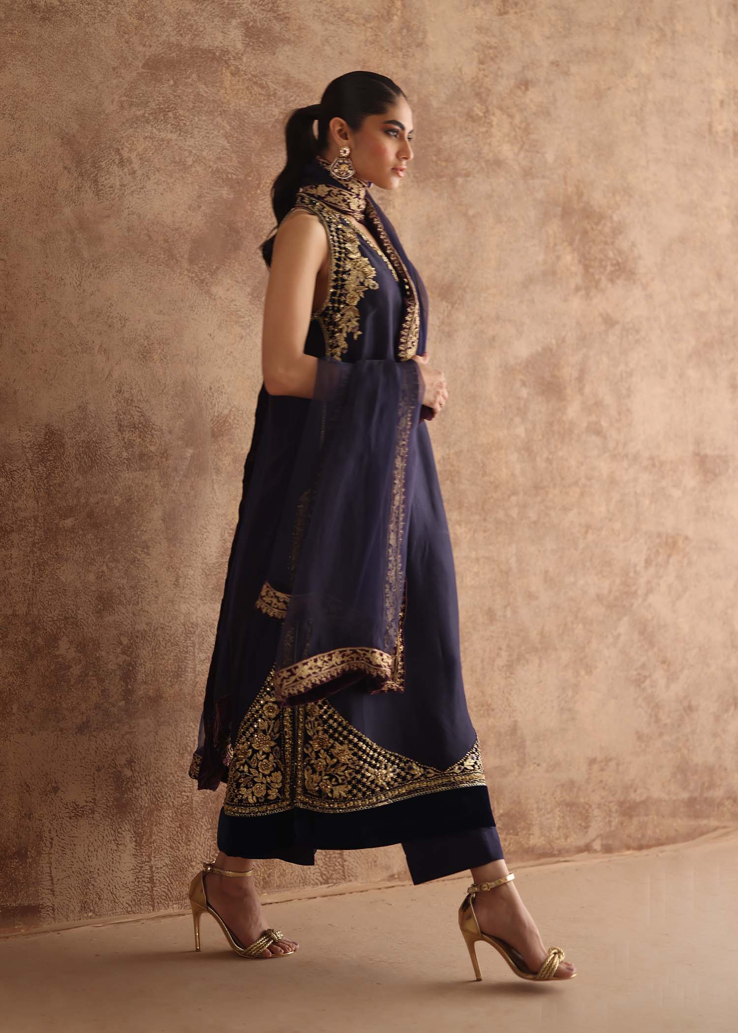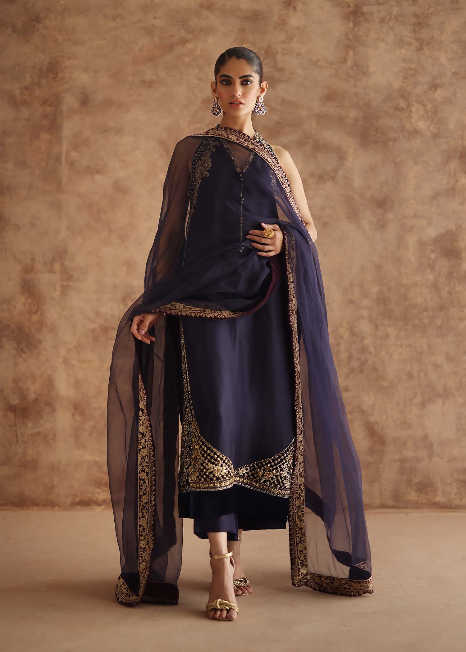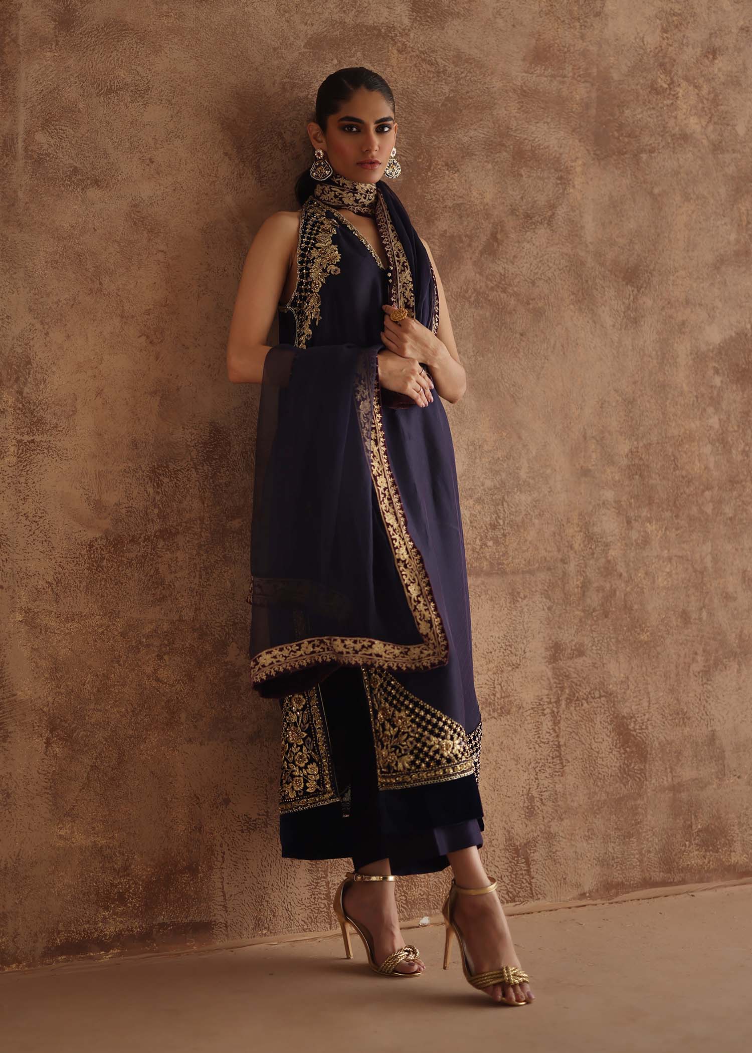 The navy blue ensemble features a pure embossed silk long shirt adorned with velvet applique, burnt gold gotta, and tilla, embellished with intricate handwork. It is elegantly paired with finely tailored culottes and complemented by a pure organza dupatta with velvet borders.