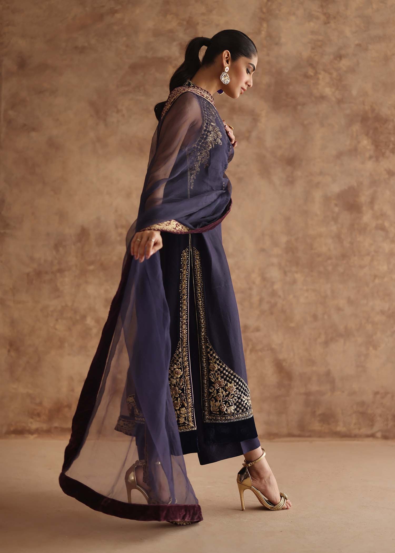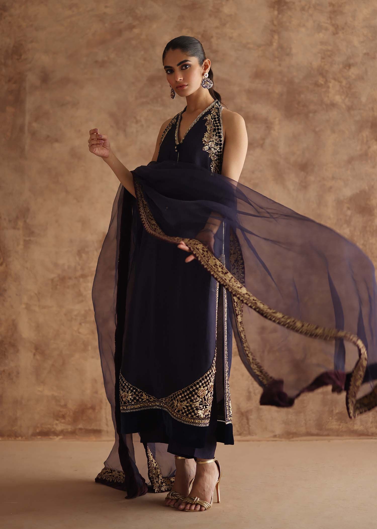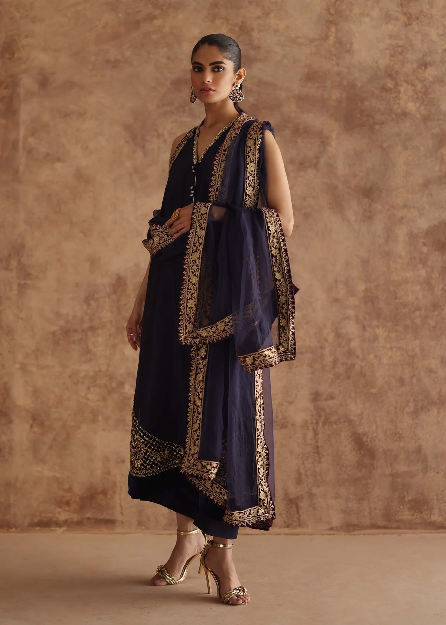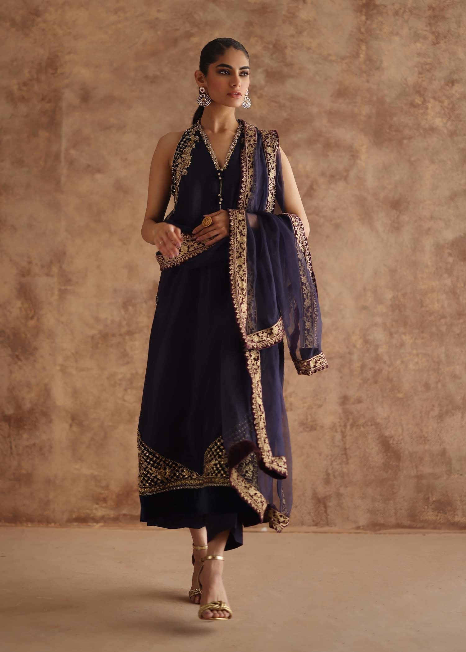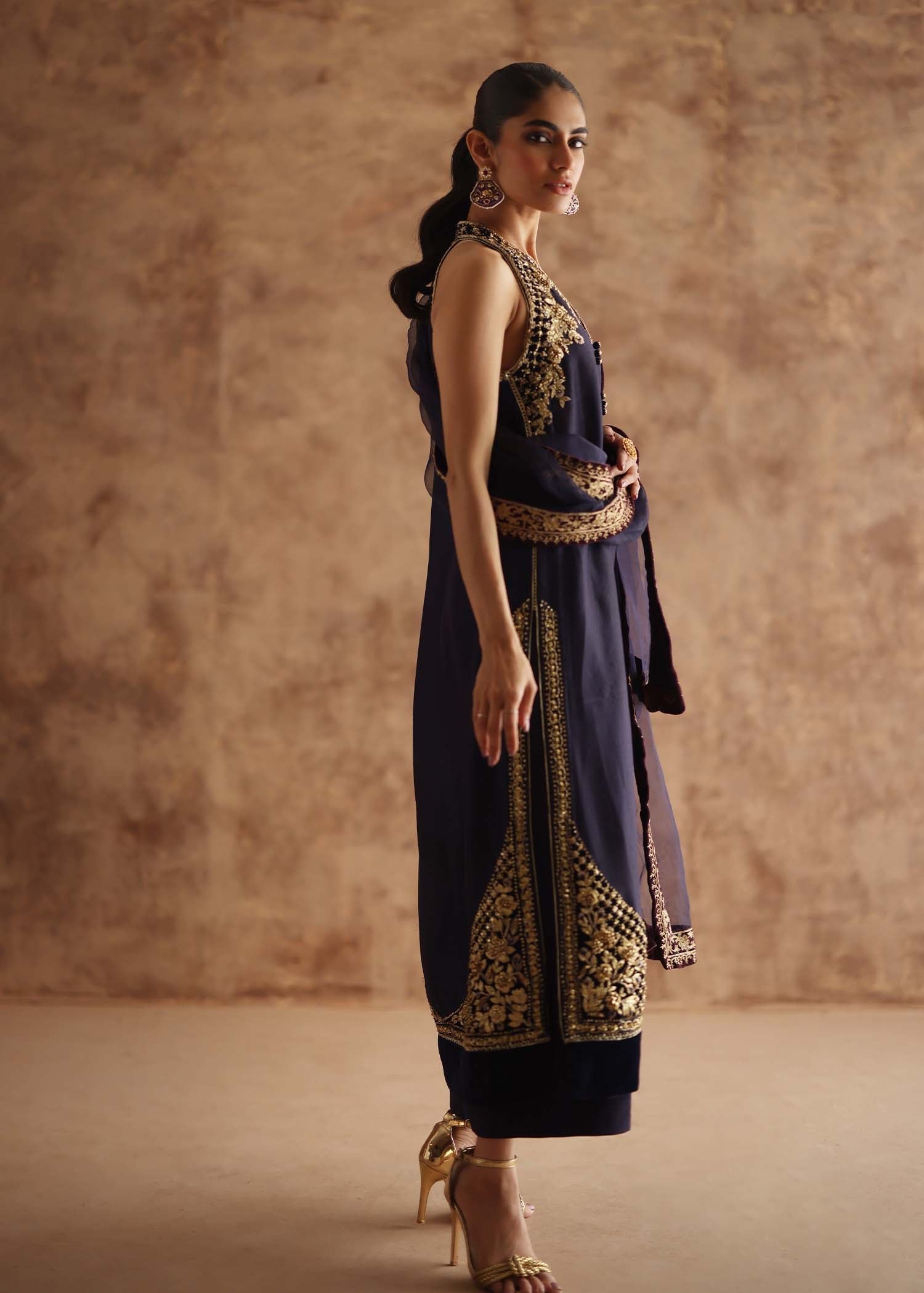 The navy blue ensemble features a pure embossed silk long shirt adorned with velvet applique, burnt gold gotta, and tilla, embellished with intricate handwork. It is elegantly paired with finely tailored culottes and complemented by a pure organza dupatta with velvet borders.