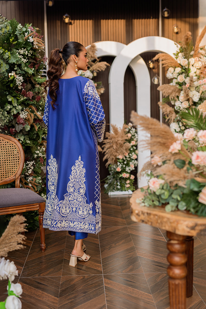 Illuminate your style with the radiant raw silk Bluebell coat. This open-front masterpiece boasts intricate Ari embroidery on both the front and back, creating a sun-kissed allure. Paired with a luxurious raw silk inner and sleek straight trousers, this ensemble is your ticket to a summer of elegance and grace.