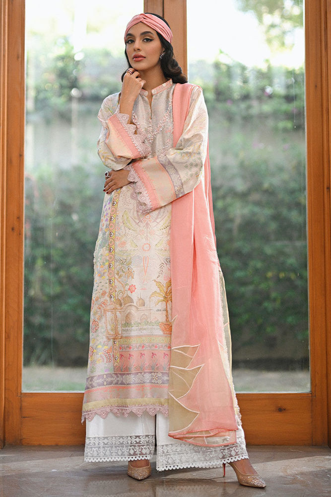 A refined ivory A-line shirt with a delicate digital print in hues of pink, purple, and yellow. The band collar is complemented by intricate applique work on the neckline, adorned with sequin, Moti, Cutdana, and pearl touches. Paired with wide-leg pants featuring an organza border, the ensemble is completed with an elegantly oversized floral applique on the dupatta.