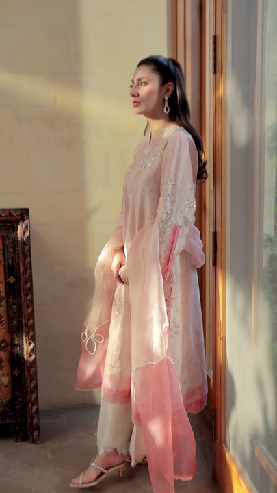 A refined pink raw silk long shirt, featuring a hand-embellished neckline with ivory embroidery, delicate pearls, tikki stones, and sequins. The design is elevated with bell sleeves, a slit detail, and an intricately cutwork hem. Paired with white culottes and a color-block organza dupatta, adorned with delicate cutwork.
