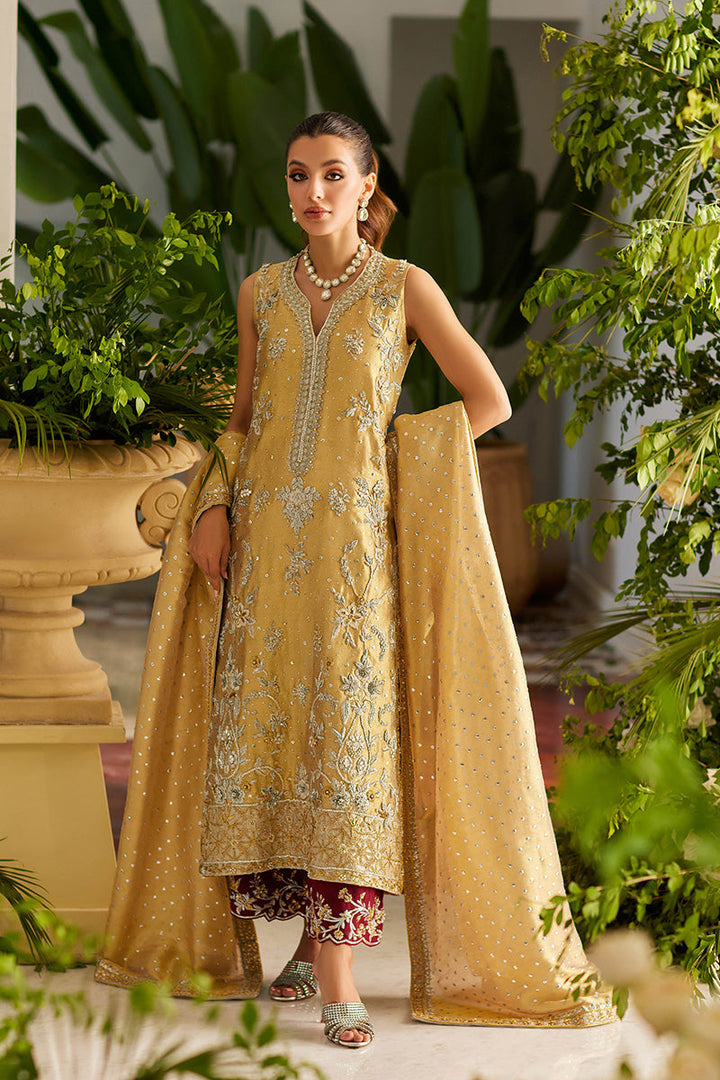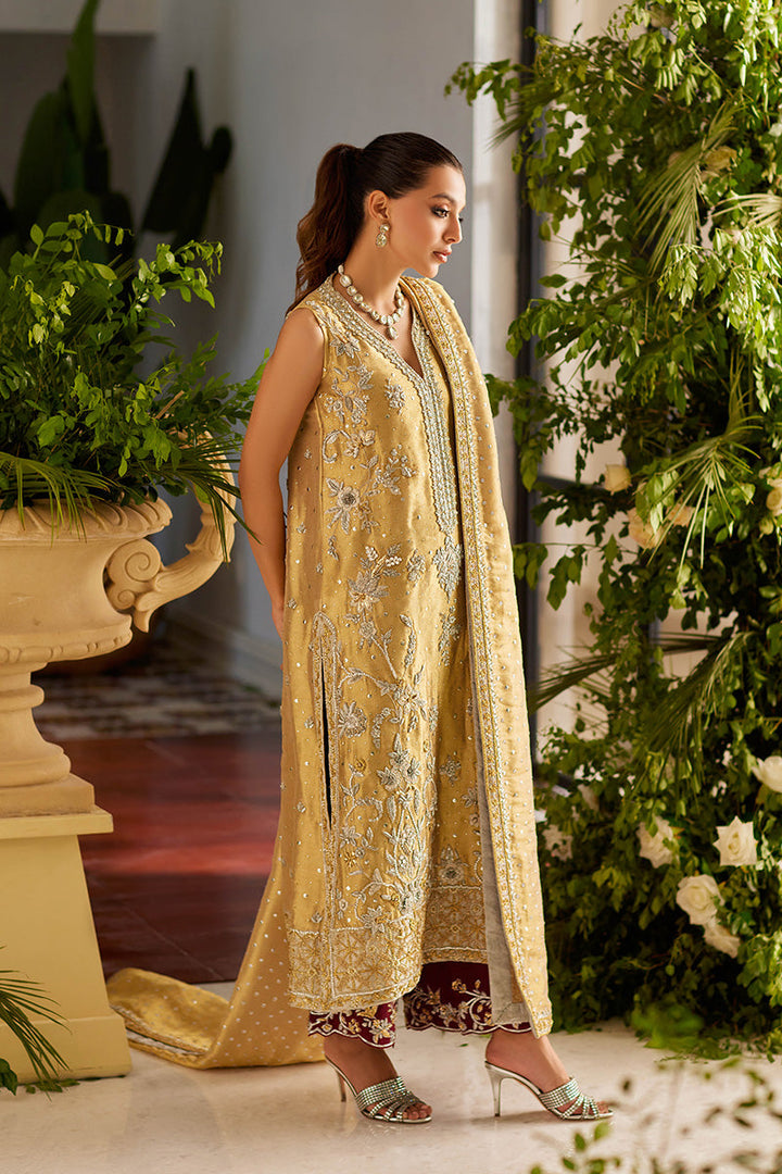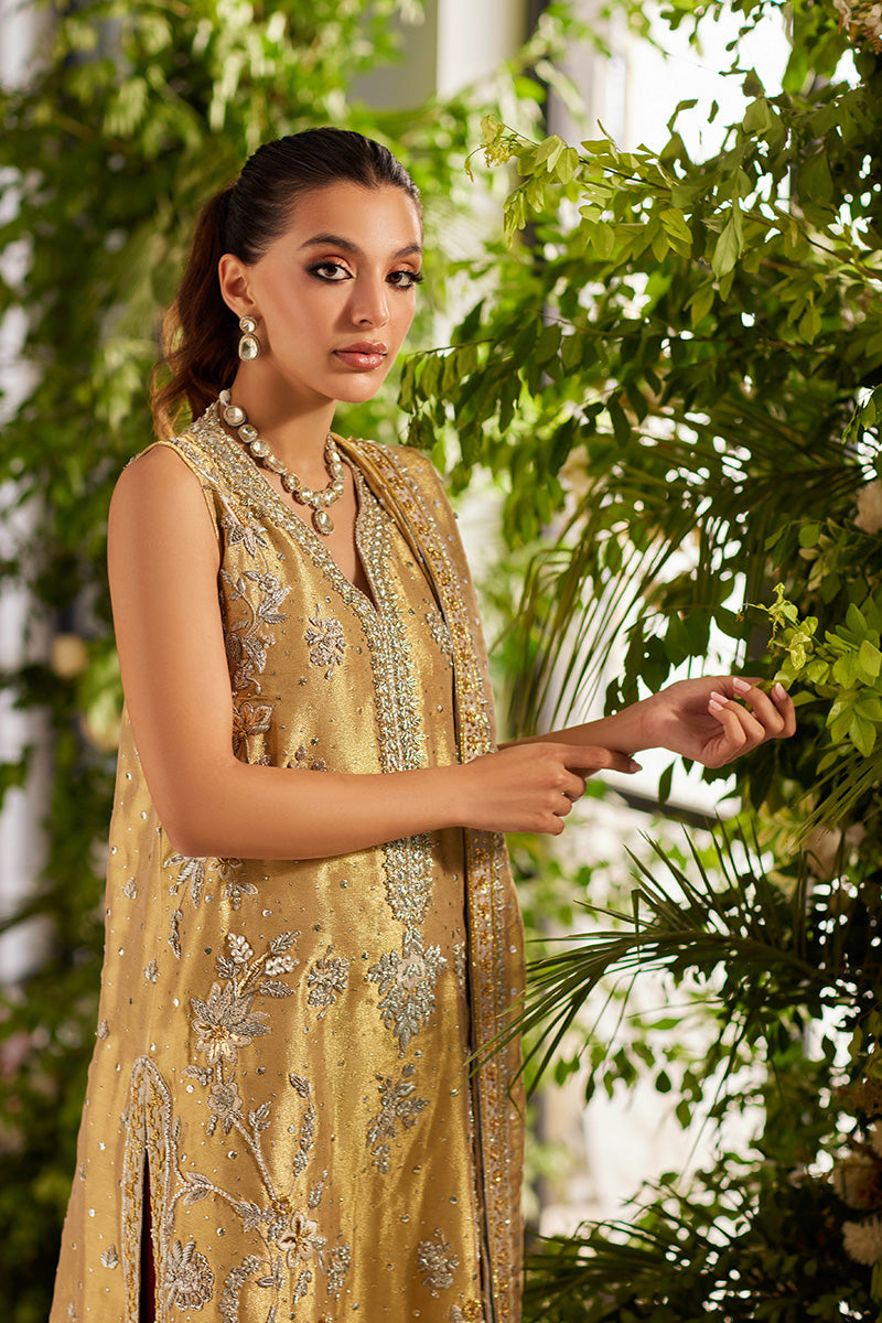 Stun in this gold straight shirt. Carefully crafted using mukesh, dabka, nakshi and zardozi kaam on the shirt and contrasting pants, this outfit glitters and shines. The outfit is completed with a matching dupatta.