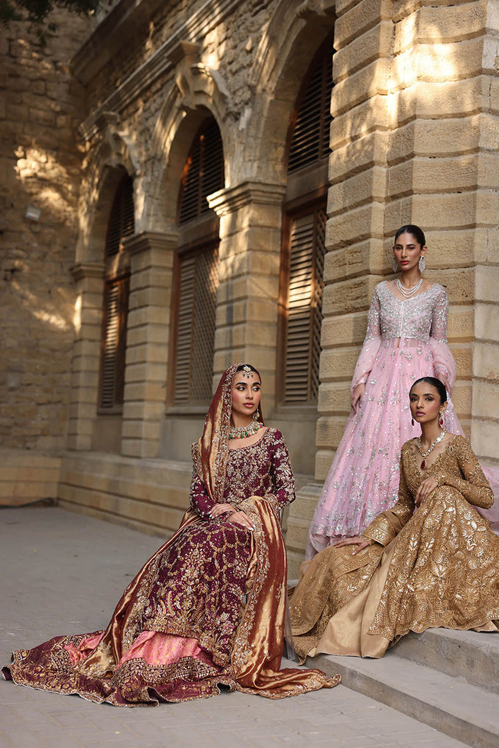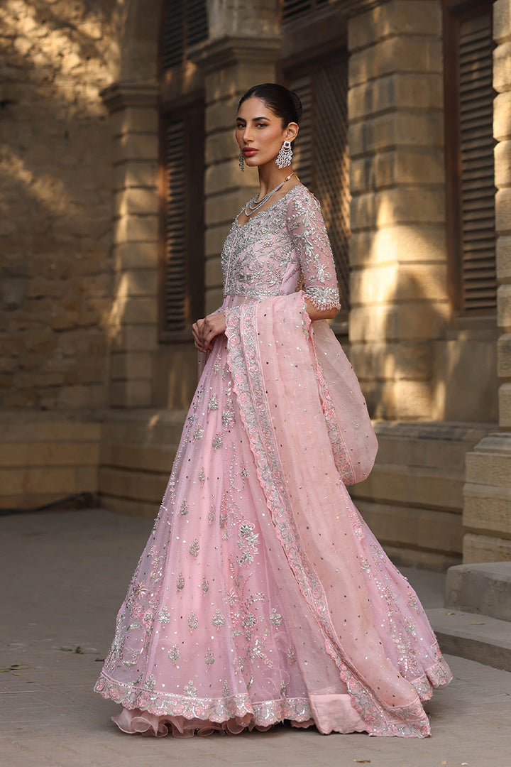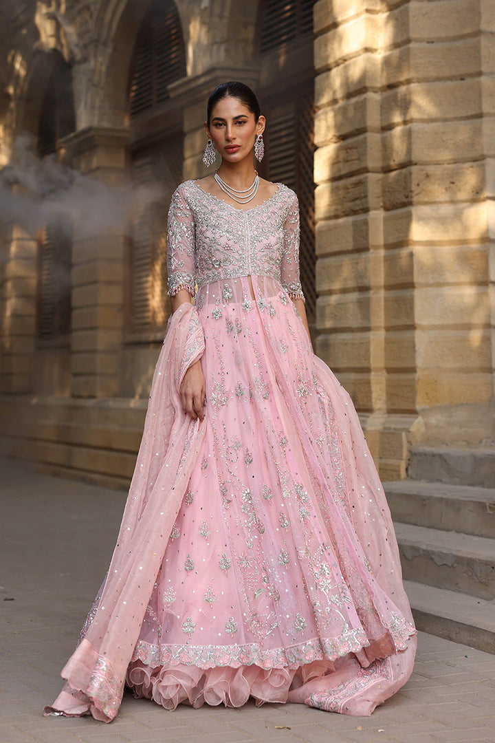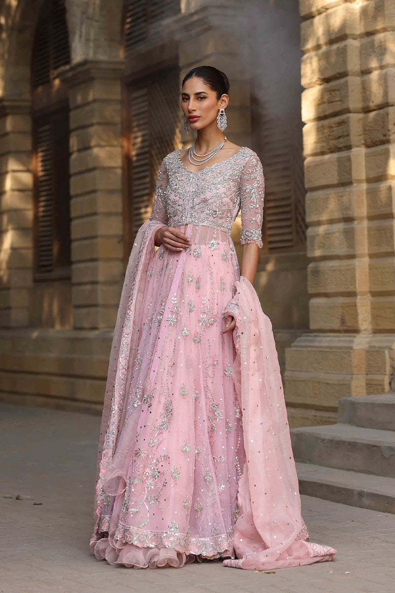 Look pretty in pink in this classic Mina Hasan pishwaas. Made in subtle pink, the outfit features dabka, nakshi, zardozi and pearl kaam throughout the outfit.Â