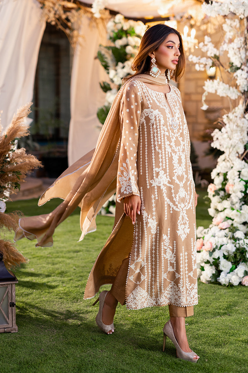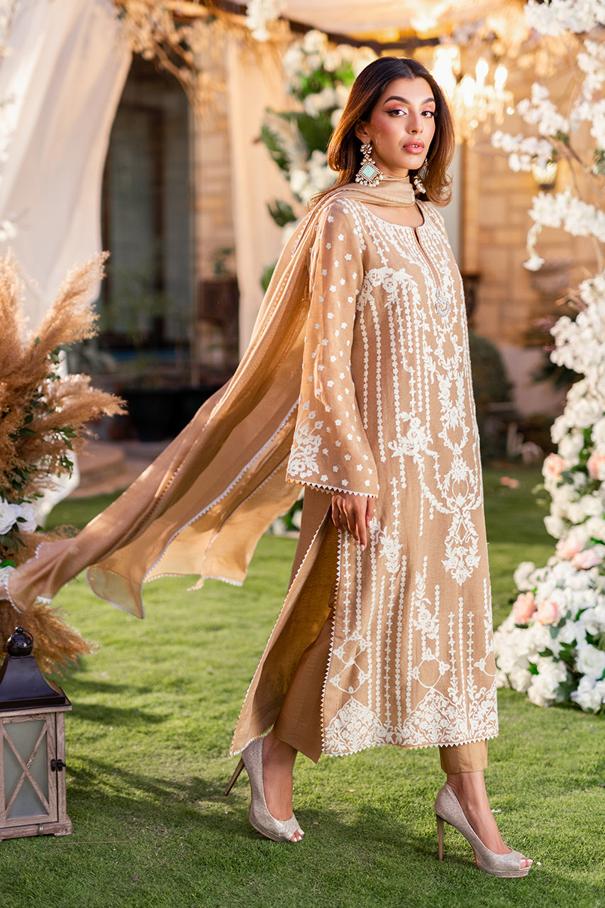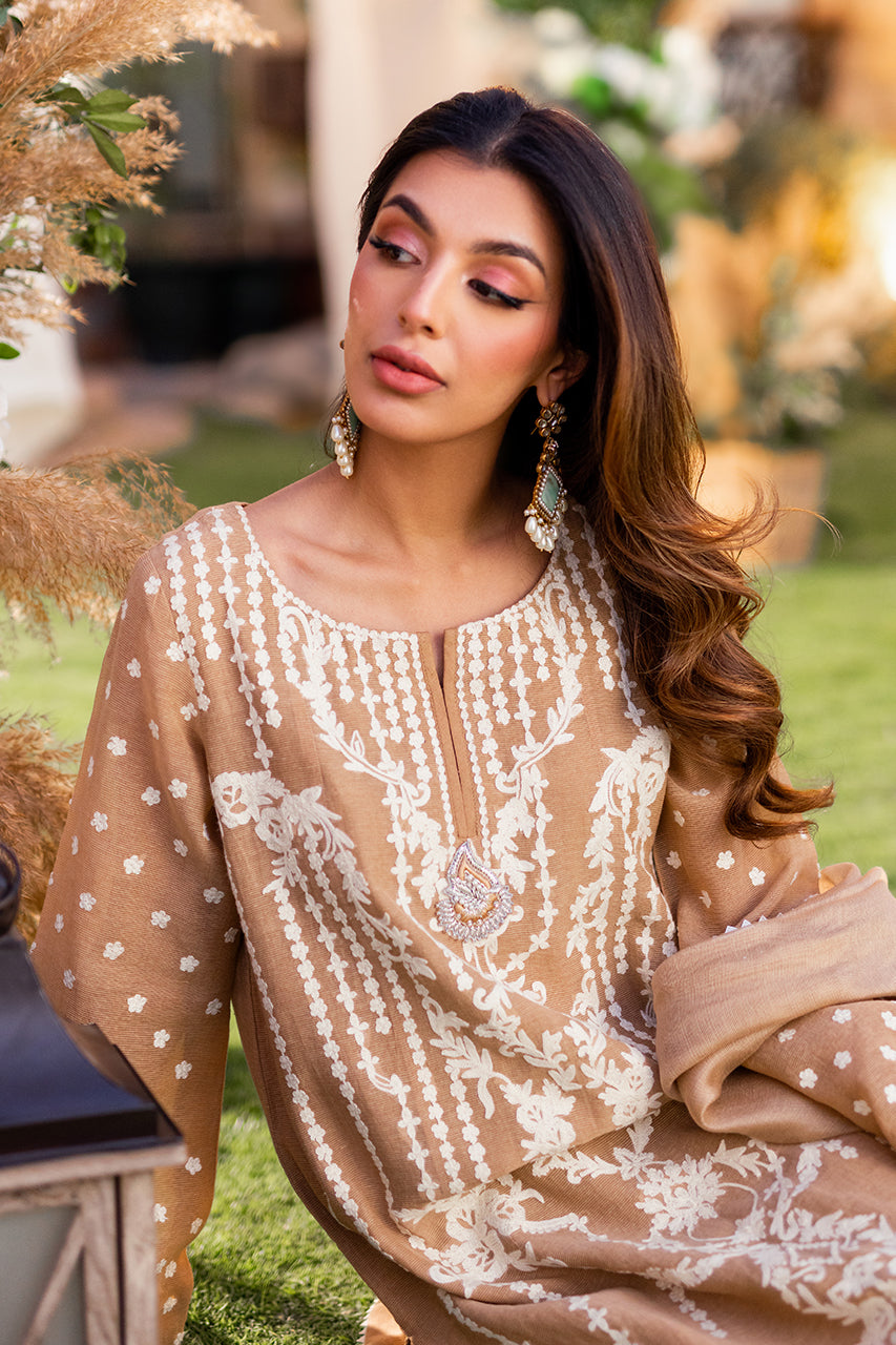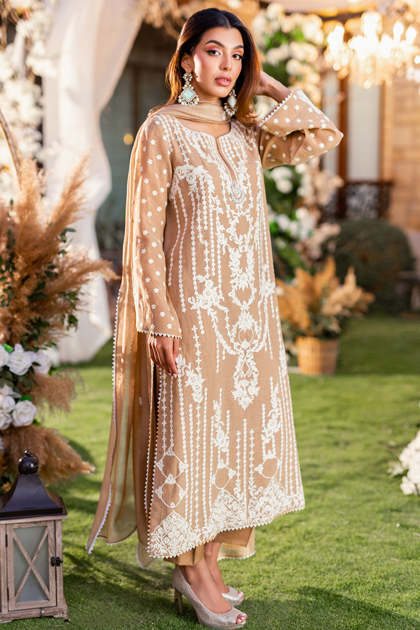 Introducing our luxurious khaddi shirt, meticulously crafted with intricate Ari embroidery on both the front and back panels. Enhanced by a captivating two-tone namak para lace, it exudes timeless elegance and sophistication. Paired effortlessly with raw silk trousers and an embroidered khaddi net dupatta, this ensemble epitomizes refined style.Â