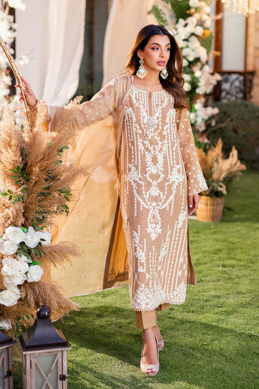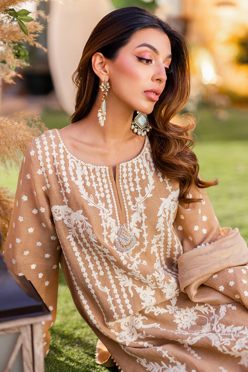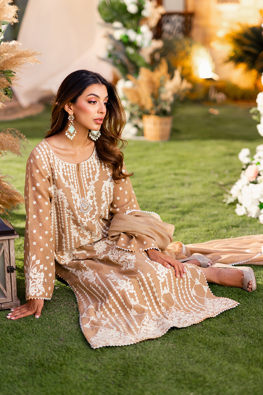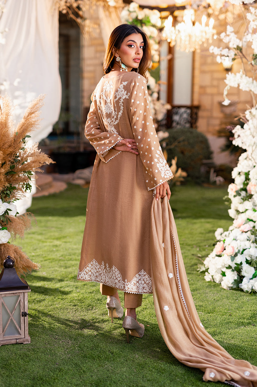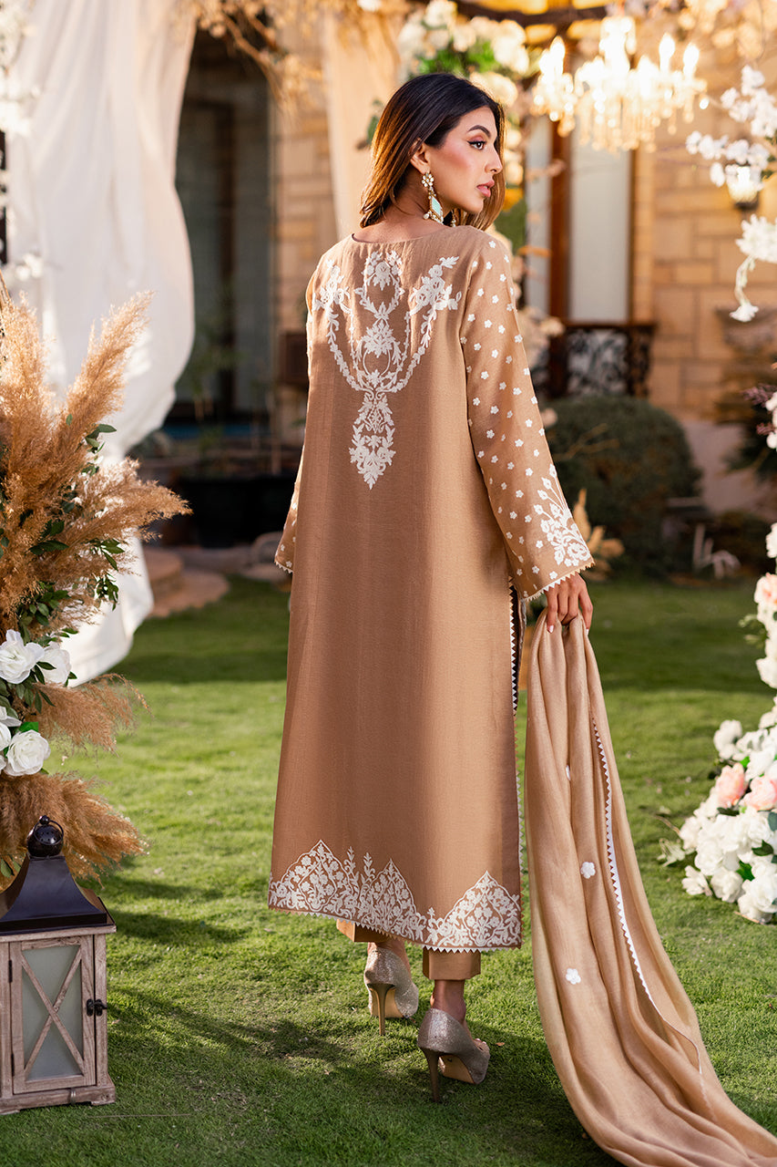 Introducing our luxurious khaddi shirt, meticulously crafted with intricate Ari embroidery on both the front and back panels. Enhanced by a captivating two-tone namak para lace, it exudes timeless elegance and sophistication. Paired effortlessly with raw silk trousers and an embroidered khaddi net dupatta, this ensemble epitomizes refined style.Â