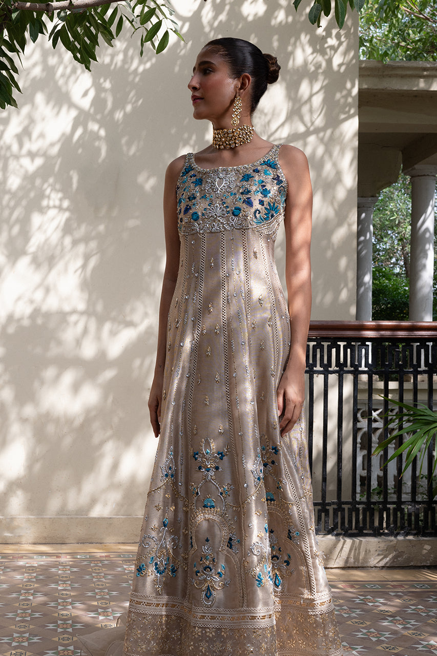 A canvas of intricate and scintillating details, this gold meysuri peshwas redefines royalty. Intricate crasftsmanship in zardozi and resham along the neckline and daaman is beautifully balanced with an all gold gotta border along the daaman. A striking blue chunri dupatta embellished with kaamdaani adds to the exuberance of this traditional baraat/mehndi look! Complete the look with a statement organza lengha for head turning grandeur!