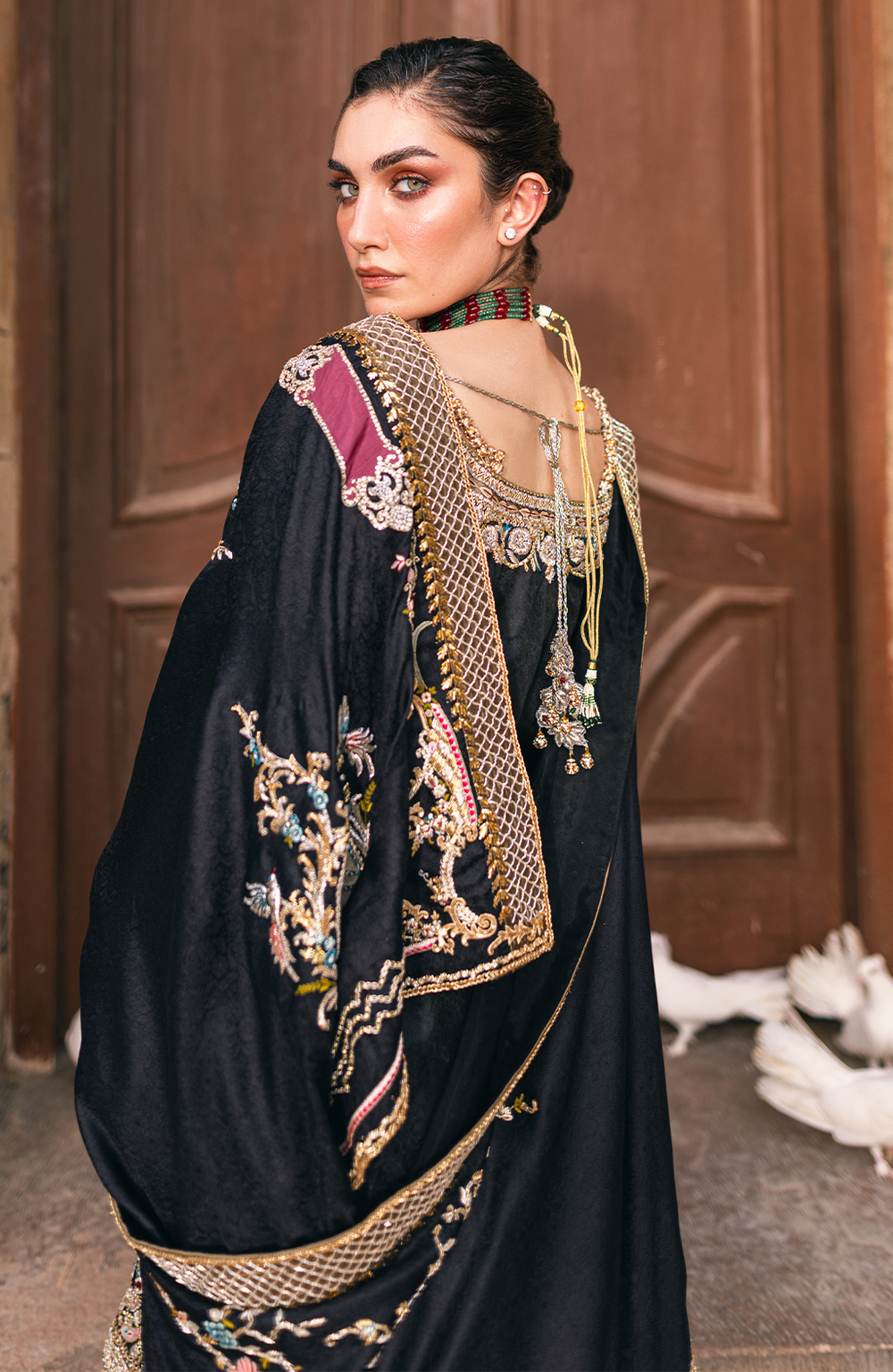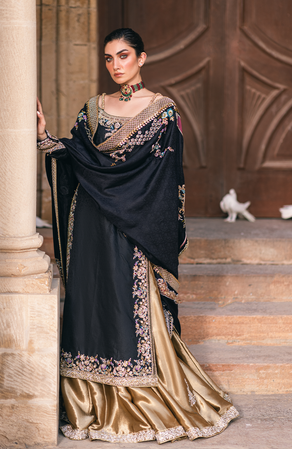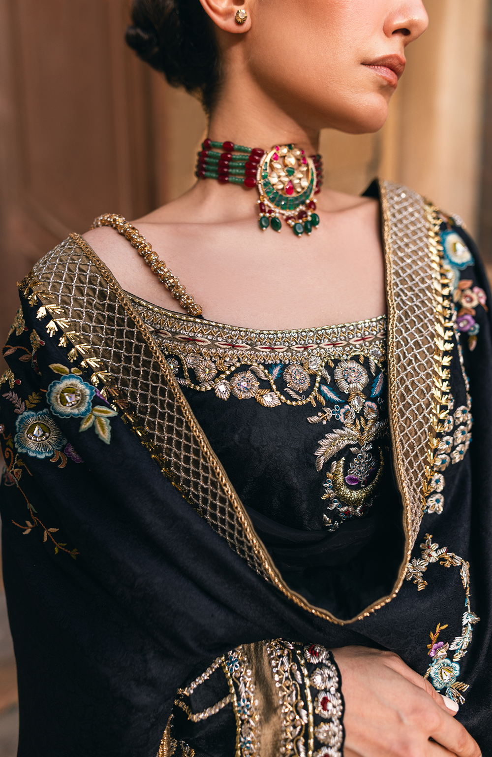 Add richness to your festivities with our black self-jamawaar shawl outfit. Infused with naqshi, resham, kamdaani and other handcrafted techniques. Chandni is a marvel of artistry that adds elegance and makes it a complete royal dream this festive season. One can never go wrong with a black outfit for any event!