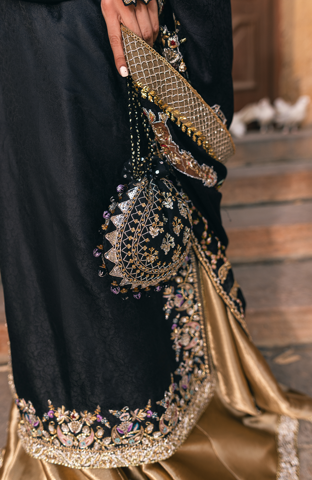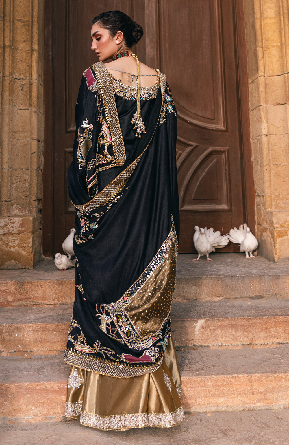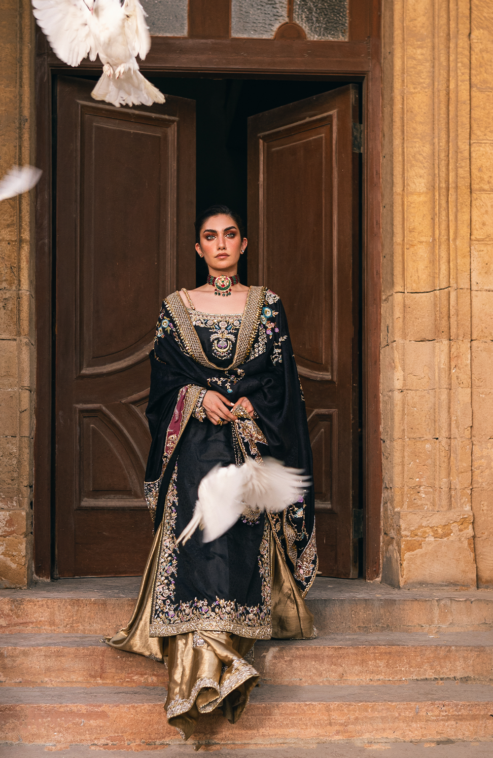 Add richness to your festivities with our black self-jamawaar shawl outfit. Infused with naqshi, resham, kamdaani and other handcrafted techniques. Chandni is a marvel of artistry that adds elegance and makes it a complete royal dream this festive season. One can never go wrong with a black outfit for any event!