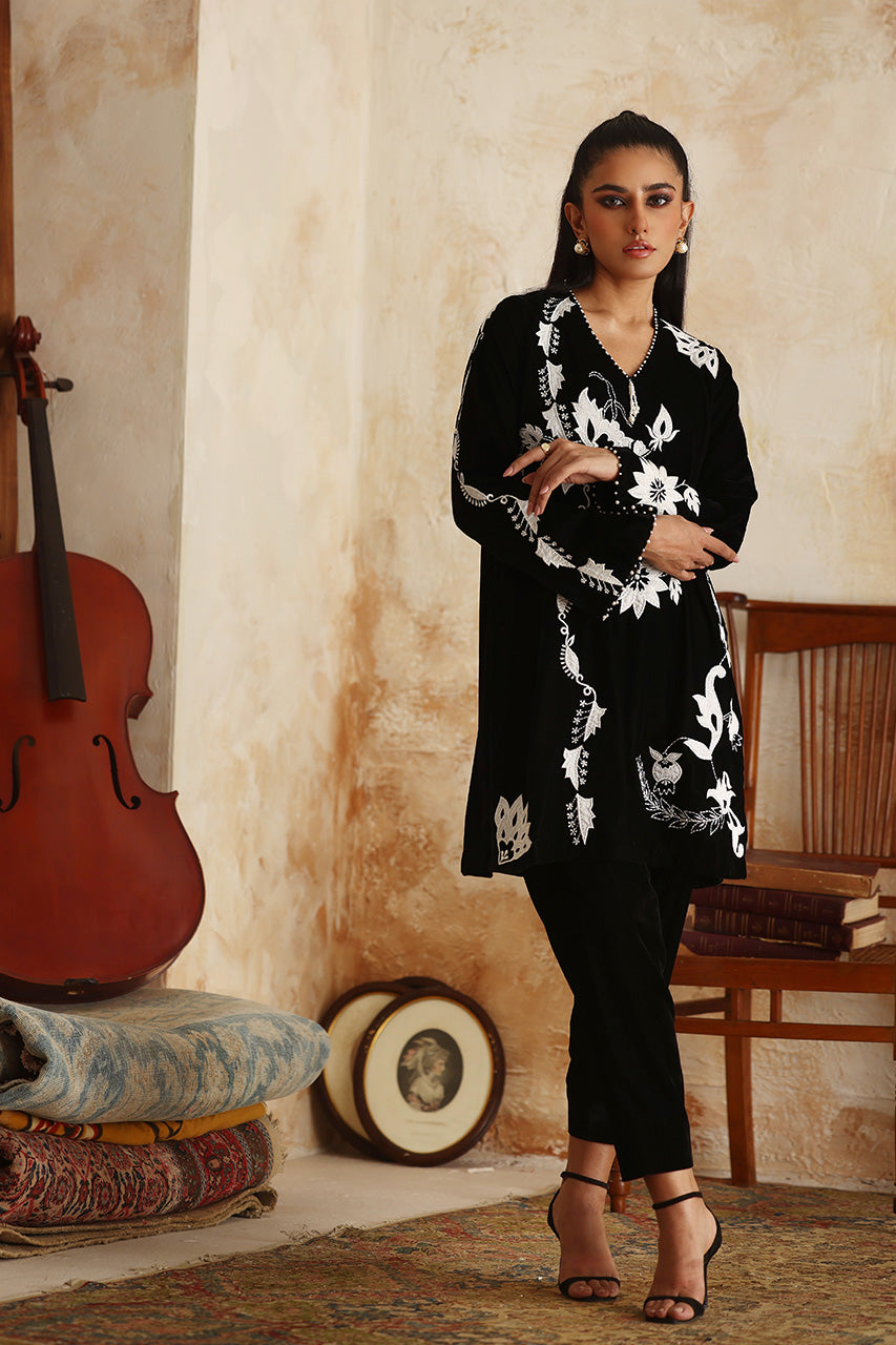 Cut from opulent black velvet, this relaxed silhouette features rich appliques in contrasting ivory along with resham embroideries. The design stands out with complimentary embroideries on the sleeves & finished...