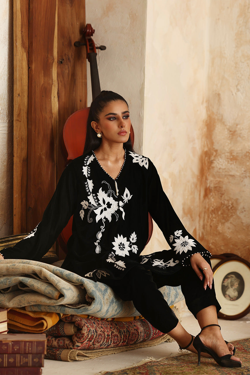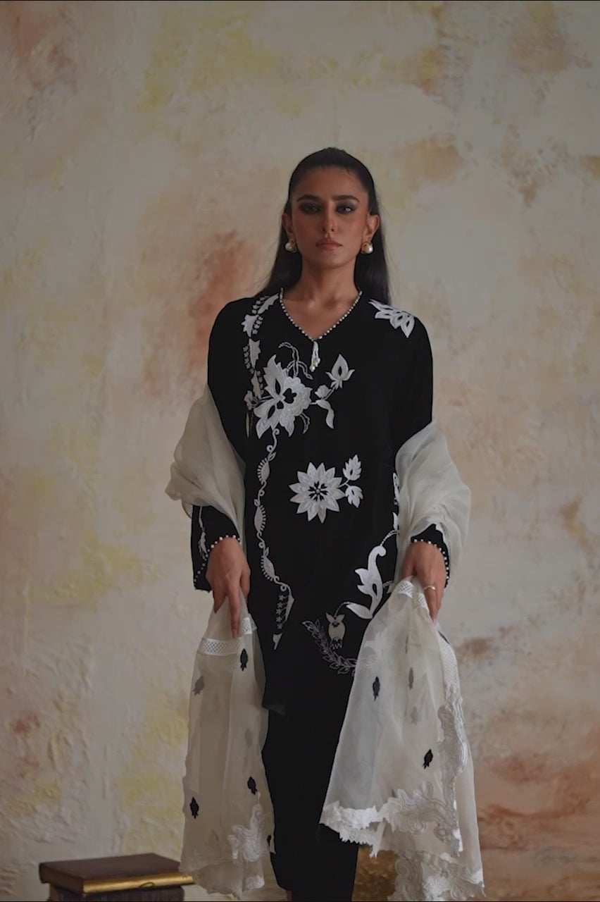 Cut from opulent black velvet, this relaxed silhouette features rich appliques in contrasting ivory along with resham embroideries. The design stands out with complimentary embroideries on the sleeves & finished with pearl. It is paired with a tapered shalwar pant and ivory dupatta replete with laces.