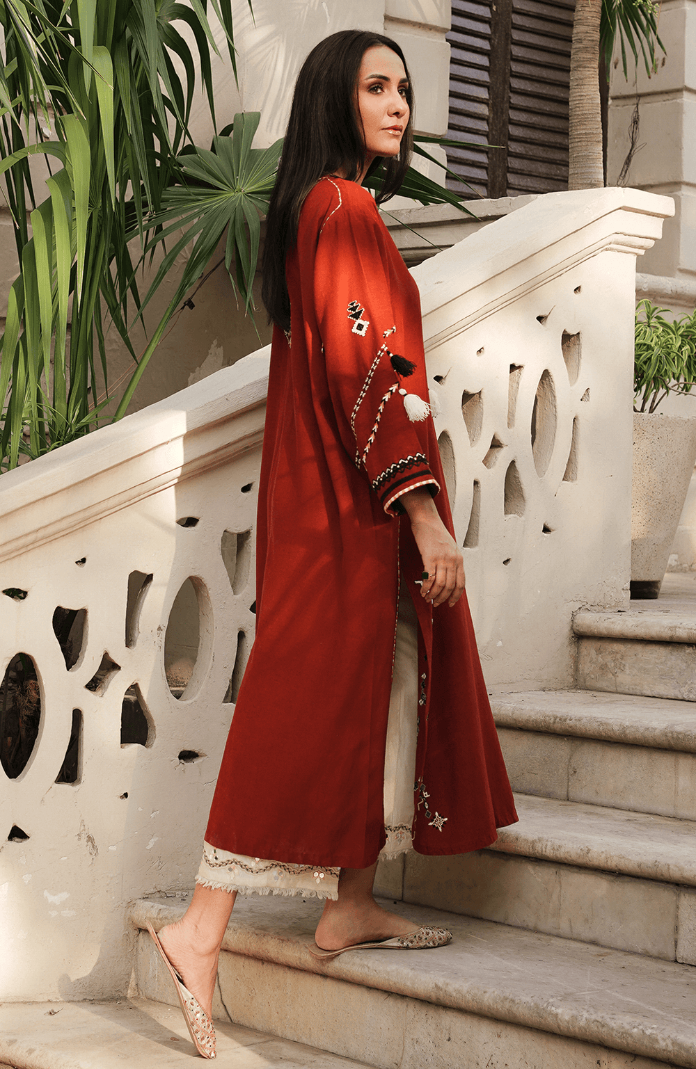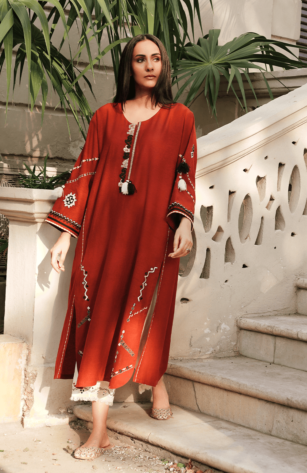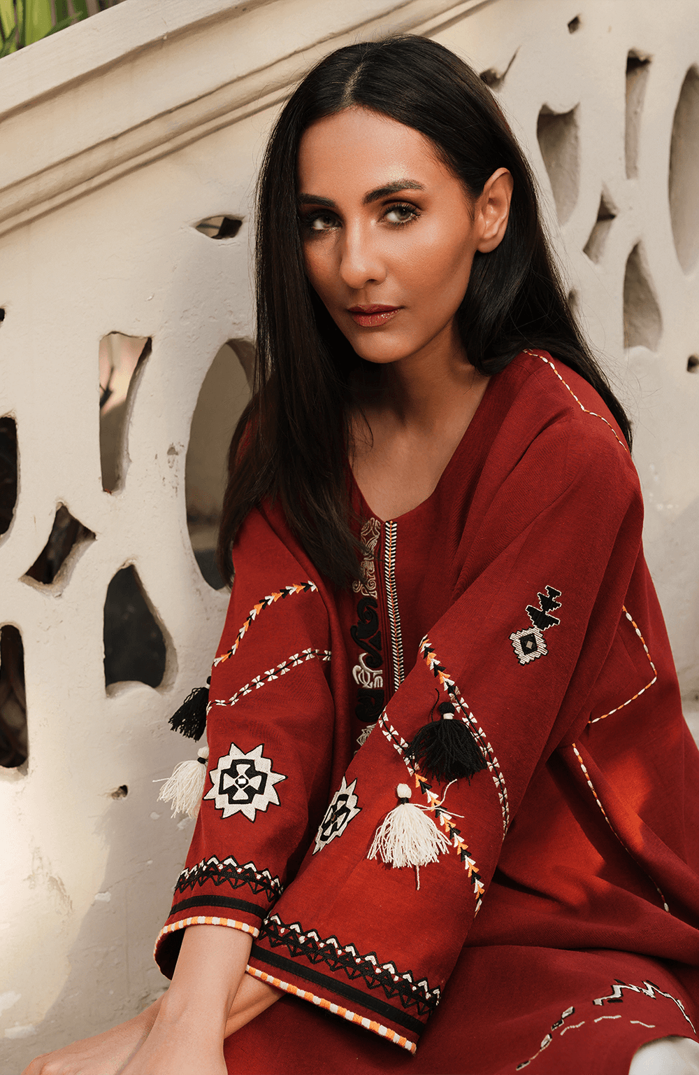 Cinnamon Stick, a modern cut infused with running stitches, mirror work, and encapsulated with aari work, adds an ethnic feel to the outfit. This silhouette consists of different embroidery techniques, like resham work and applique, completing the look with woolen tassels.
