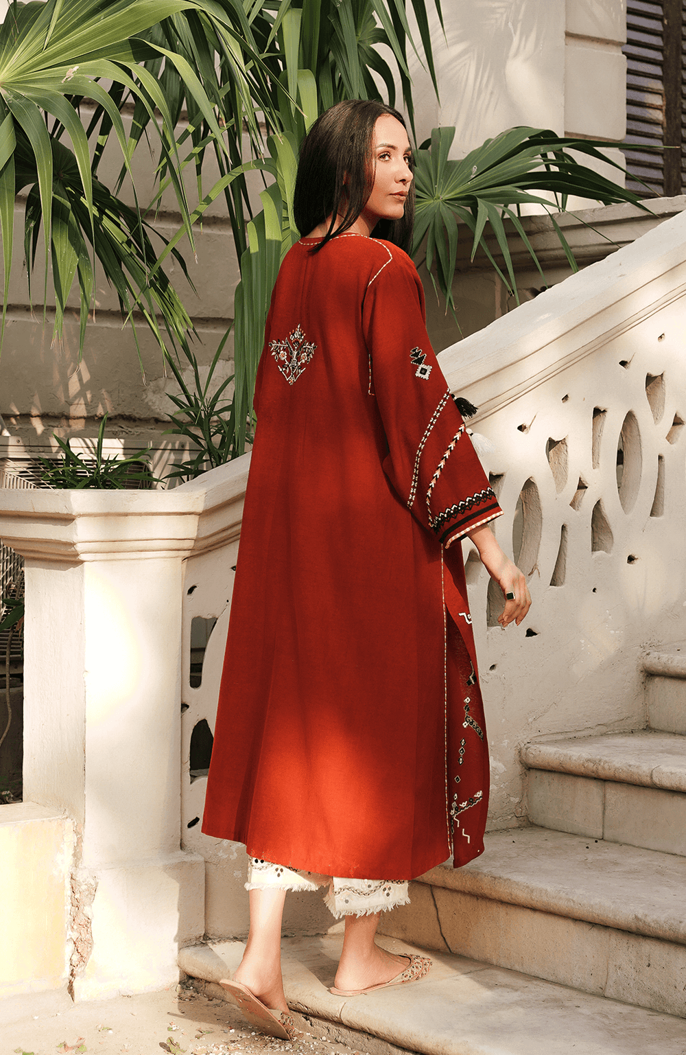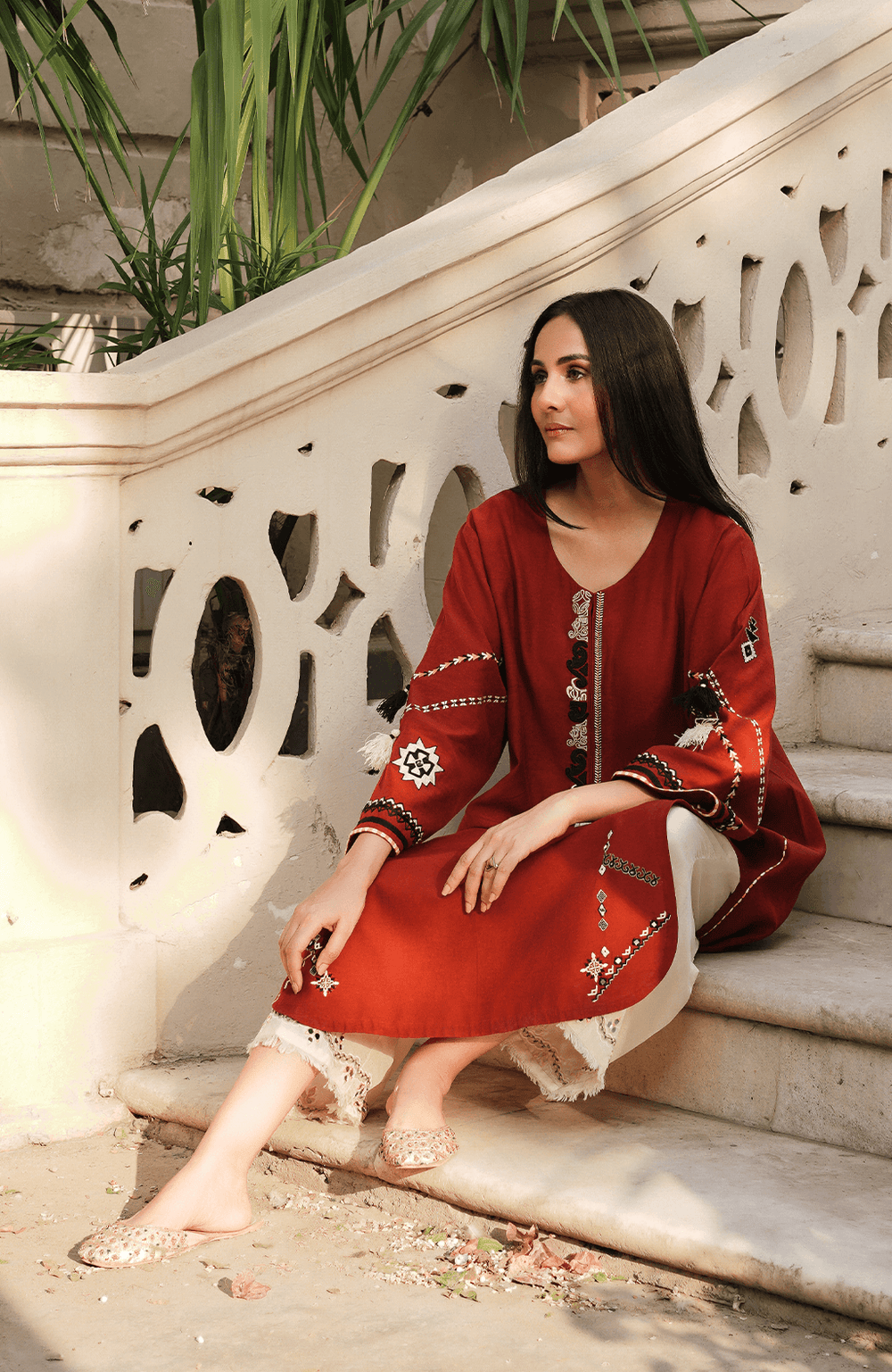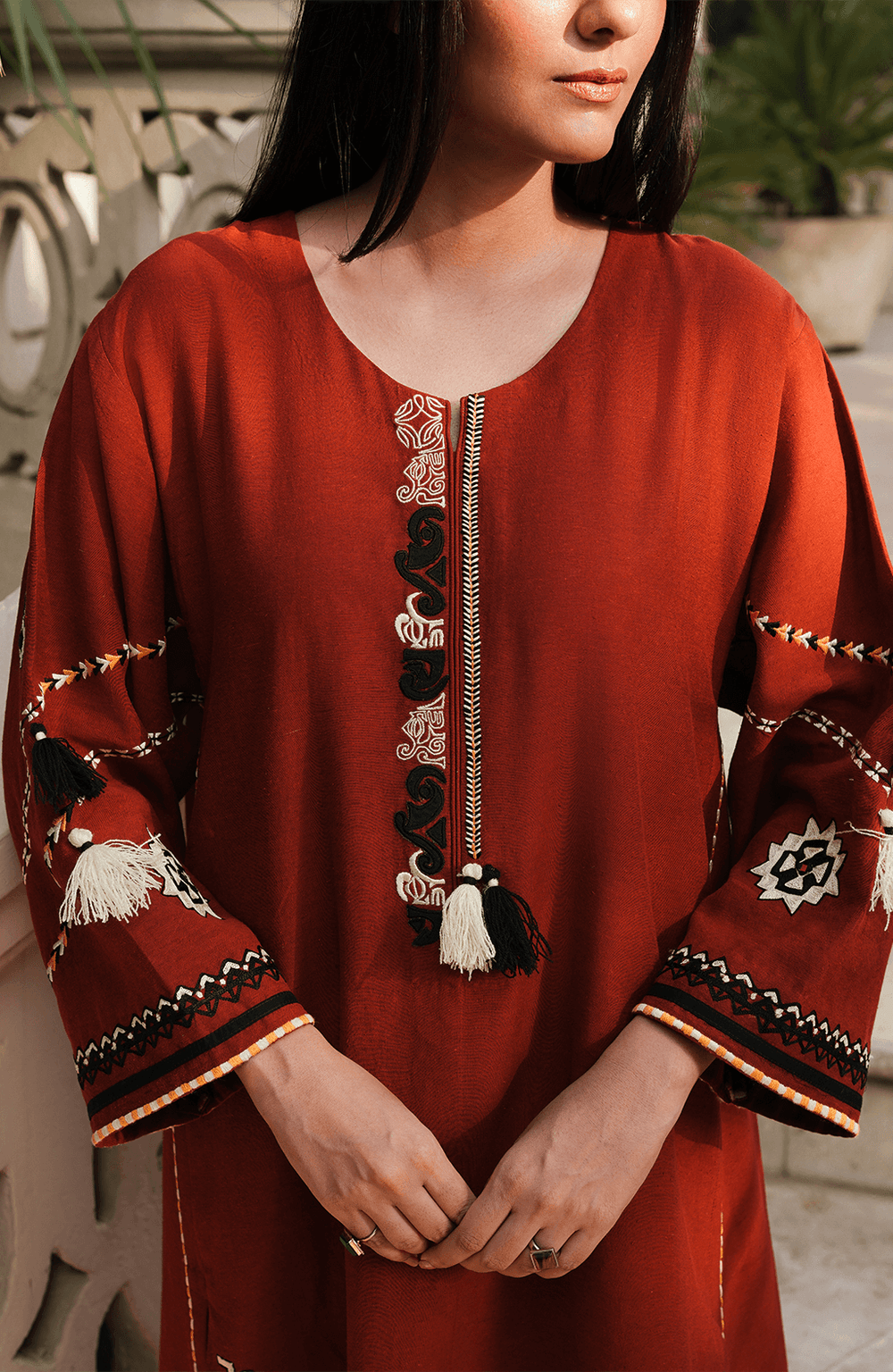 Cinnamon Stick, a modern cut infused with running stitches, mirror work, and encapsulated with aari work, adds an ethnic feel to the outfit. This silhouette consists of different embroidery techniques, like resham work and applique, completing the look with woolen tassels.