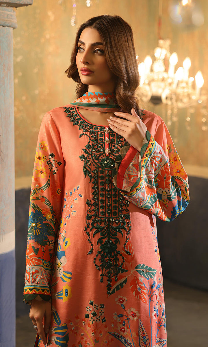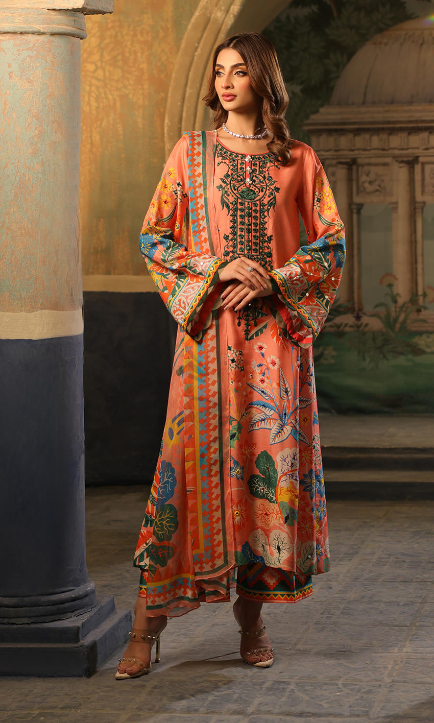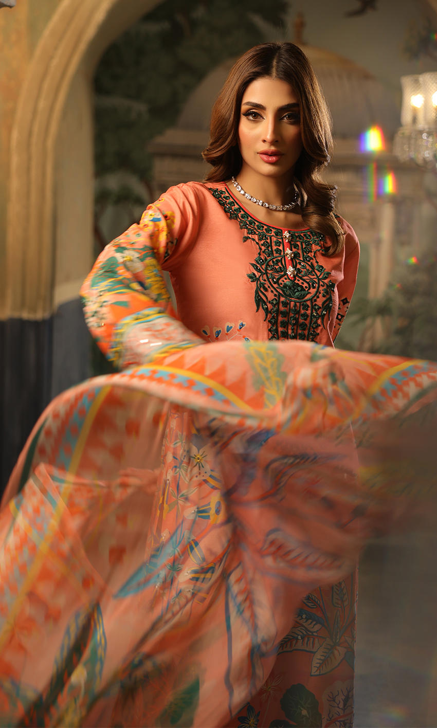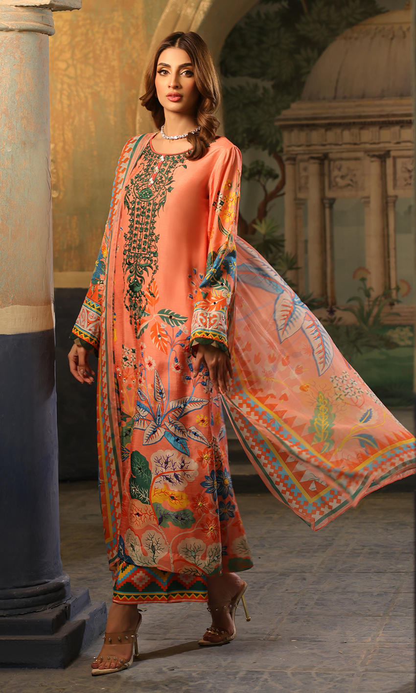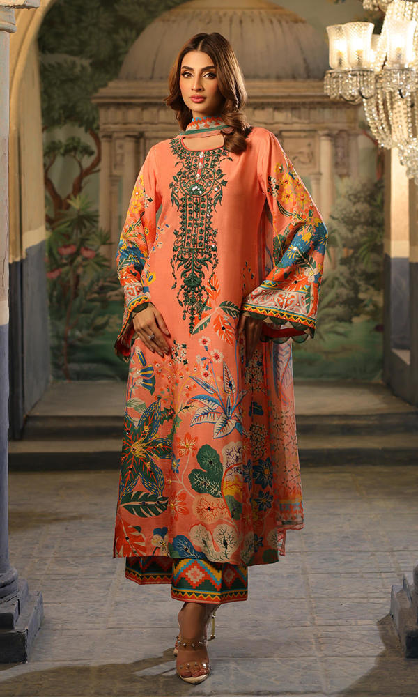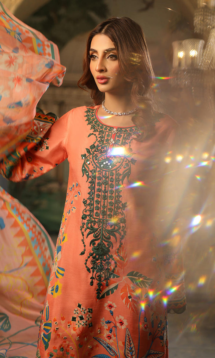 This shirt is meticulously adorned with an embroidered neckline featuring intricate mirror work all over. It is paired seamlessly with printed pants and a delicate silk dupatta.