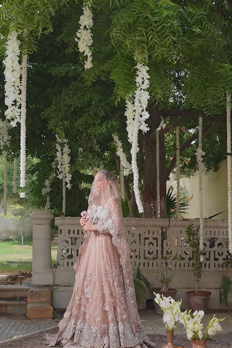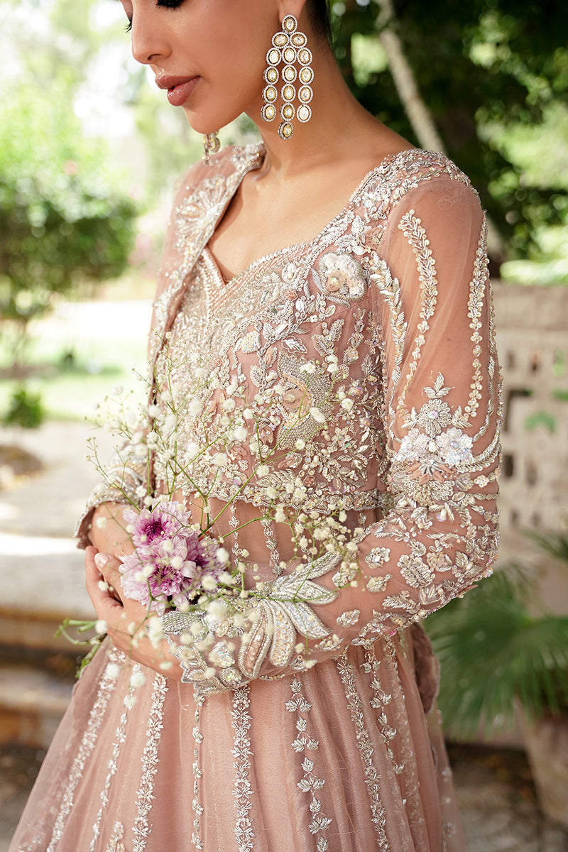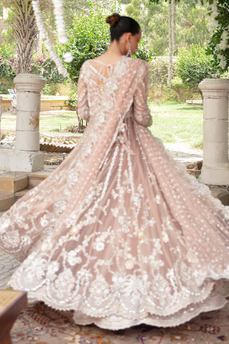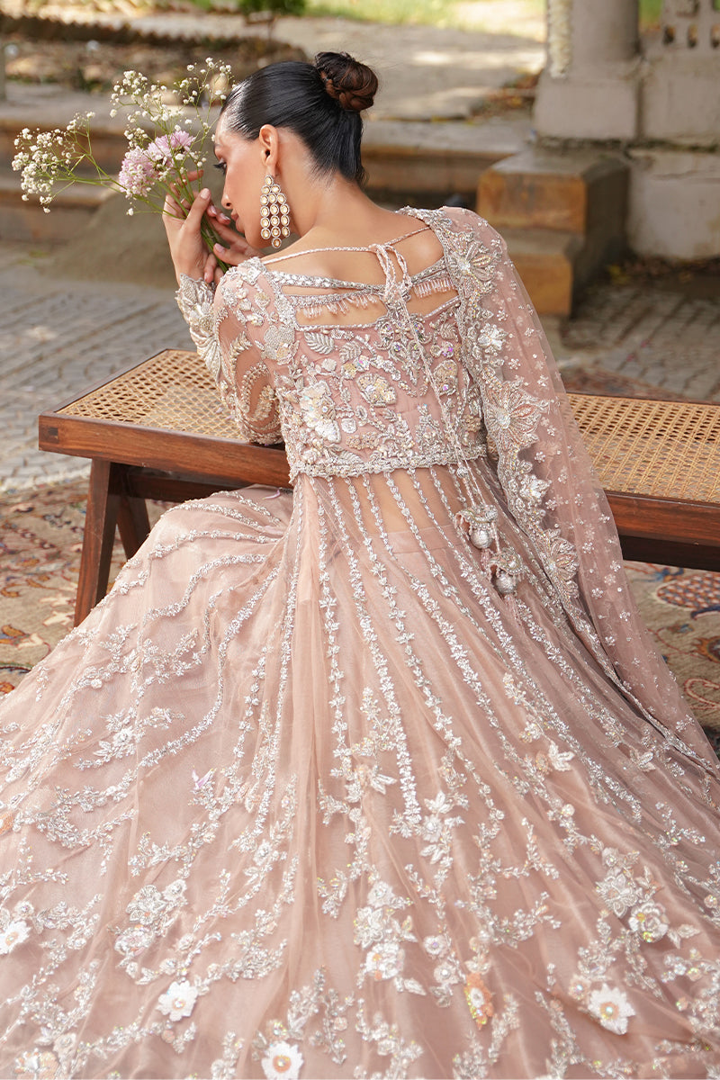 A coral pink festive shade, handcrafted with artisanal embellishments and detailed sequence work. This gown is decorated with kora, dabka, zardozi, and resham embroidery. The necklines are adorned with crystals...