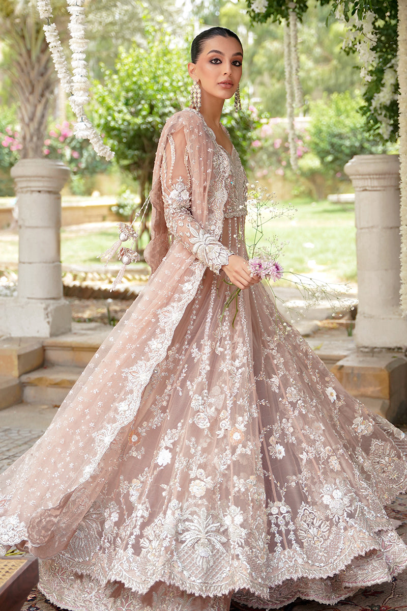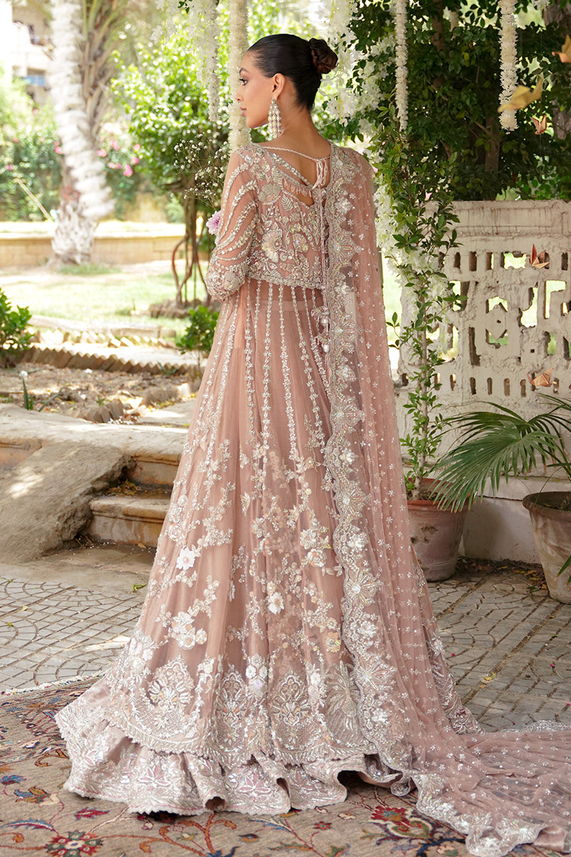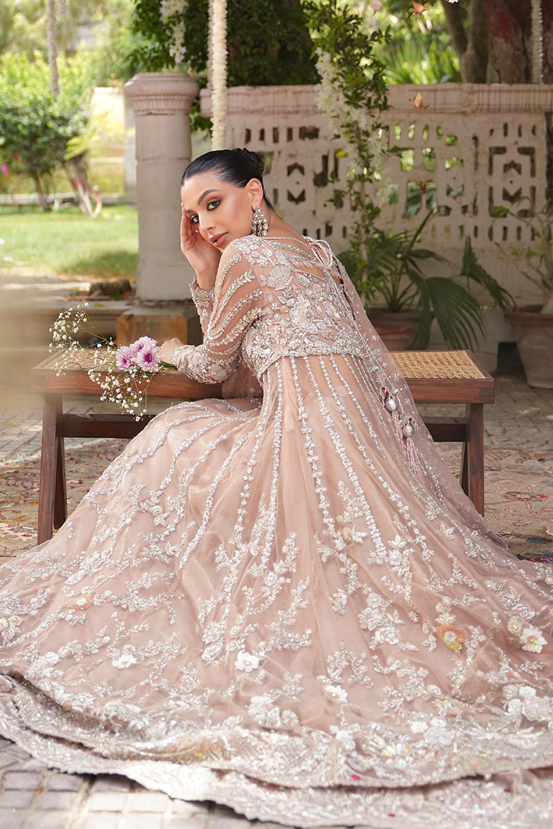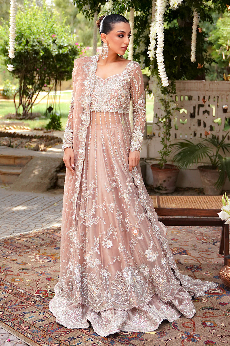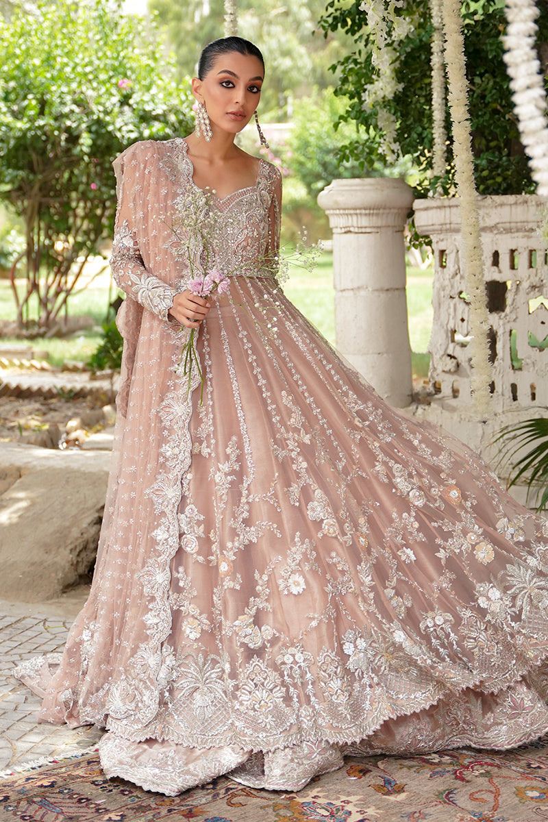 A coral pink festive shade, handcrafted with artisanal embellishments and detailed sequence work. This gown is decorated with kora, dabka, zardozi, and resham embroidery. The necklines are adorned with crystals...