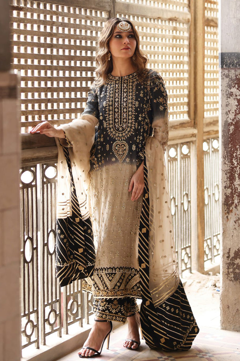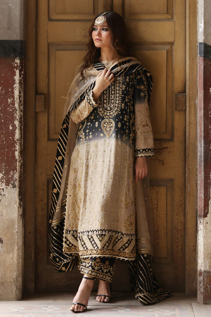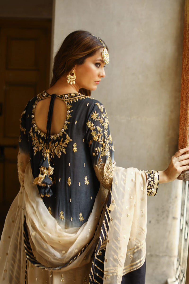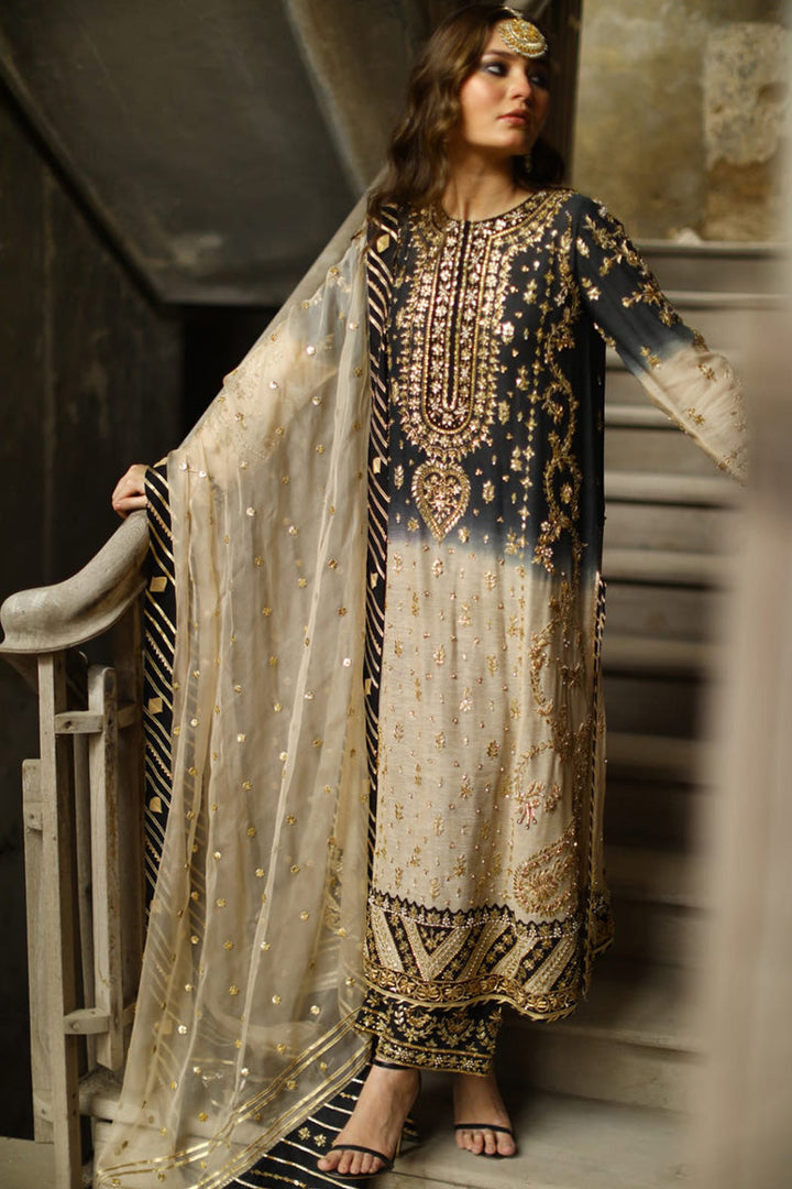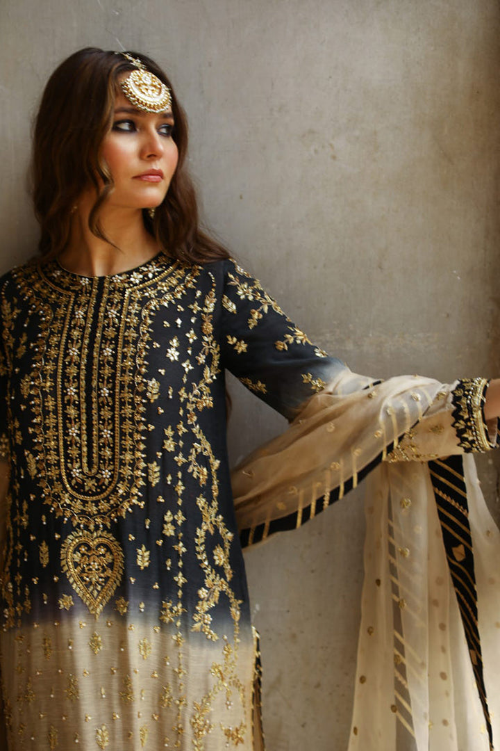 Shine bright in this ombre wonder! This straight shirt silhouette features long neckline that is adorned by delicate floral details featuring gold kaam. The body features a chhan shaped like...
