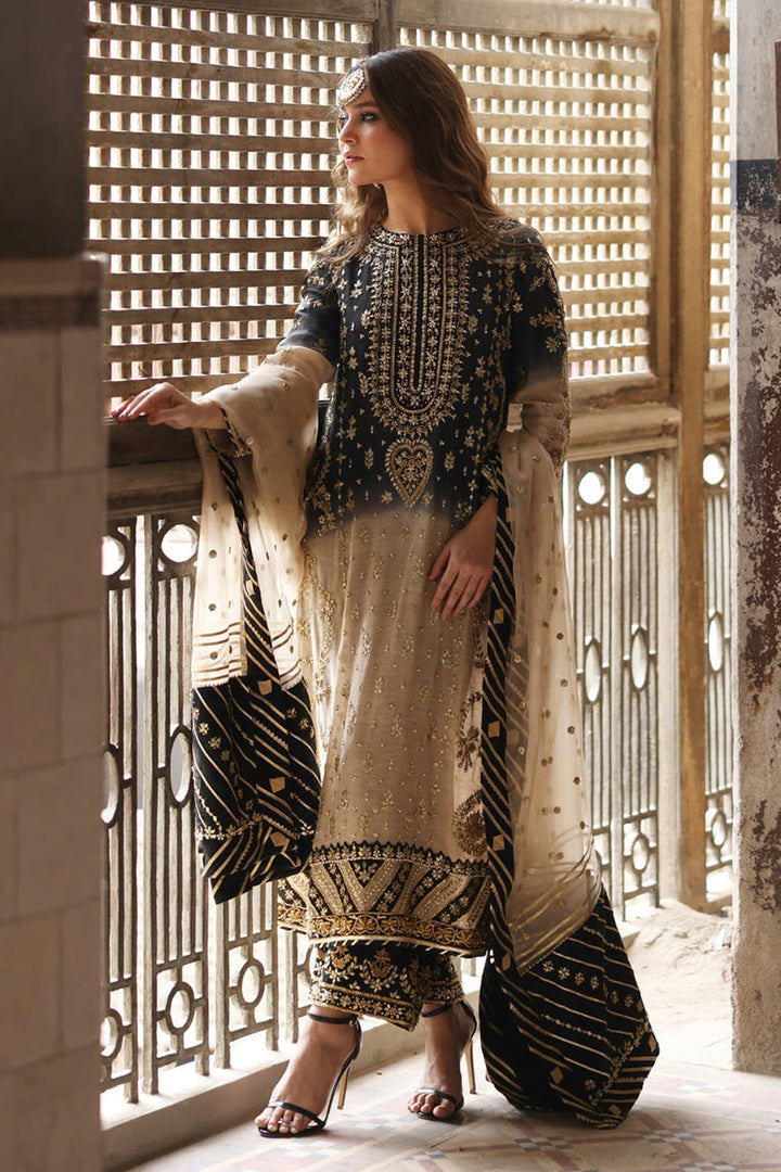 Shine bright in this ombre wonder! This straight shirt silhouette features long neckline that is adorned by delicate floral details featuring gold kaam. The body features a chhan shaped like flowers. The outfit is completed with a striped border and pants with complementary floral kaam.