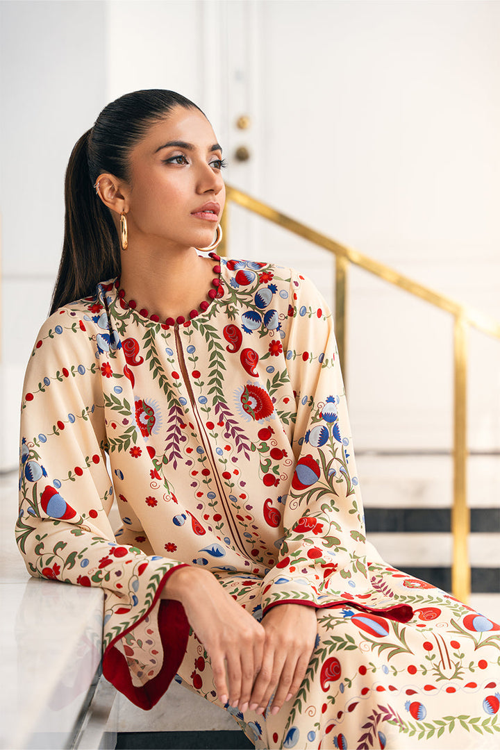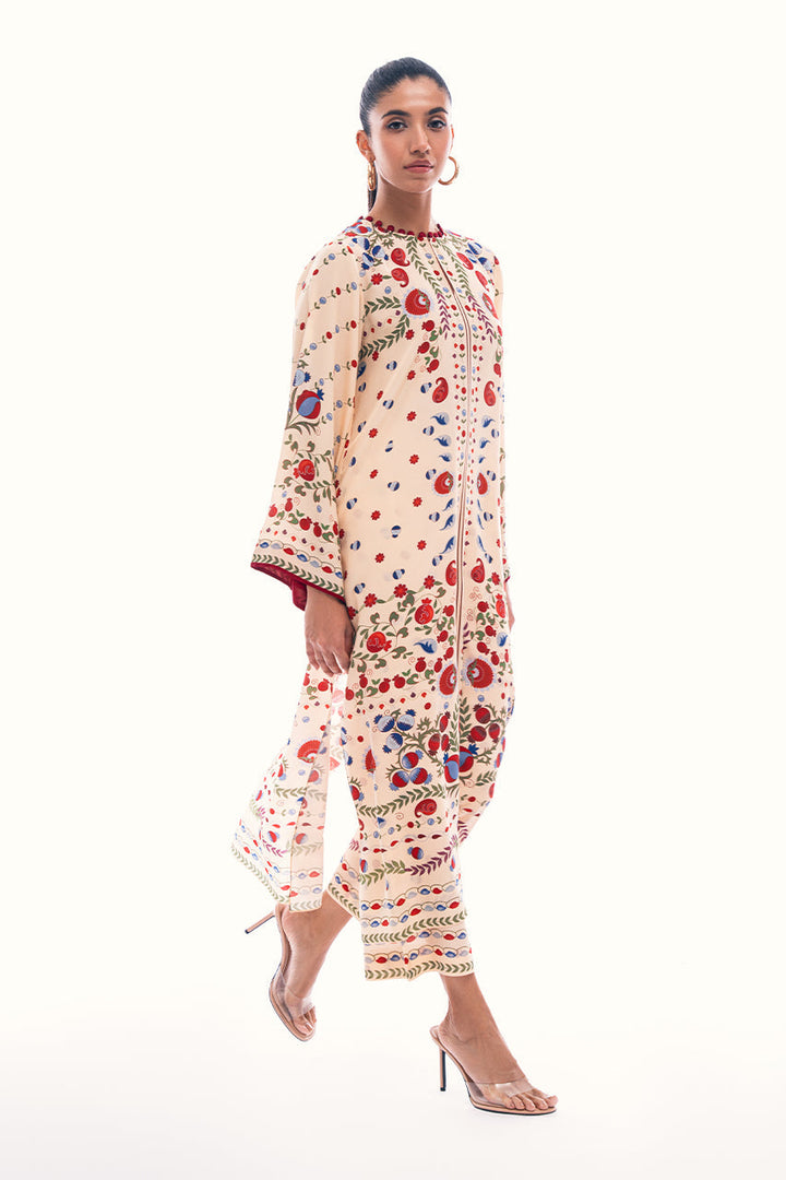 A long tunic cut from cream coloured crepe is artfully rendered with a playful print featuring vibrant tones and fabric manipulated details and paired with printed culottes.