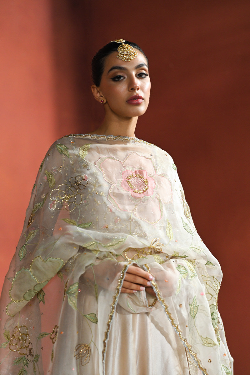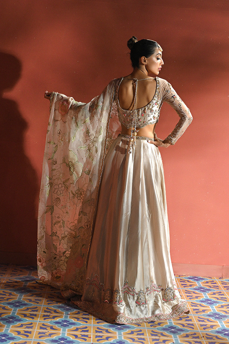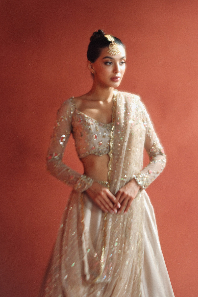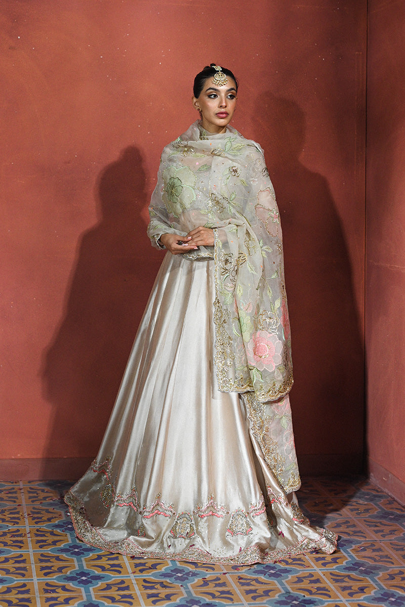 This elegant lehenga set features a pure sheesha silk blouse with Zardozi and kora dabka embroidery. The matching lehenga, also in pure sheesha silk, showcases similar embellishments with added kesham French knots. The set includes two dupattas: the first in organza with detailed applique work, sequence spray, hammer work, and scalloped edges, while the second is a net dupatta with a heavy spray and scalloped hem swirls. This ensemble blends traditional craftsmanship with modern elegance, perfect for any special occasion.