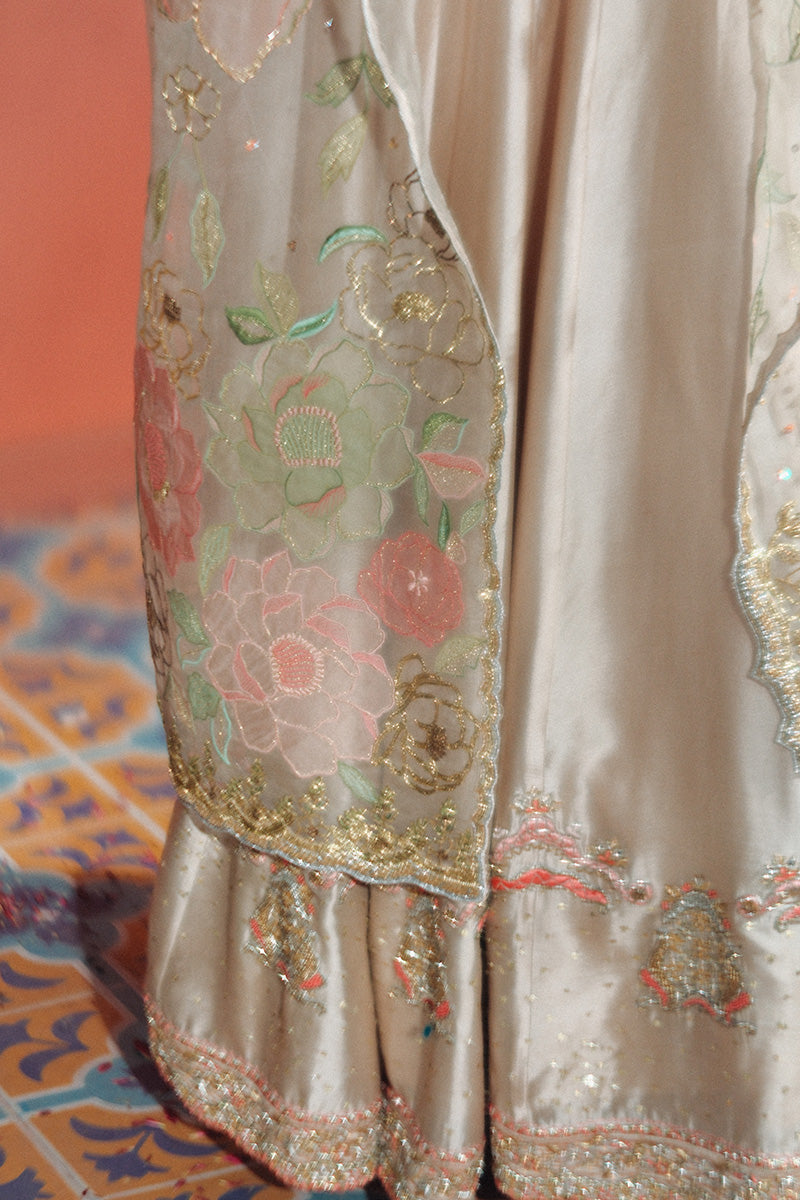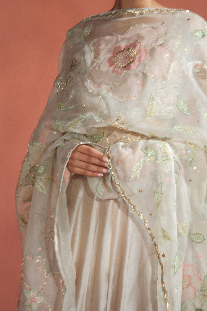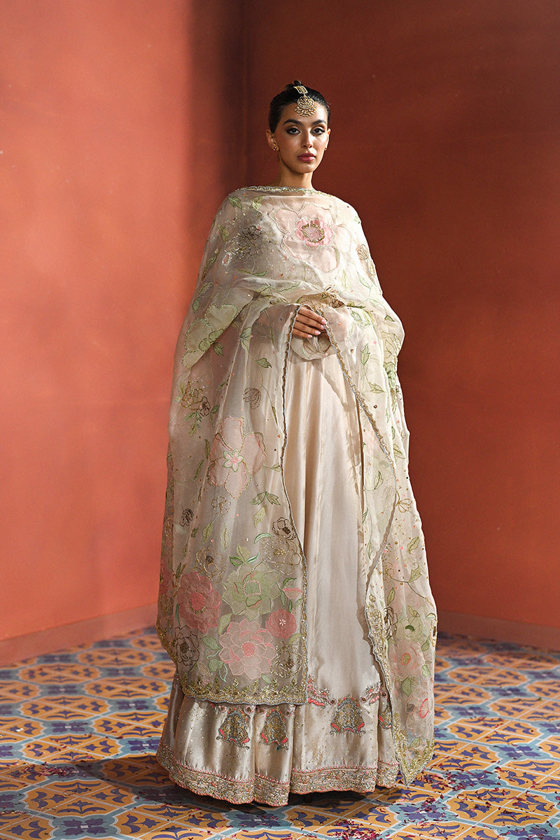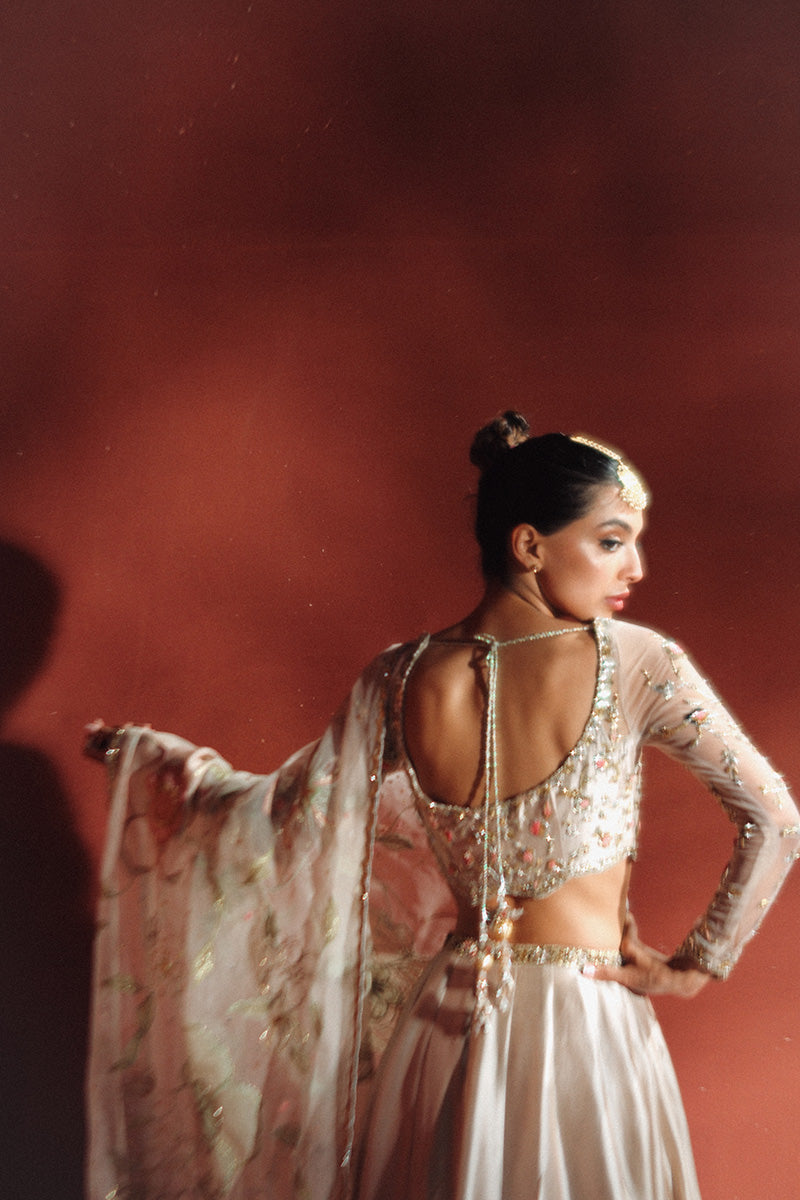 This elegant lehenga set features a pure sheesha silk blouse with Zardozi and kora dabka embroidery. The matching lehenga, also in pure sheesha silk, showcases similar embellishments with added kesham French knots. The set includes two dupattas: the first in organza with detailed applique work, sequence spray, hammer work, and scalloped edges, while the second is a net dupatta with a heavy spray and scalloped hem swirls. This ensemble blends traditional craftsmanship with modern elegance, perfect for any special occasion.