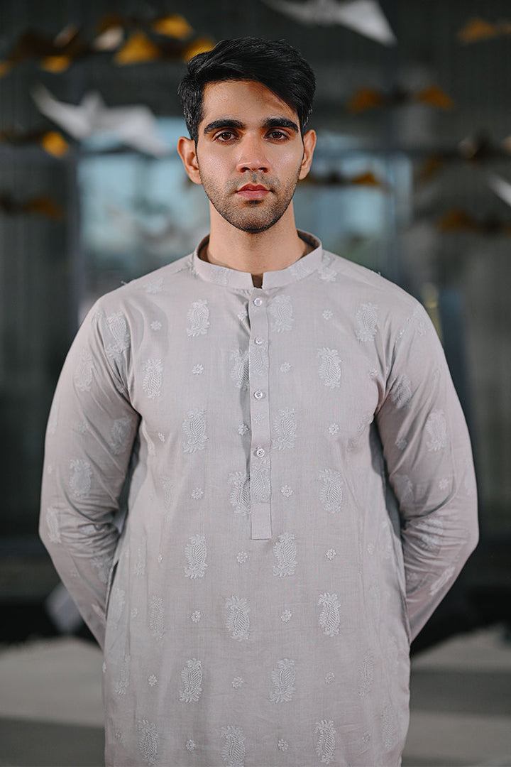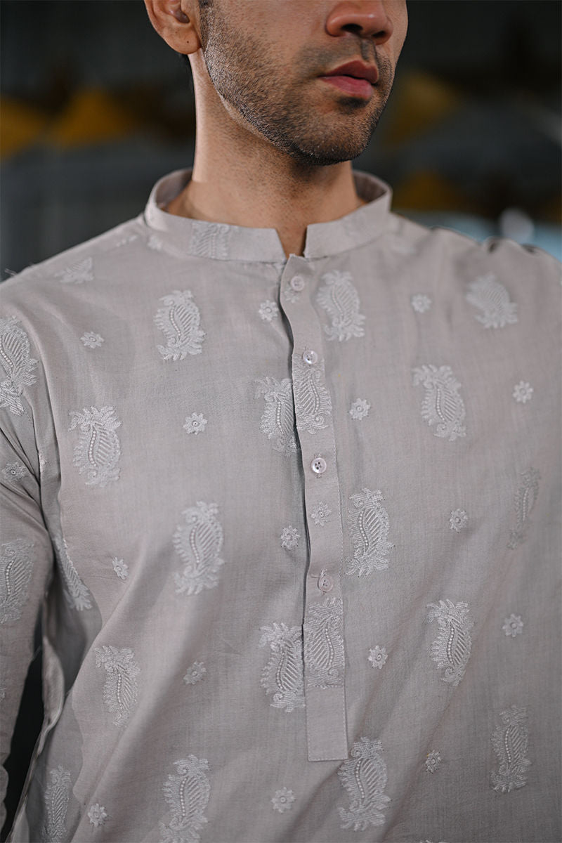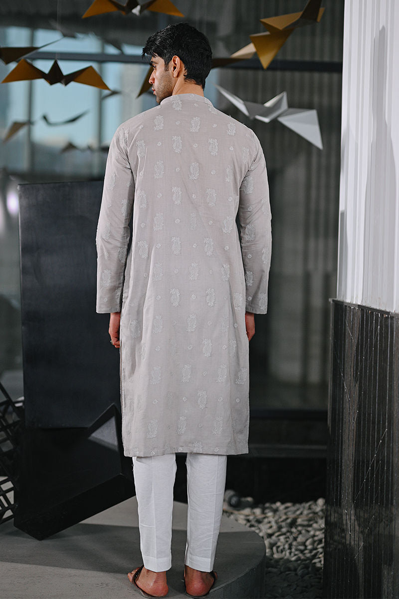 A pale blue kurta with intricate self-embroidery, paired with white pants for a light, airy look that exudes quiet sophistication.