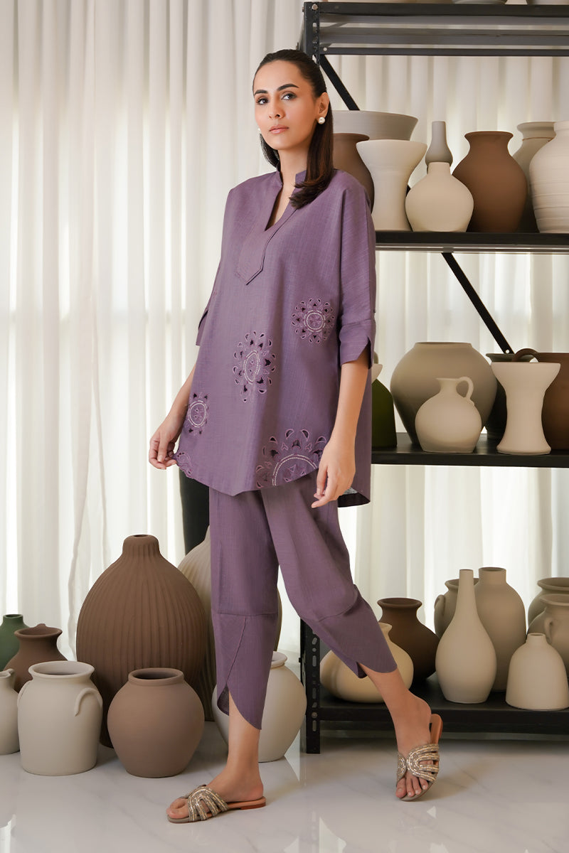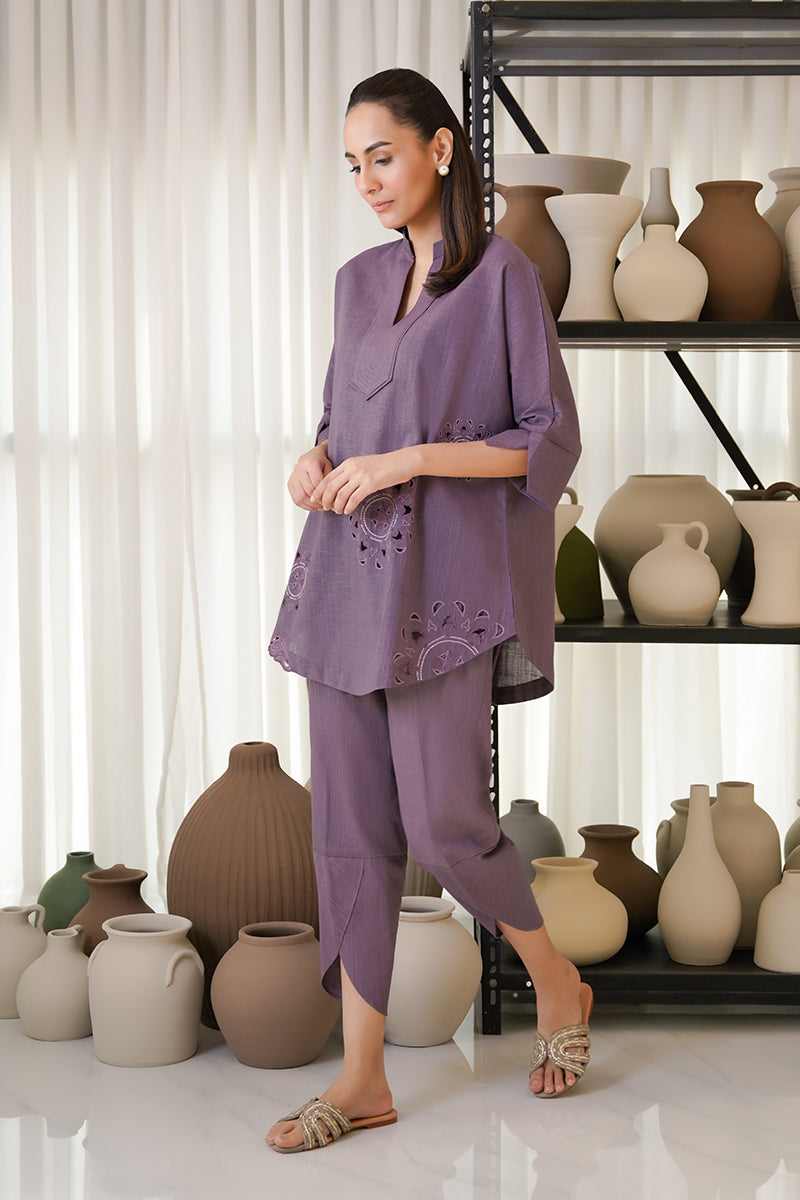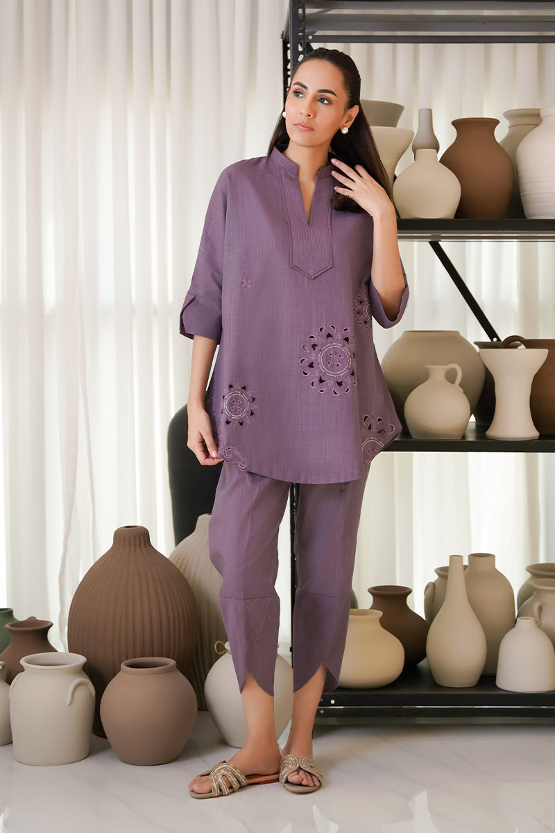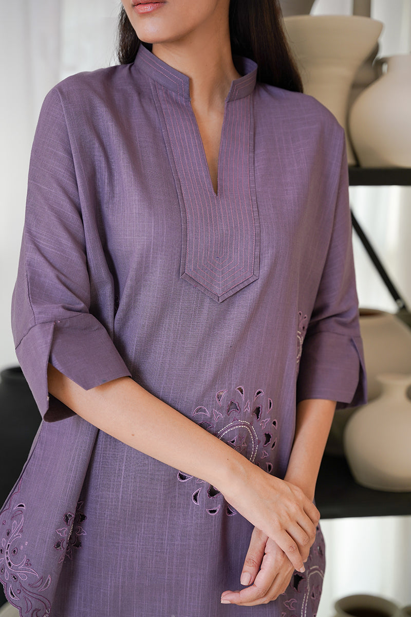 Dewberry, an elegant mulberry purple canvas encapsulated with cutwork and machine embroidery. The neckline is adorned with machine stitches to complete the look. The loose-fit sleeves with a slit, adds...