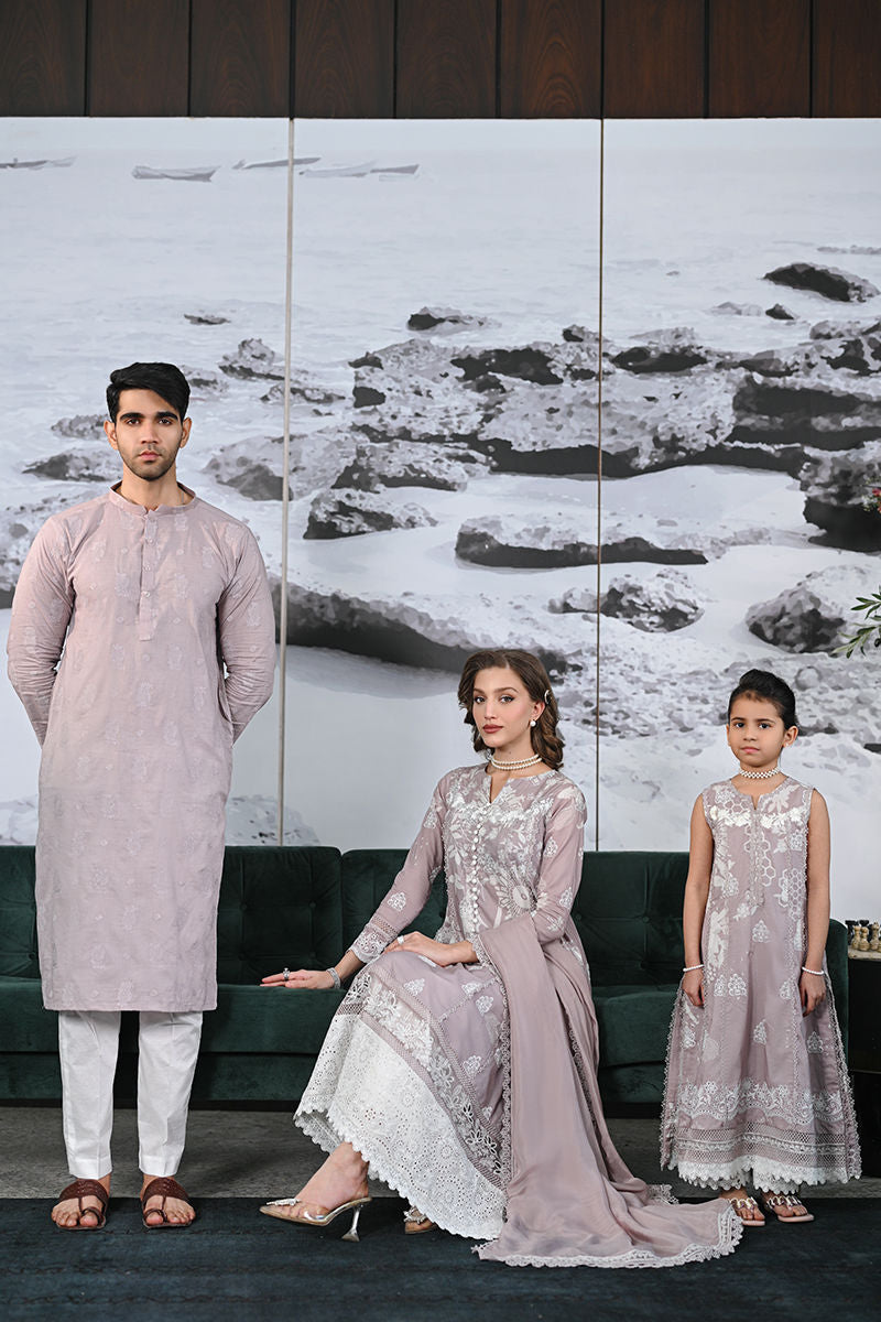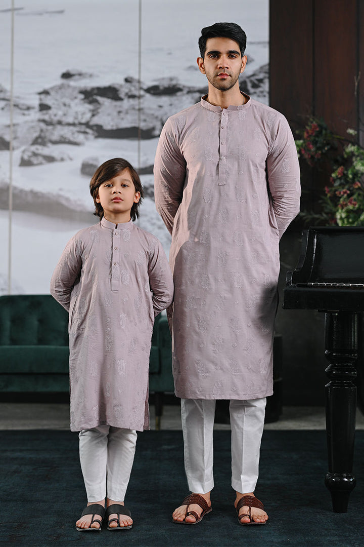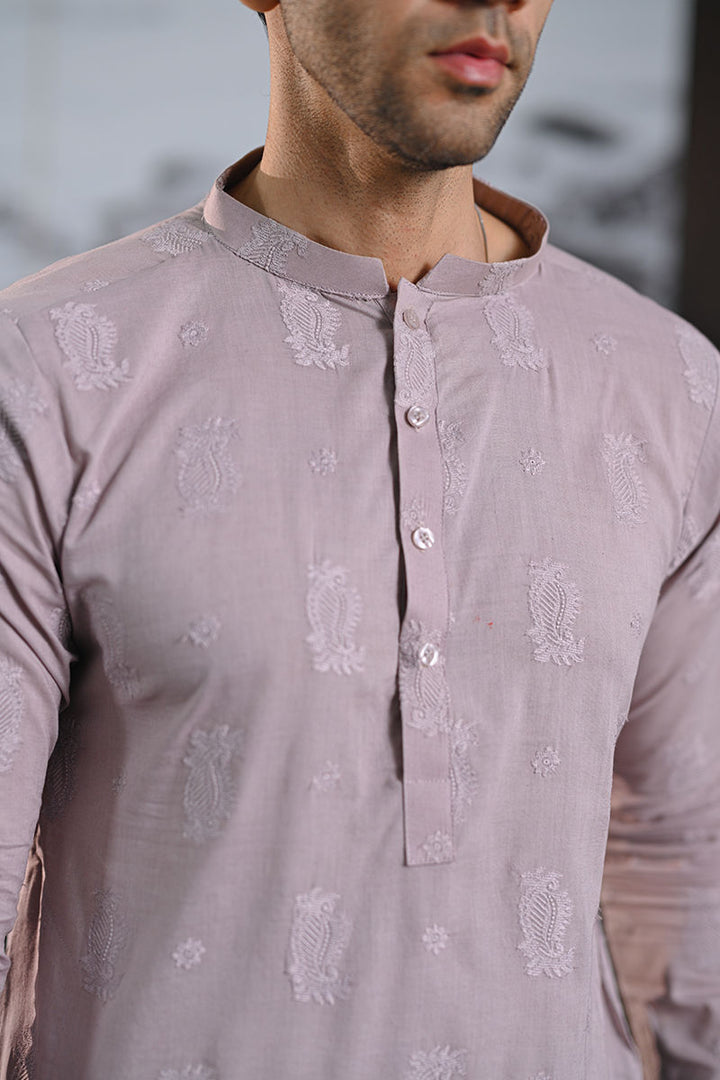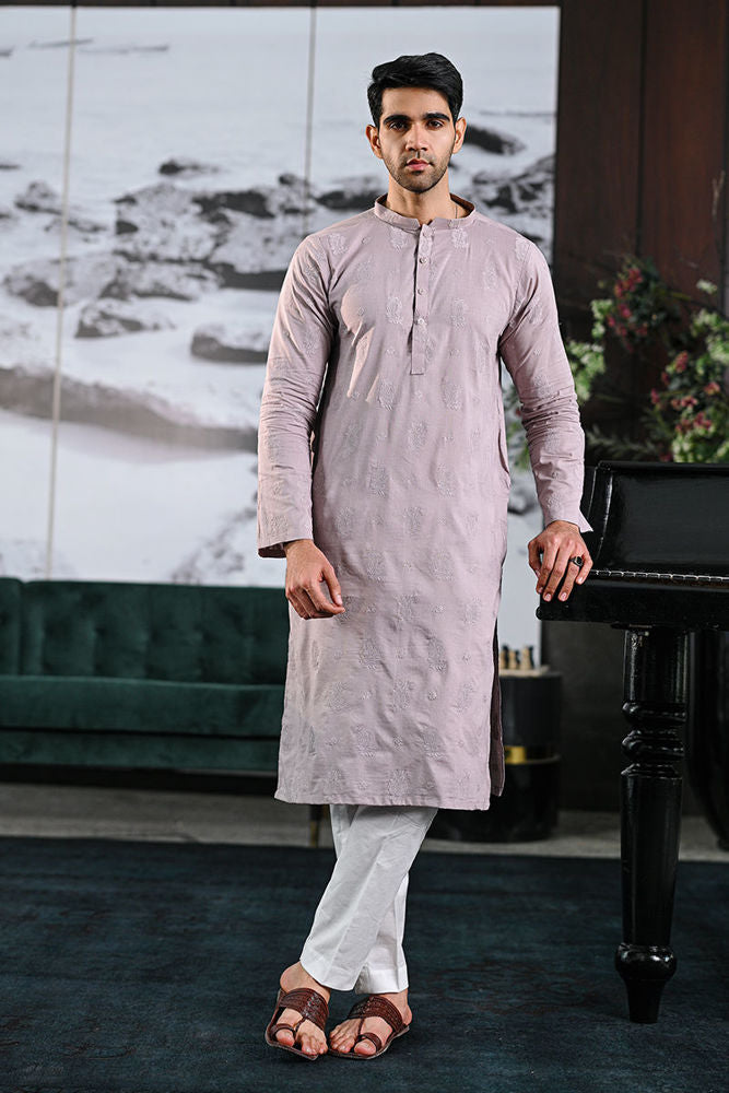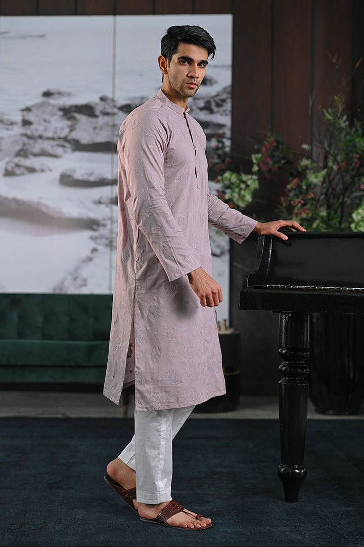 A mauve kurta with self-on-self embroidery, paired with crisp white pants for a look that’s effortlessly stylish.