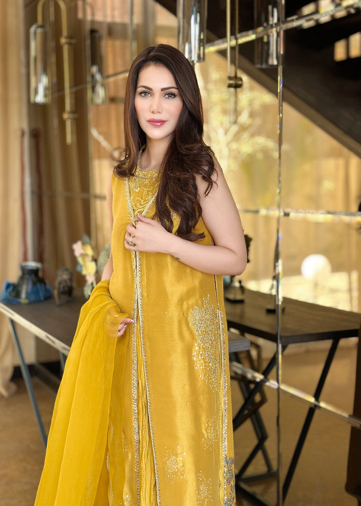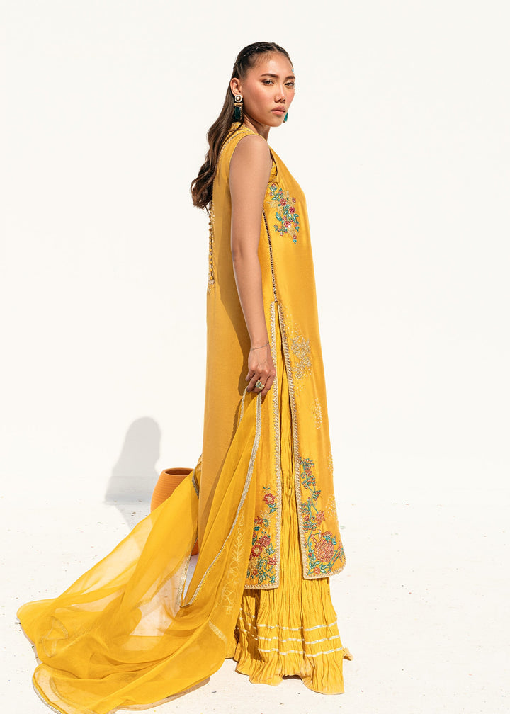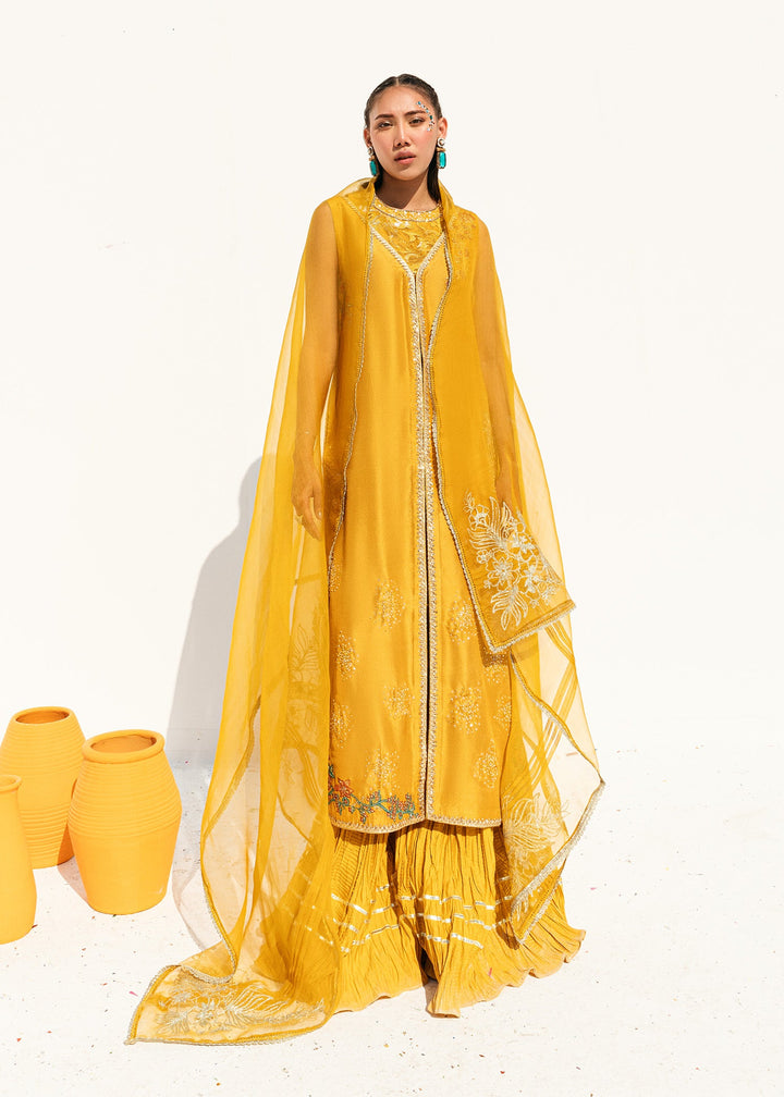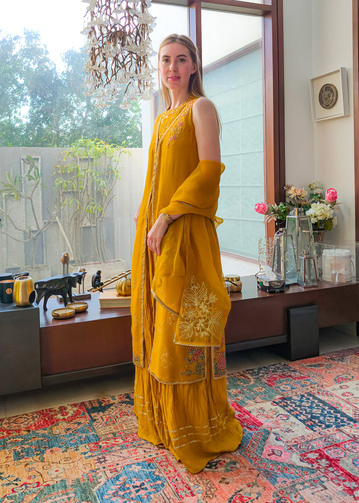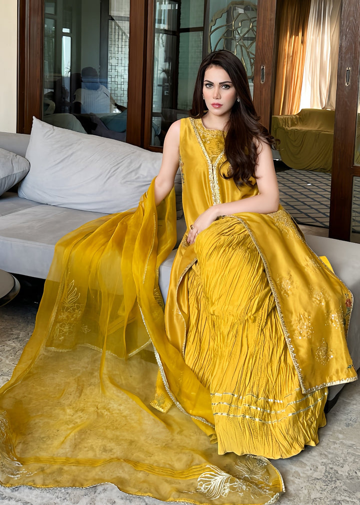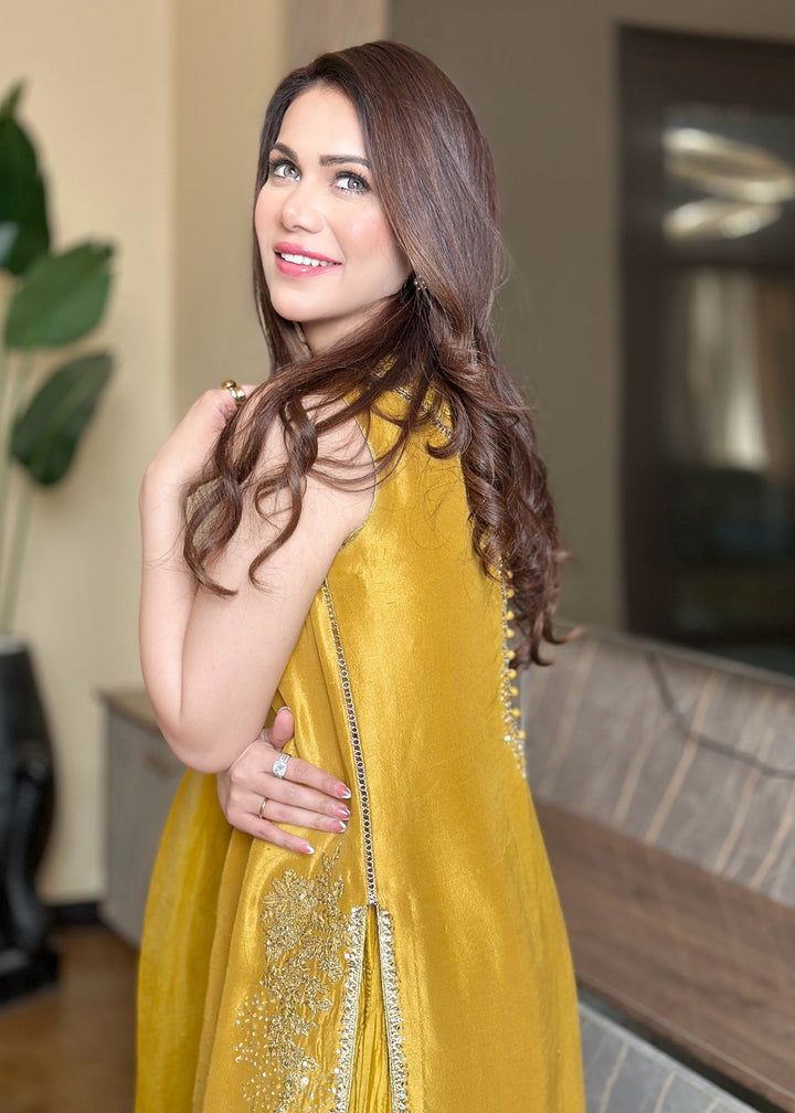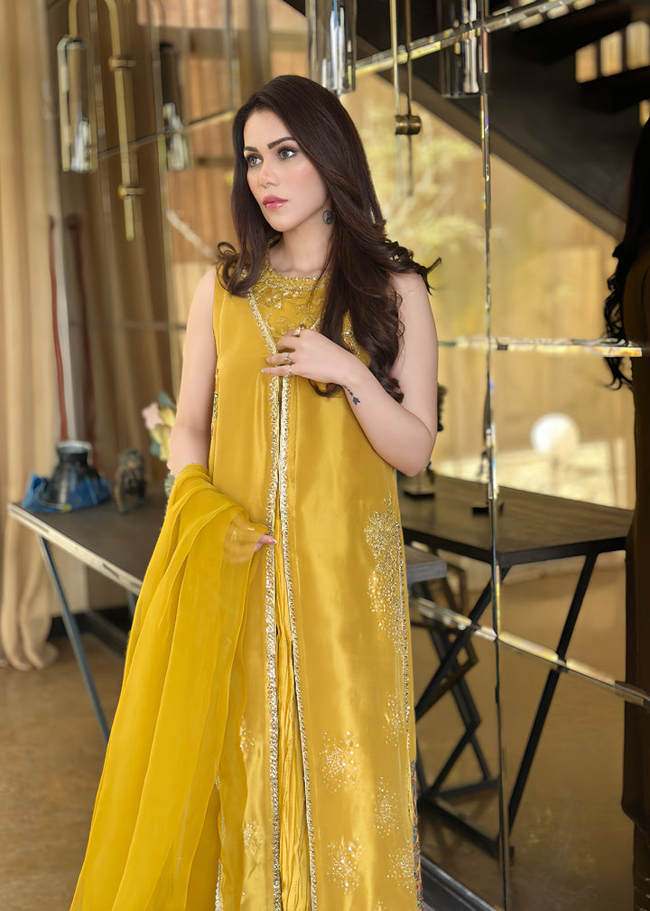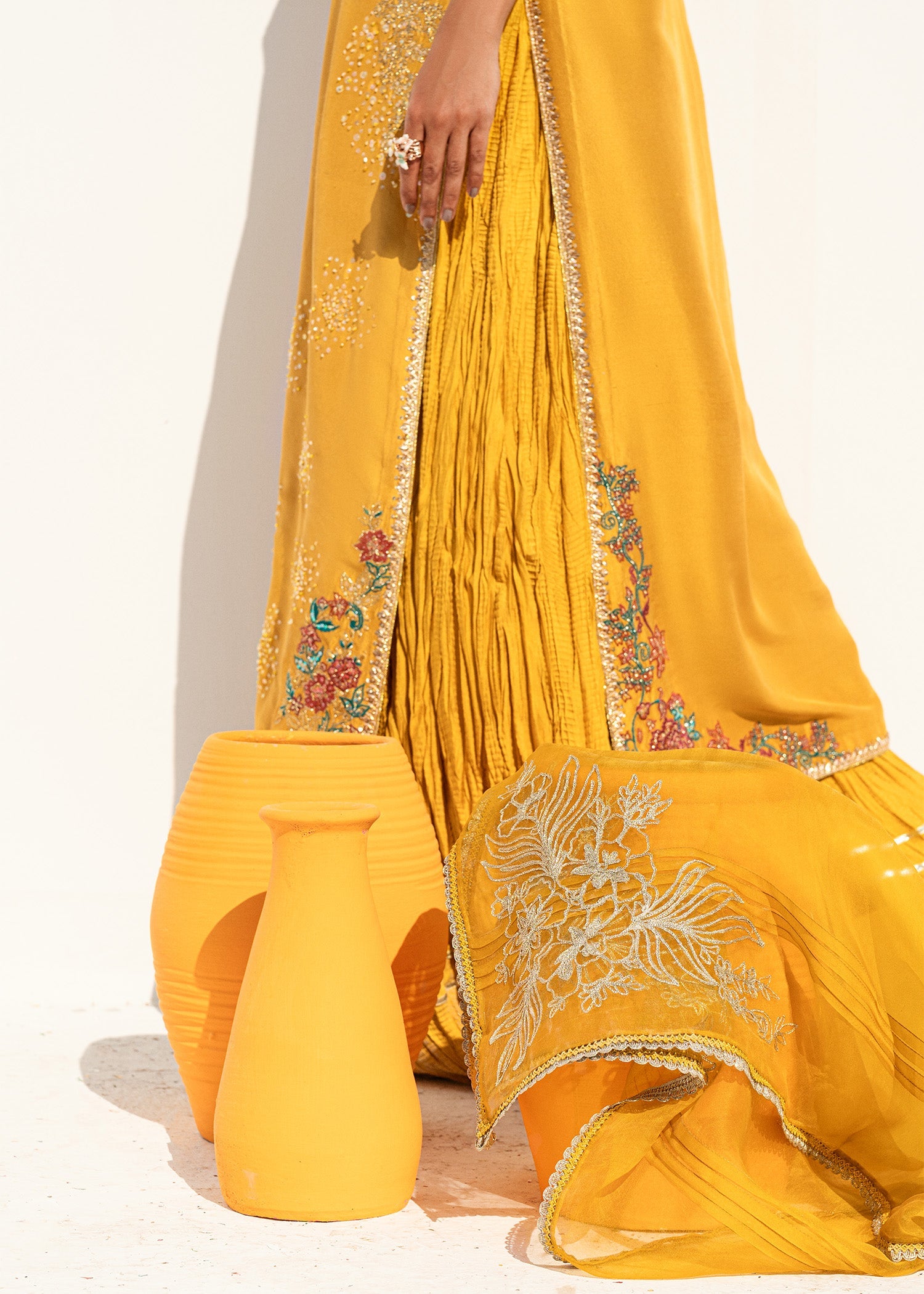 This is a front-open long jacket paired with a halter bustier inside. The jacket features detailed embroidery bunches, intricate sequin sprays, handwork details, and a gota technique. It is complemented with crushed palazzos and an organza dupatta adorned with embroidery bunches on all four sides.