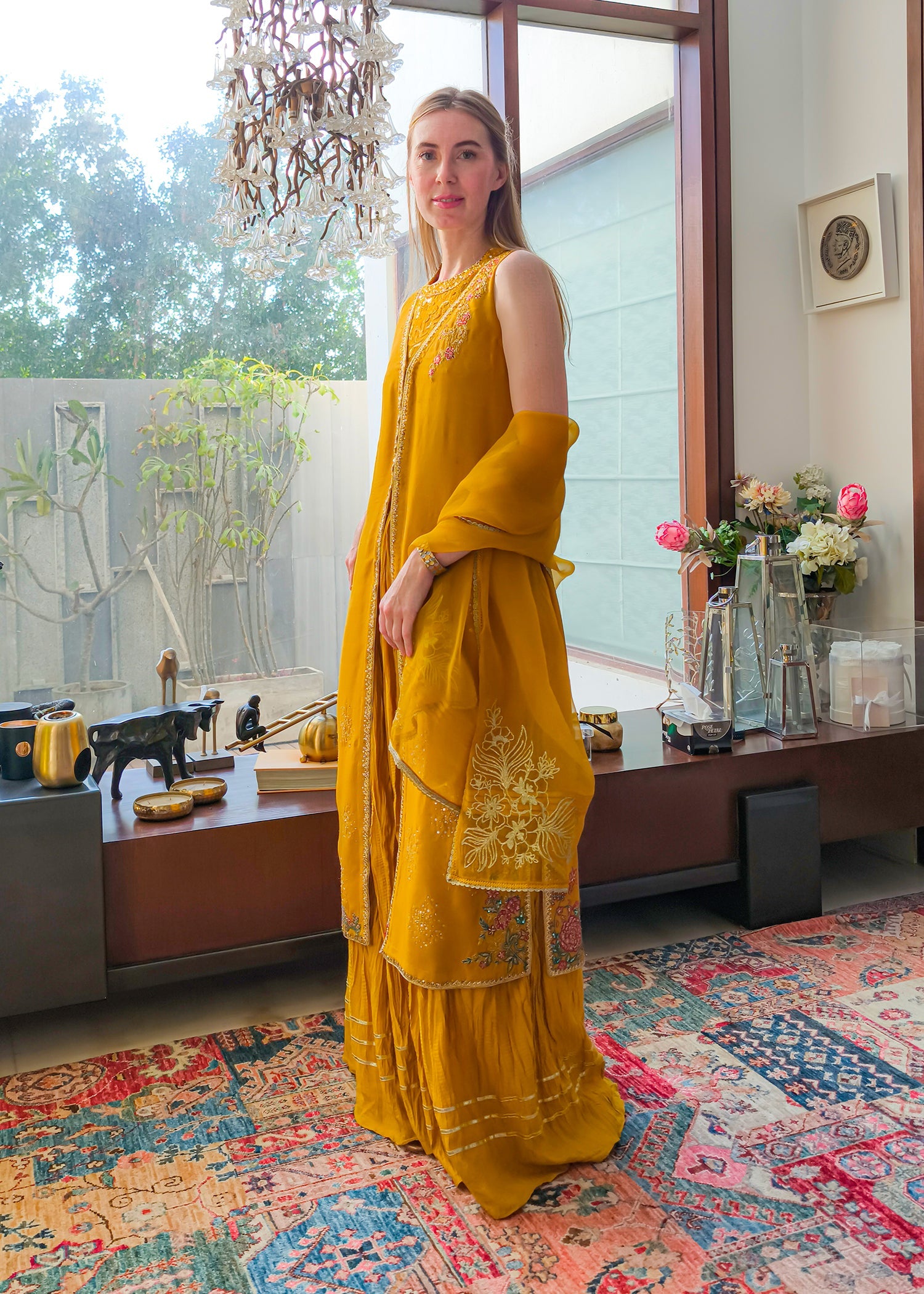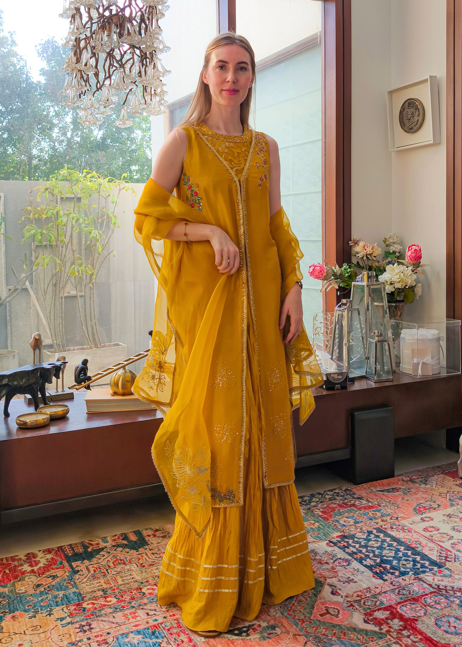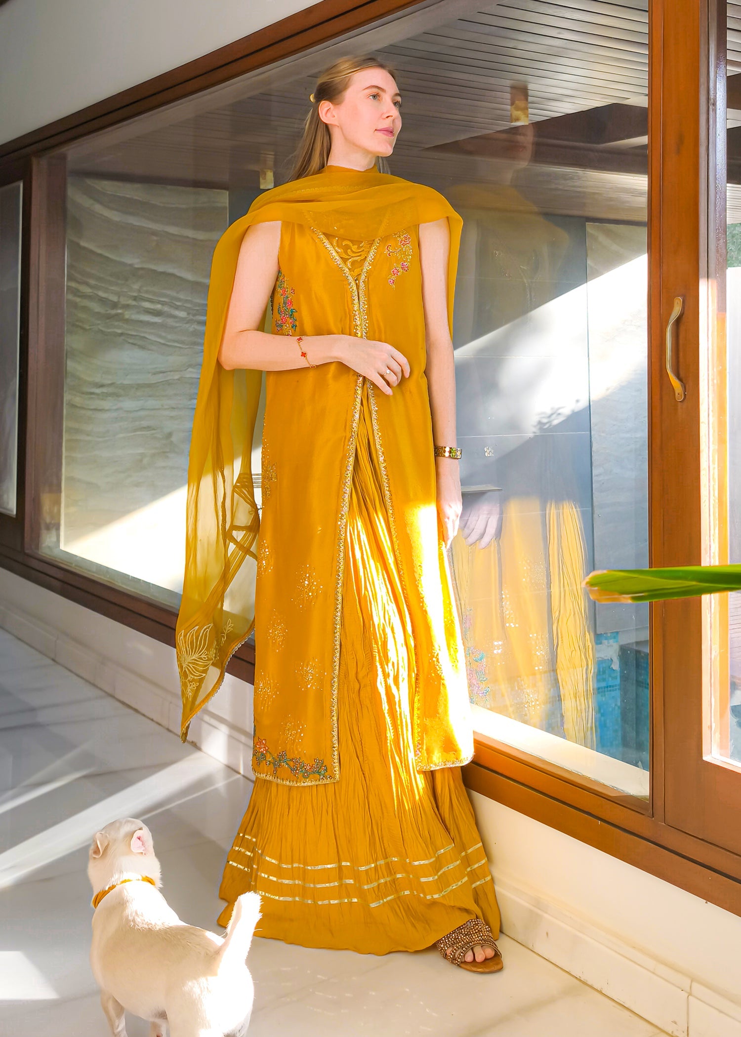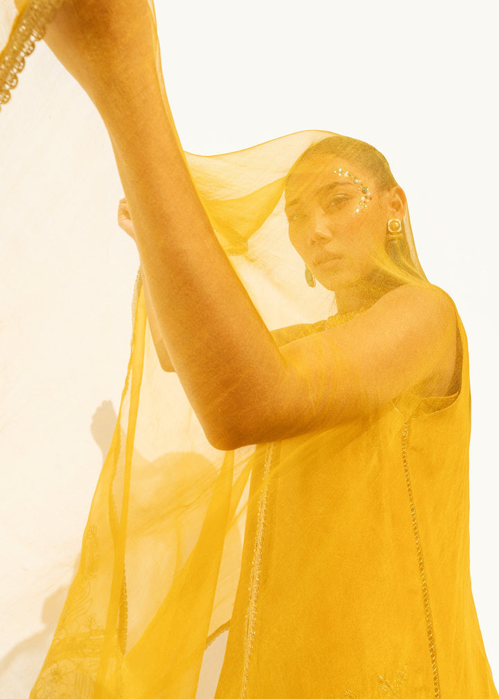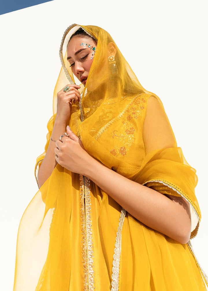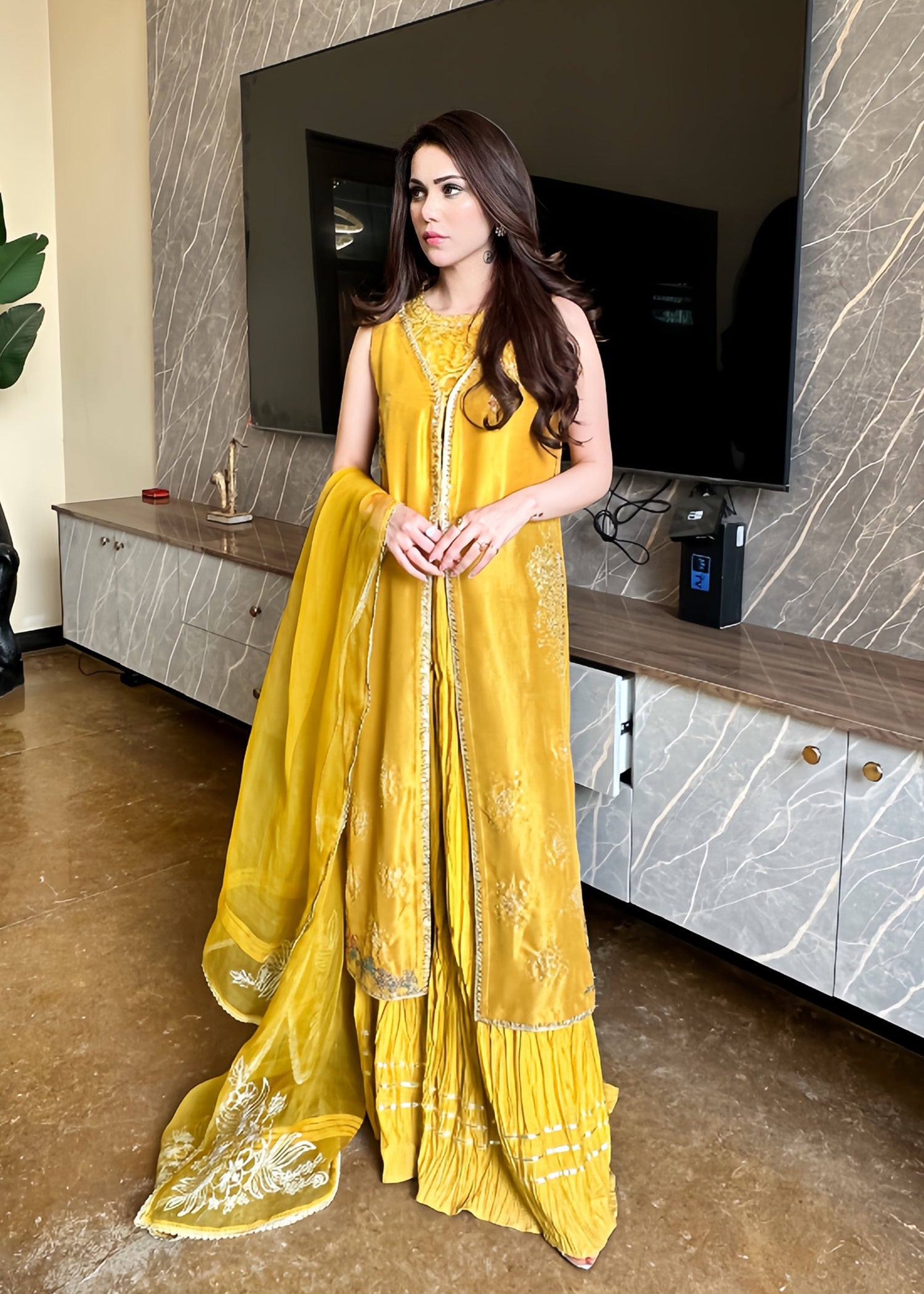 This is a front-open long jacket paired with a halter bustier inside. The jacket features detailed embroidery bunches, intricate sequin sprays, handwork details, and a gota technique. It is complemented with crushed palazzos and an organza dupatta adorned with embroidery bunches on all four sides.