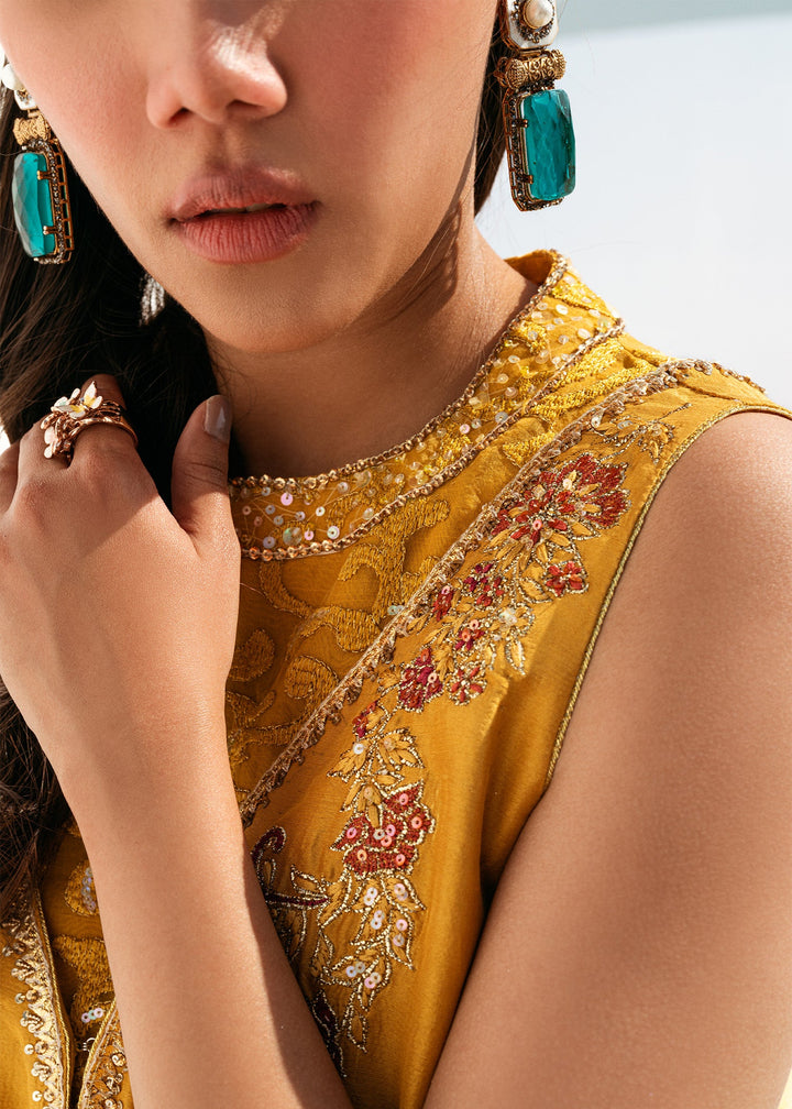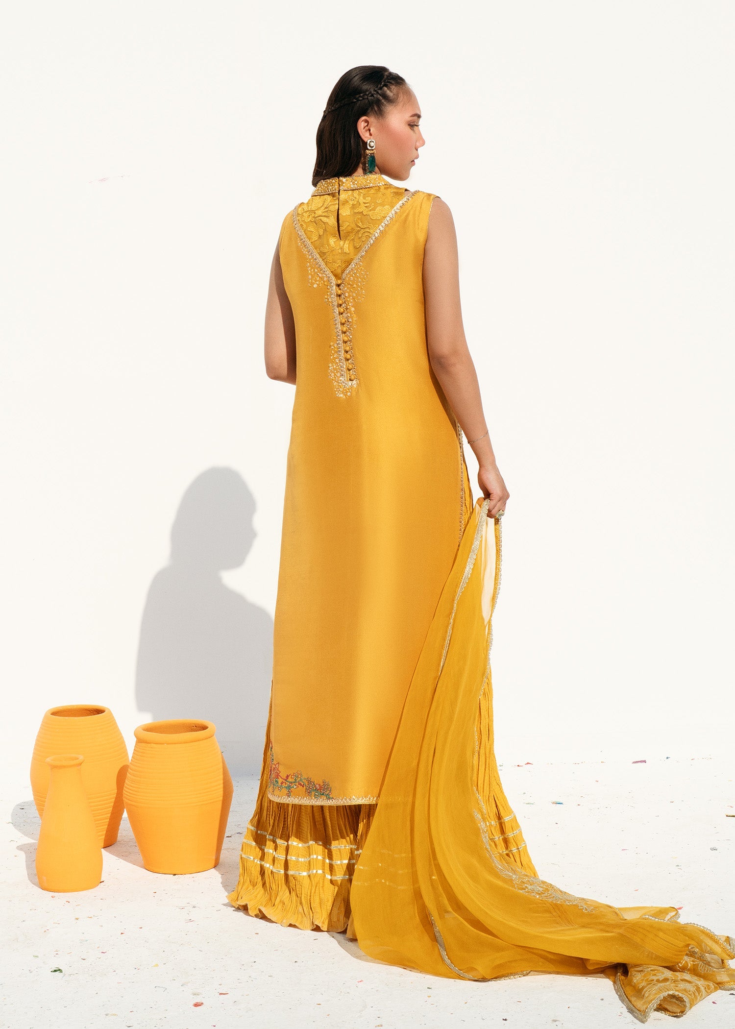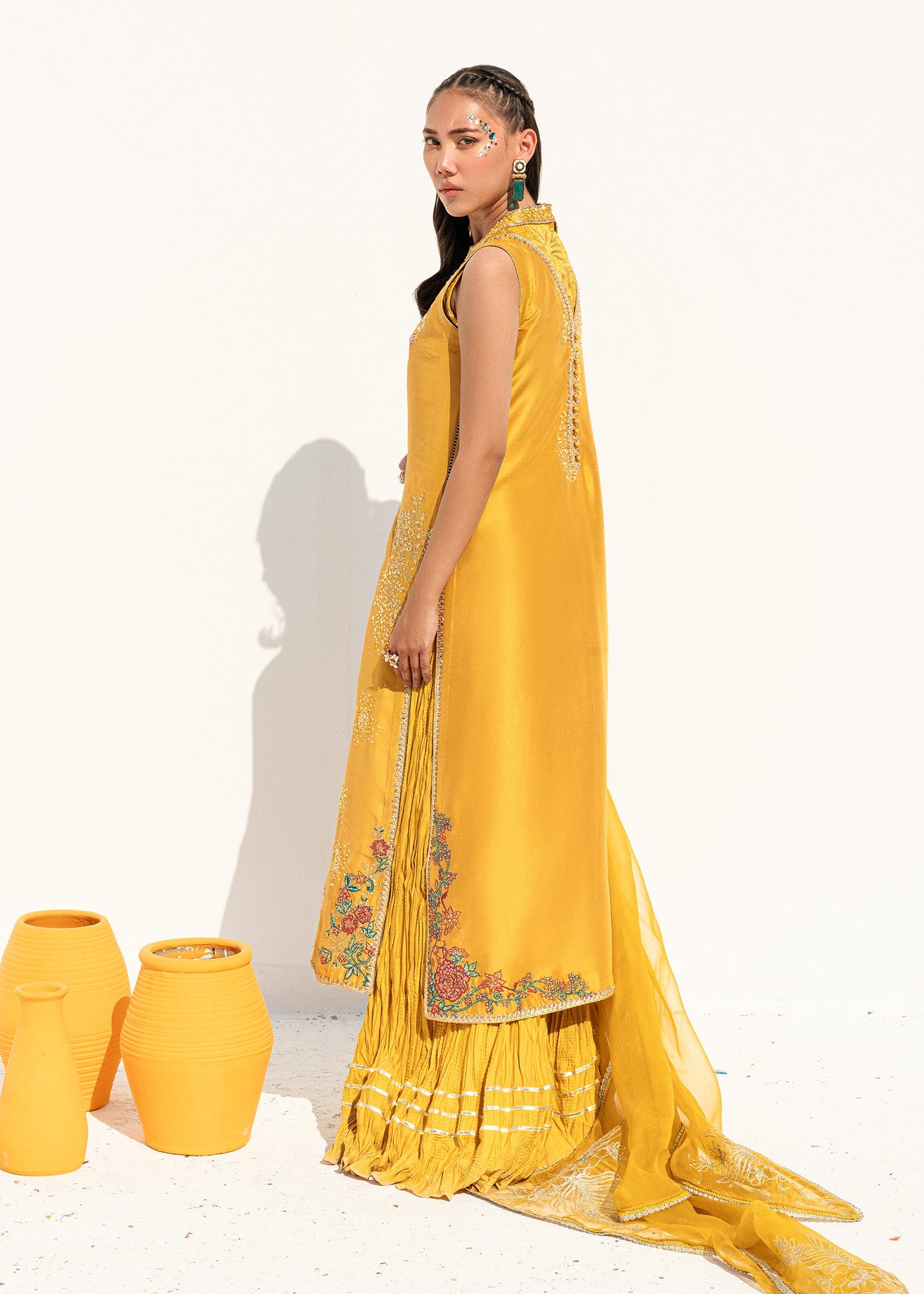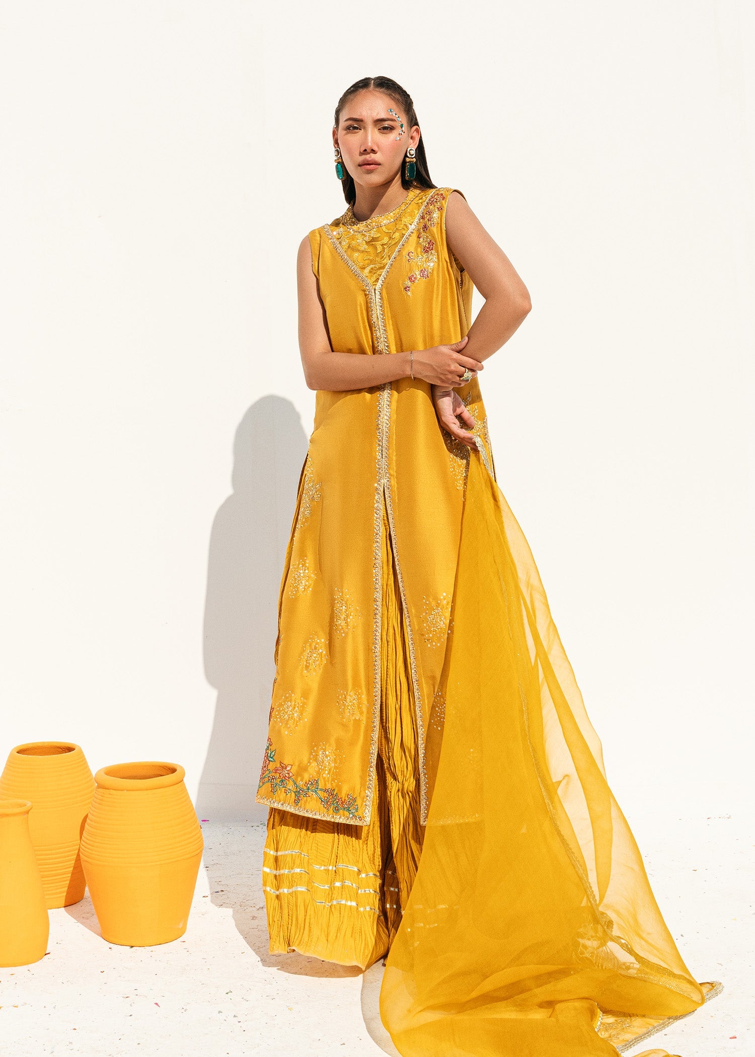This is a front-open long jacket paired with a halter bustier inside. The jacket features detailed embroidery bunches, intricate sequin sprays, handwork details, and a gota technique. It is complemented...