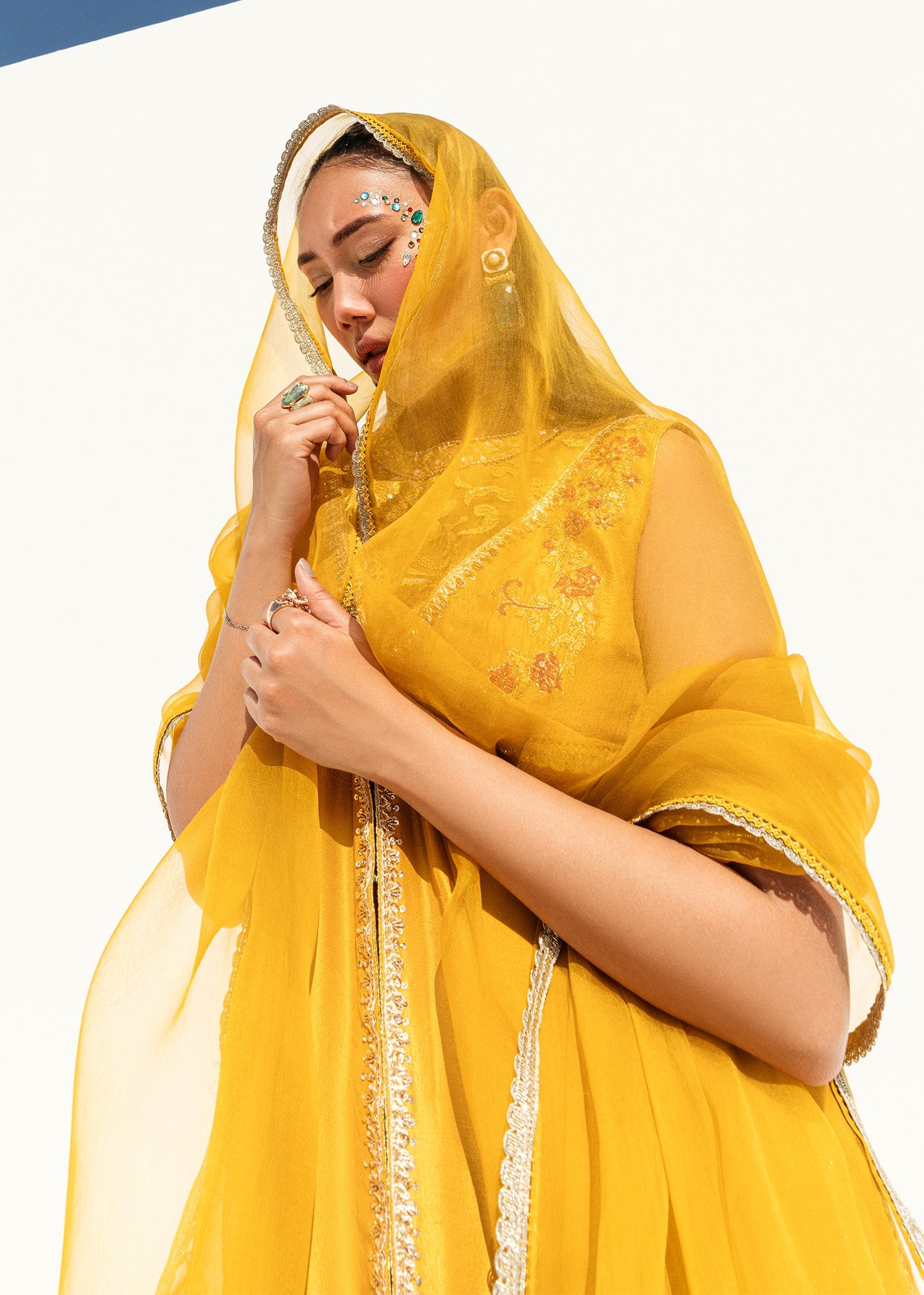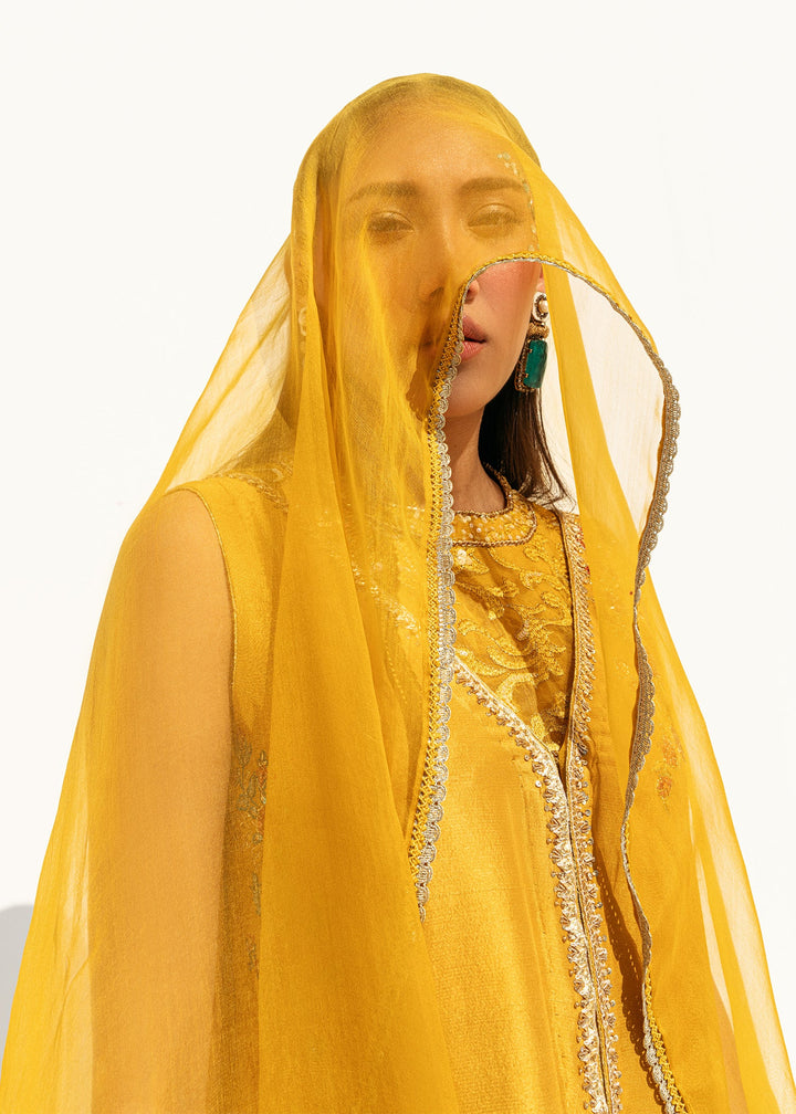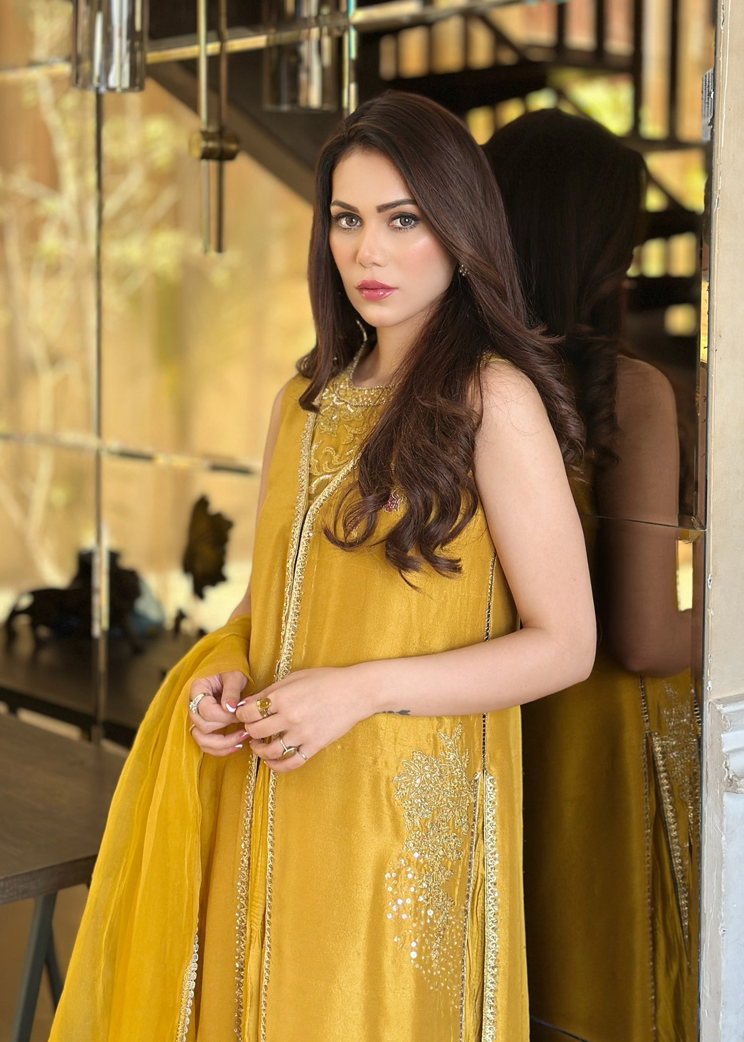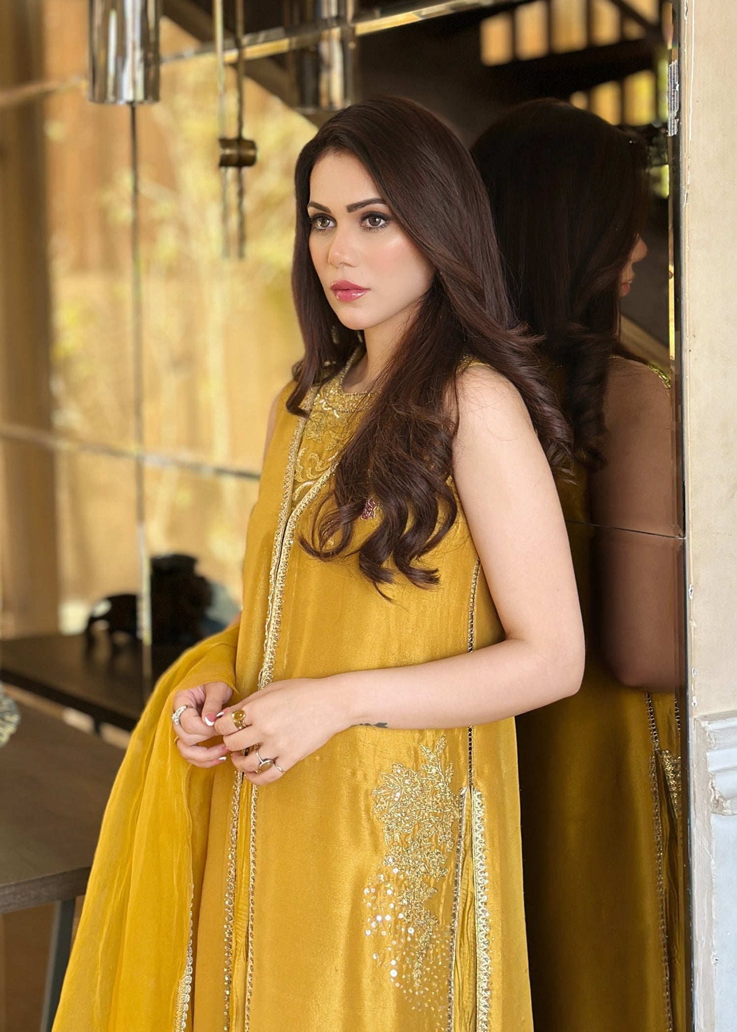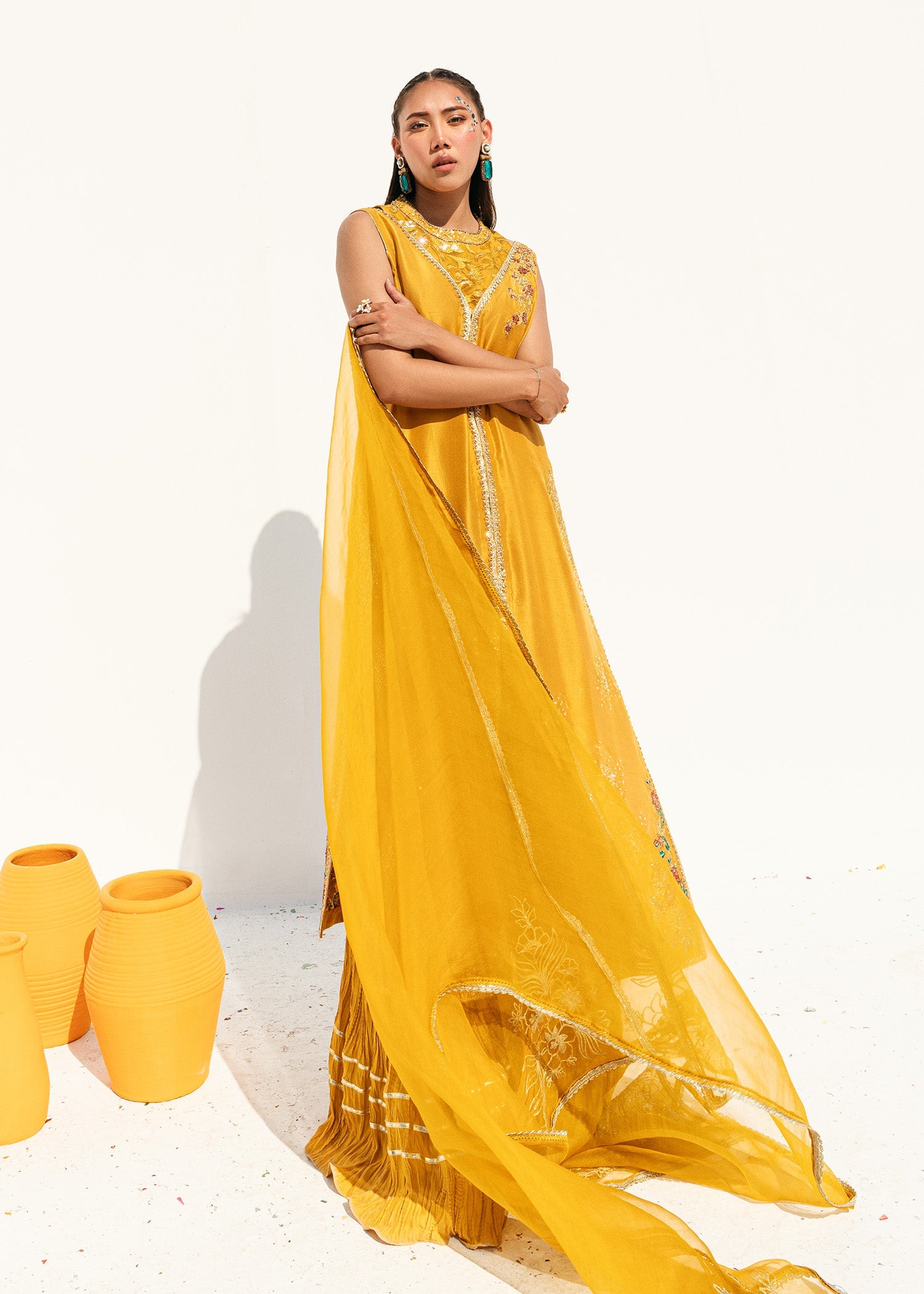 This is a front-open long jacket paired with a halter bustier inside. The jacket features detailed embroidery bunches, intricate sequin sprays, handwork details, and a gota technique. It is complemented...