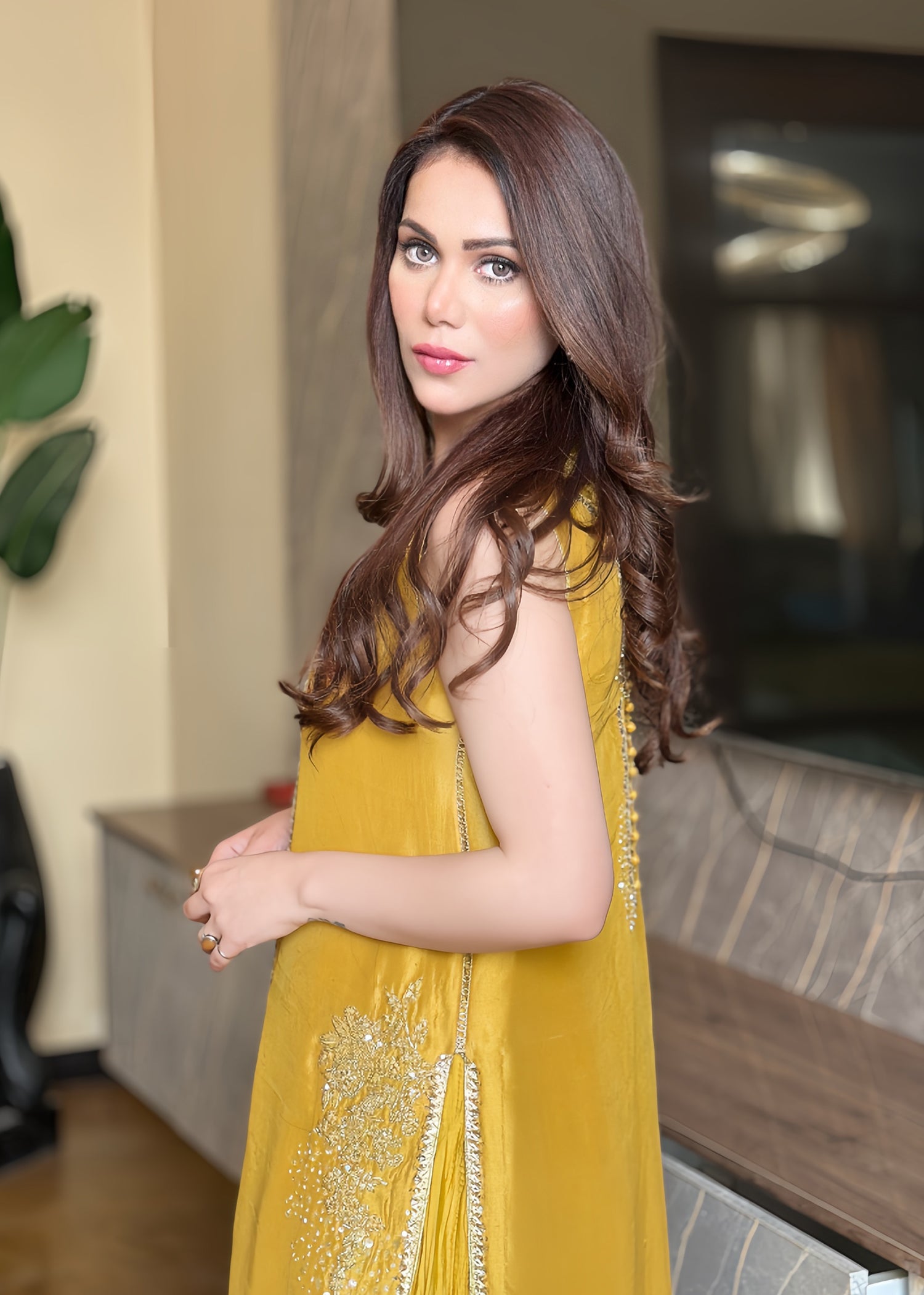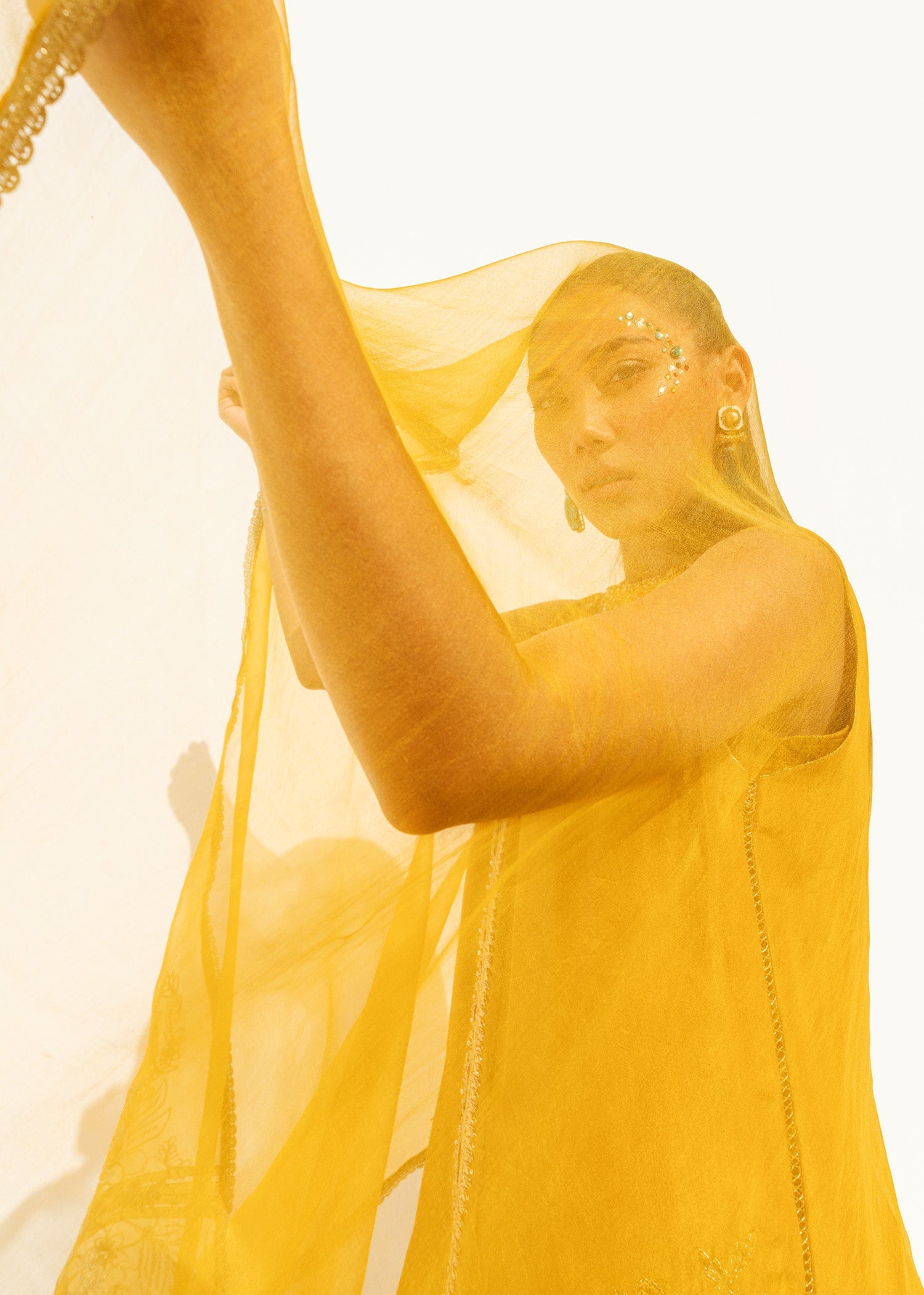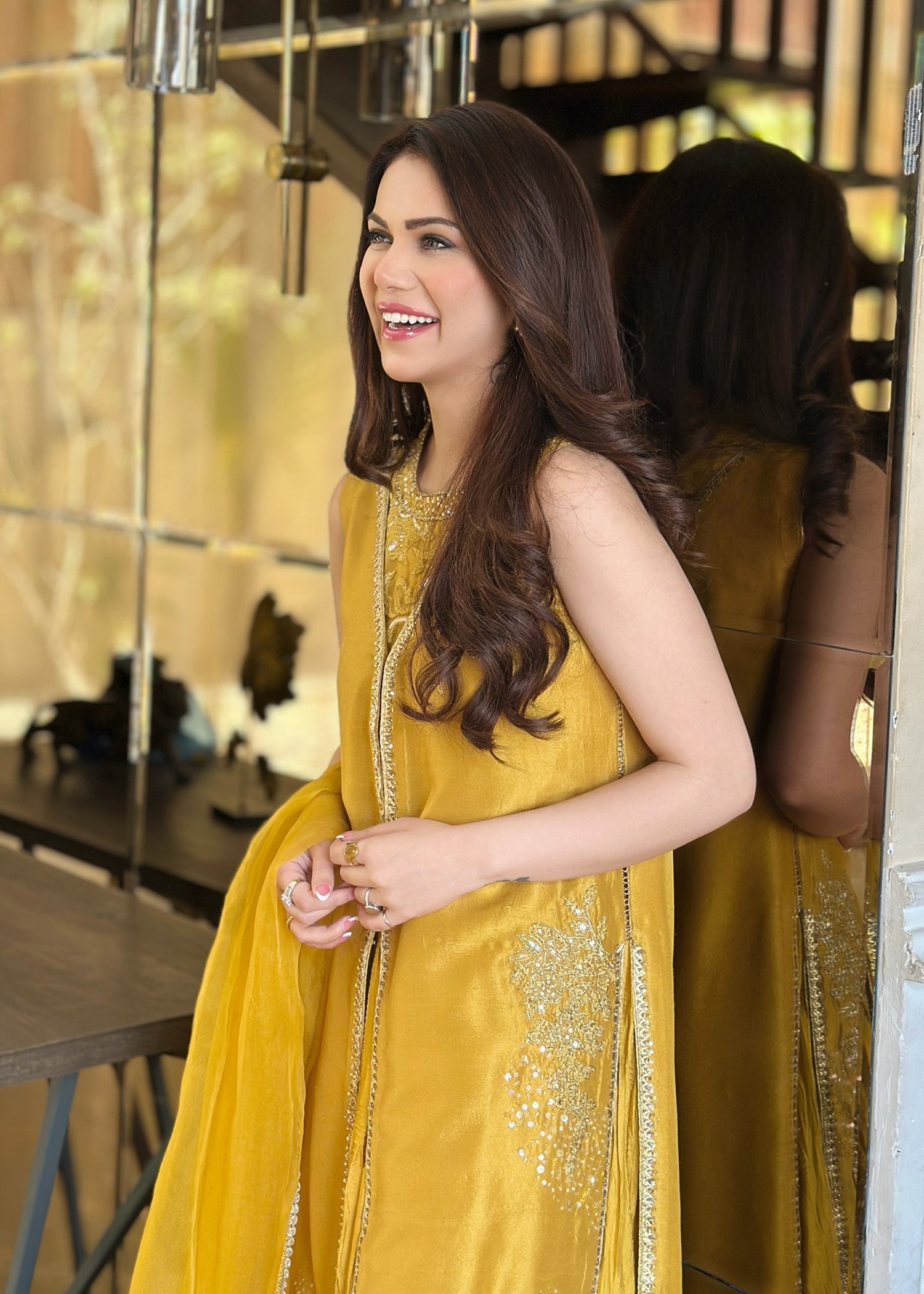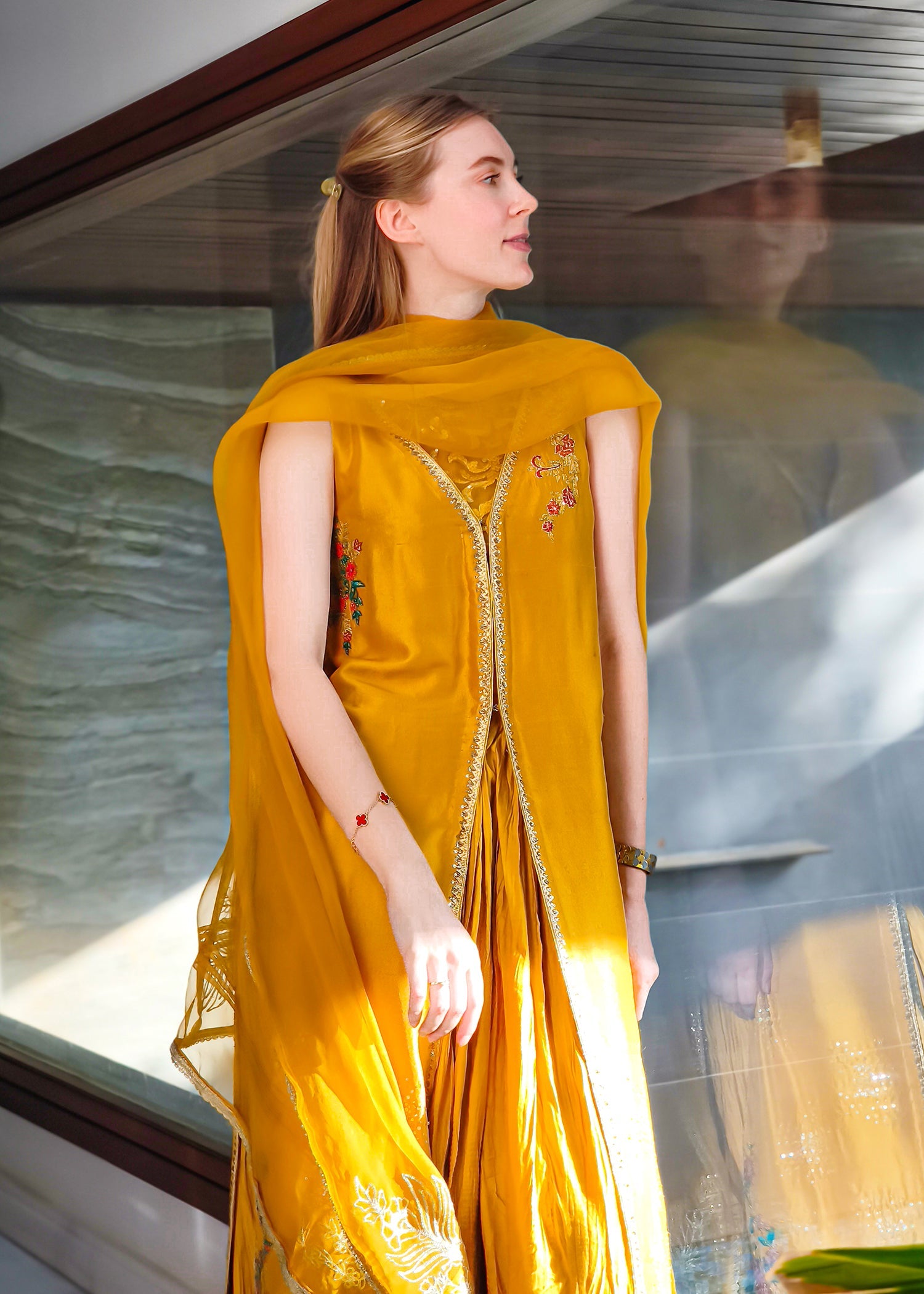 This is a front-open long jacket paired with a halter bustier inside. The jacket features detailed embroidery bunches, intricate sequin sprays, handwork details, and a gota technique. It is complemented...