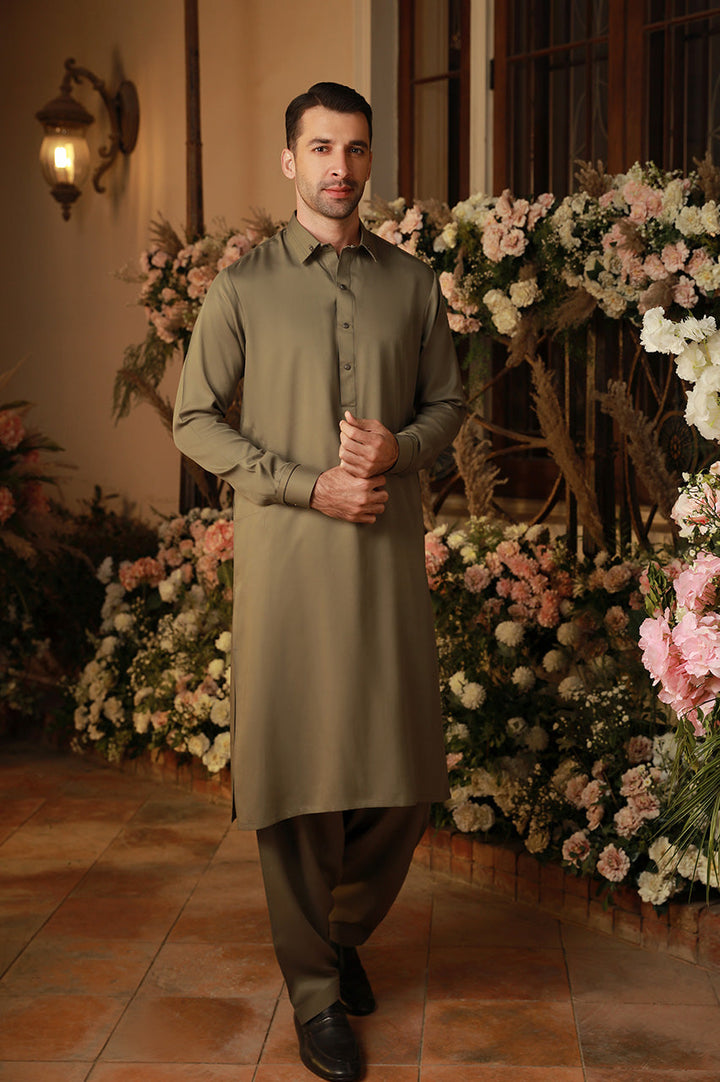 An olive green, wash n wear kurta and shalwar designed with pleat and button detailing.