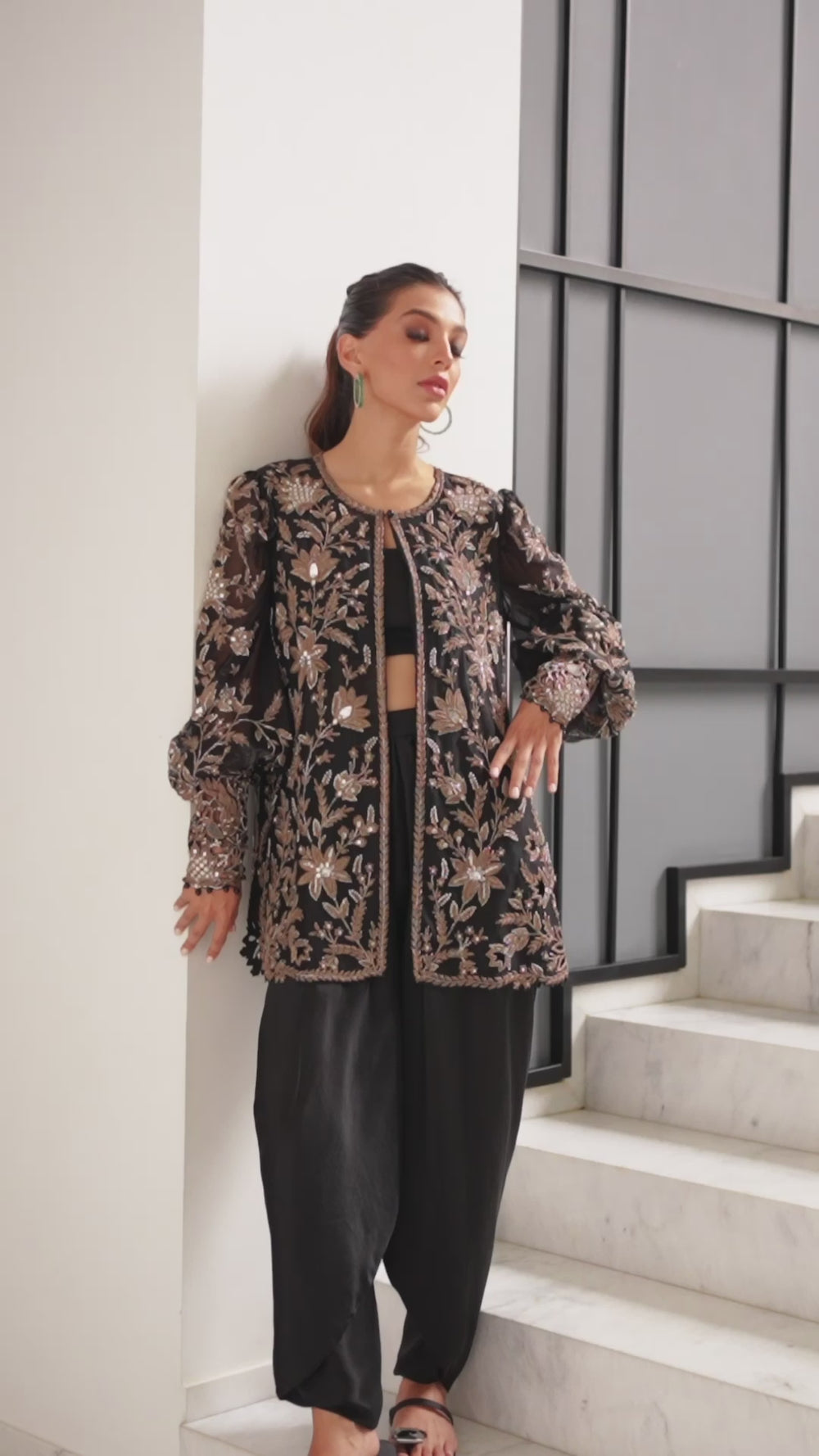 An ebony statement jacket exquisitely illustrates how bold meets enchanting. The front open organza jacket, featuring dramatic cuffed sleeves, is artfully rendered with copper and silver zardoze embroidery and paired with charmeuse tube top and draped shalwar in ebony.