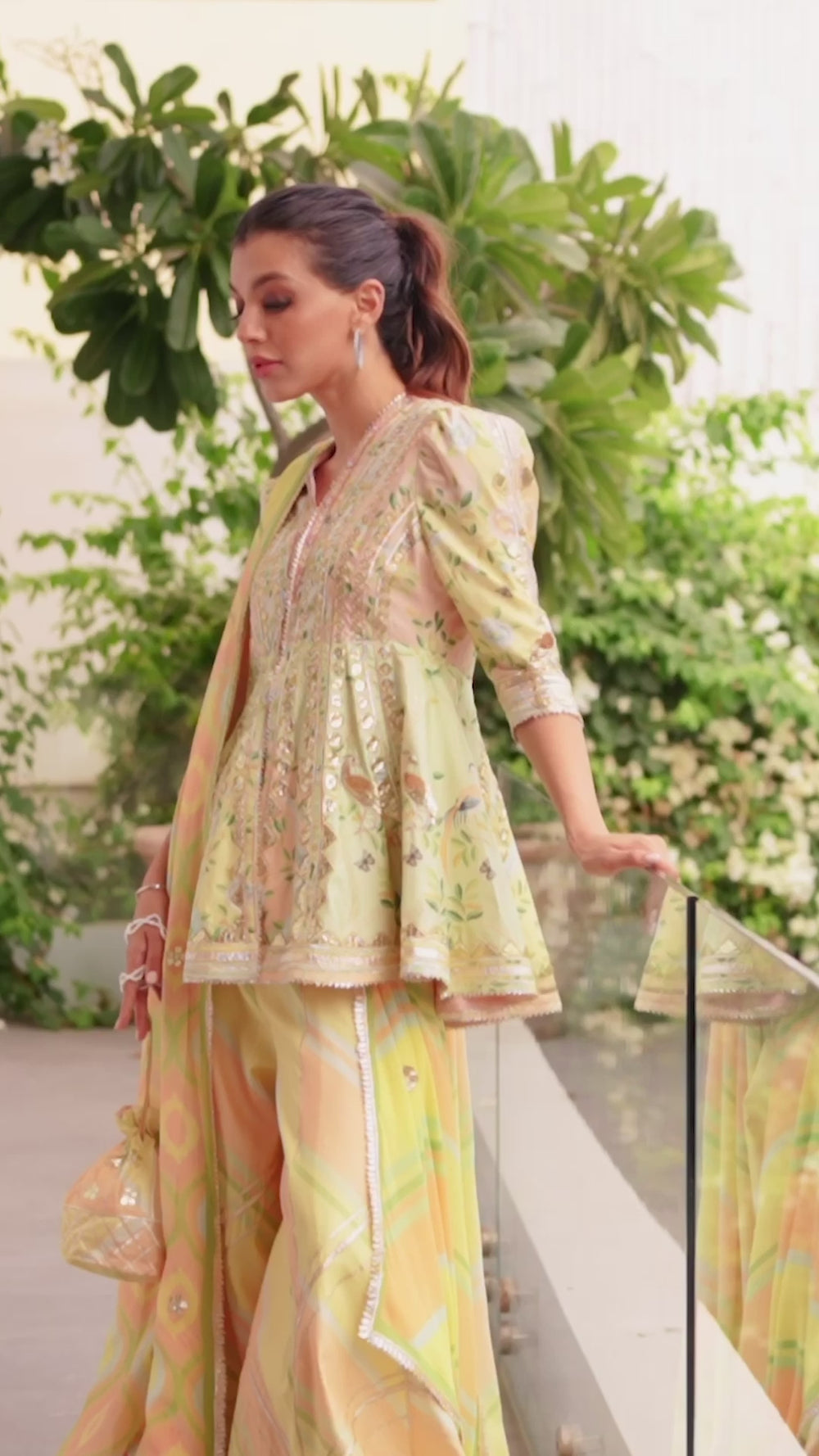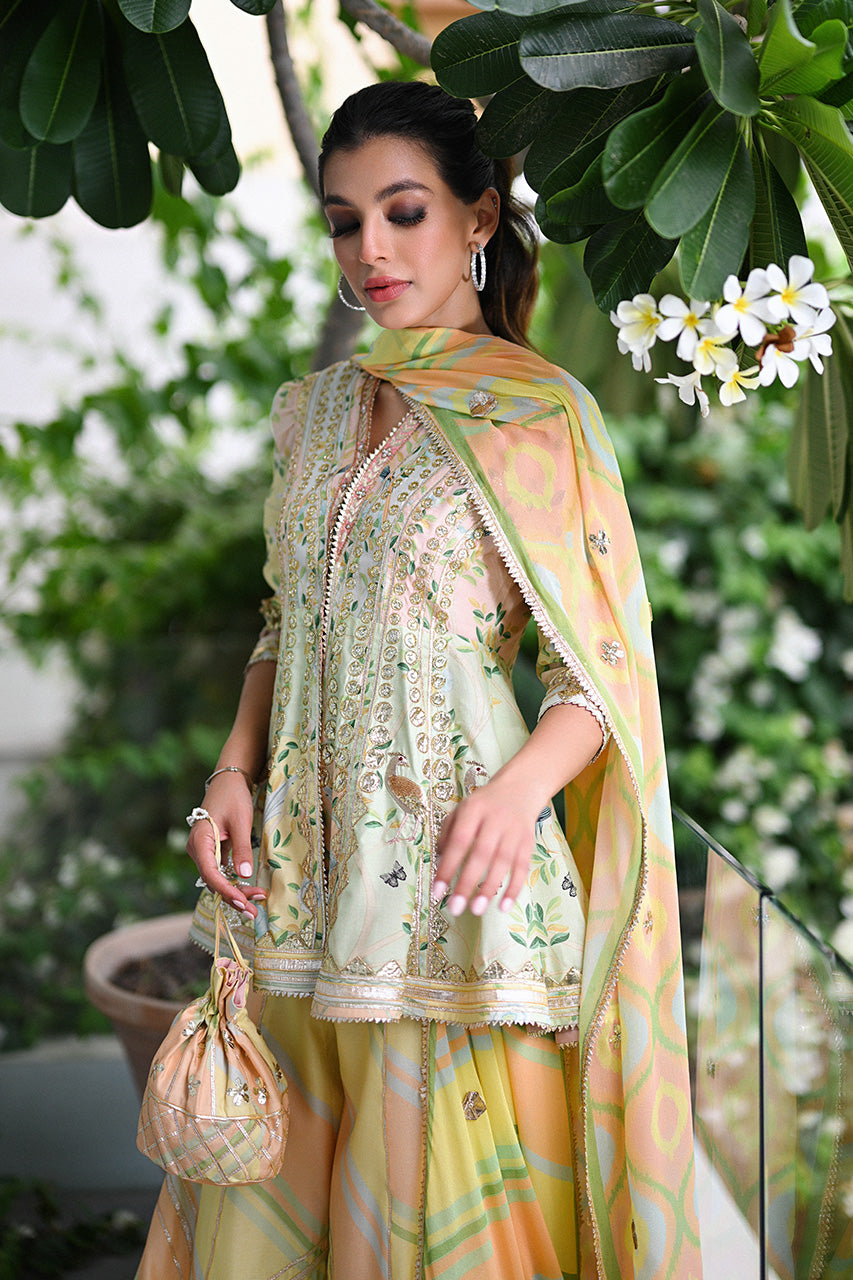 Wear summery hues this festive season to stand apart. The lightest hue of lemon yellow and peach is balanced beautifully with muted grey and pistachio green to artfully compose a print that pays ode to nature on a khaddi silk peplum and dhaka pajama. The muted silver gota and resham embroidery elevates the entire outfit including a cascading georgette dupatta featuring a geometric print.