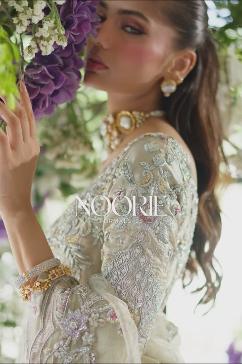 A timeless beige long lame gown, beautifully adorned with heavy embroidery on the neckline, sleeves, and gown border, creating a look of understated luxury. Paired with a beige zari net...