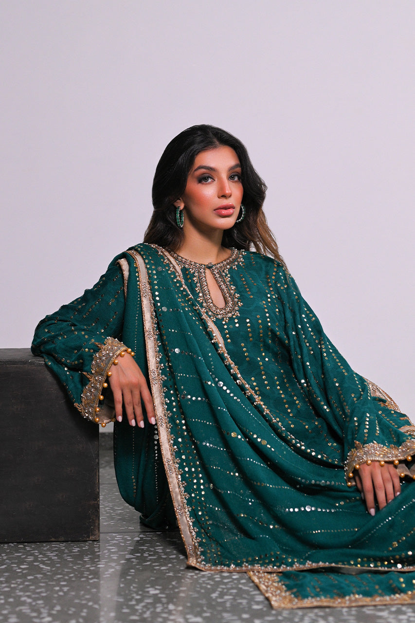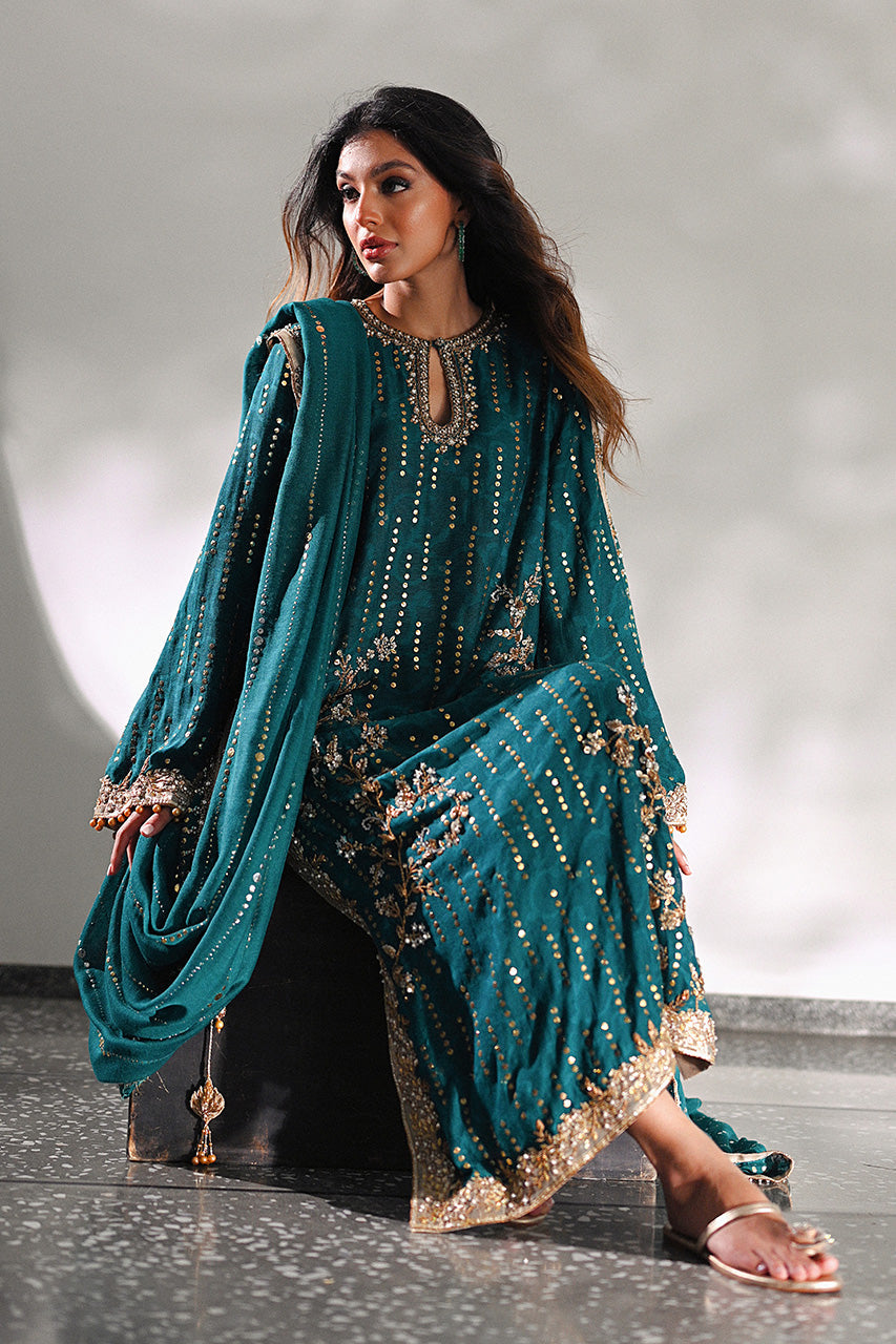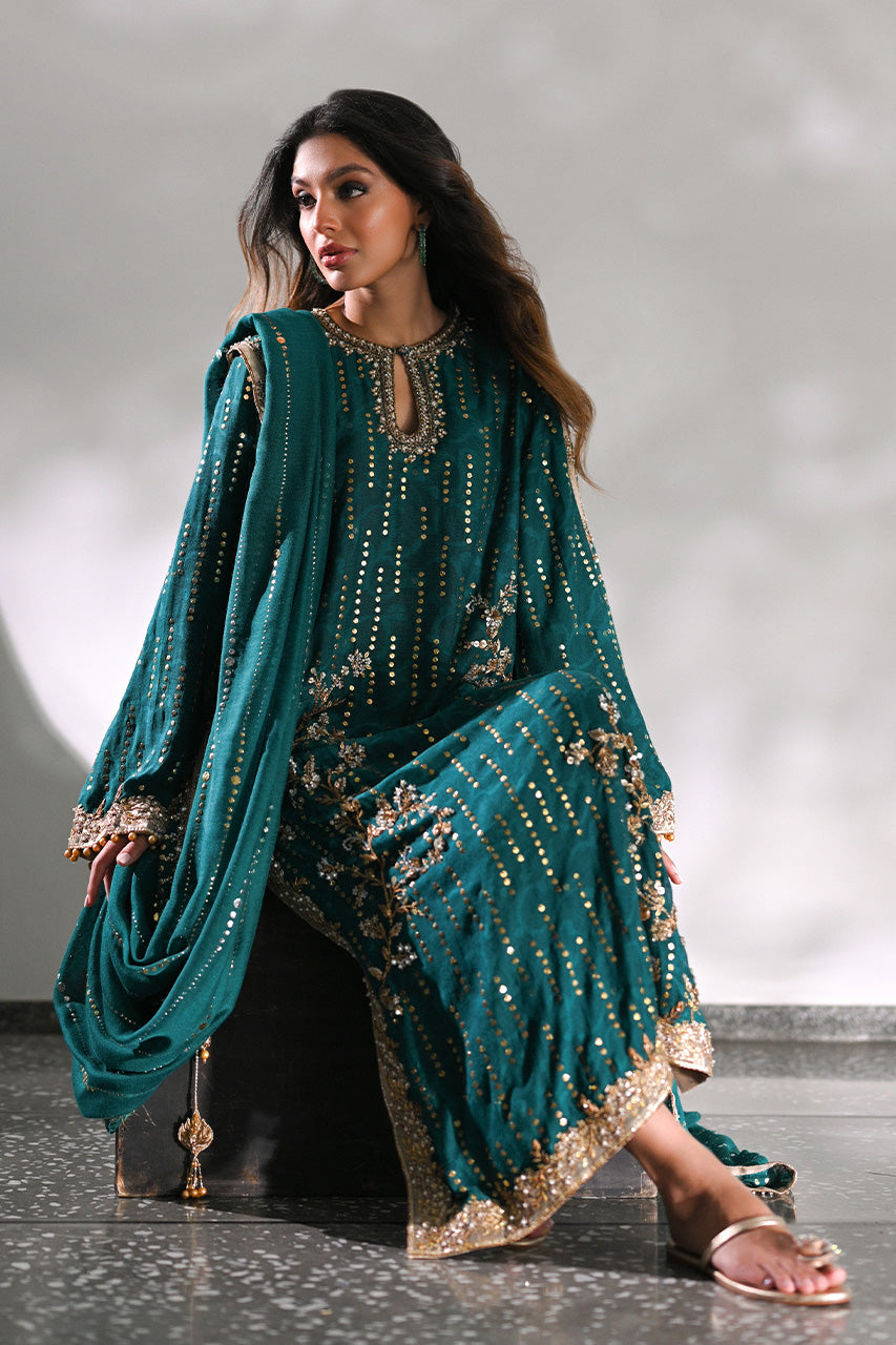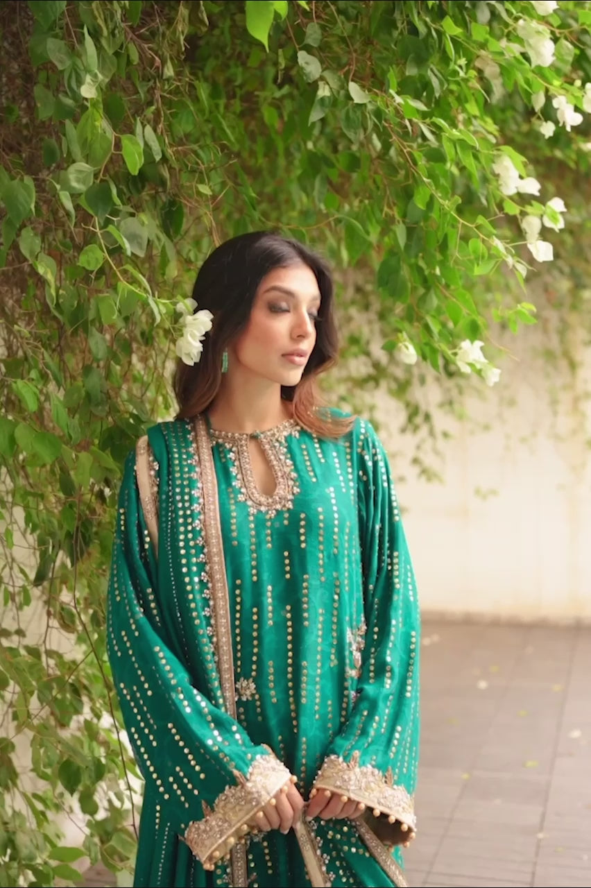 A shade of green that compliments all. Elayna (B) is a contemporary interpretation of classic festive wear. The emerald A-line, cotton net shirt drapes freely above the similarly hued pure rawsilk izaar and the emerald green cotton net dupatta. The astonishing assortment of tiny beads and metallic sequins amplify the exquisitely embroidered kamdani on the monochrome ensemble, with floral bunches in zardoze placed artistically to break the monotony.