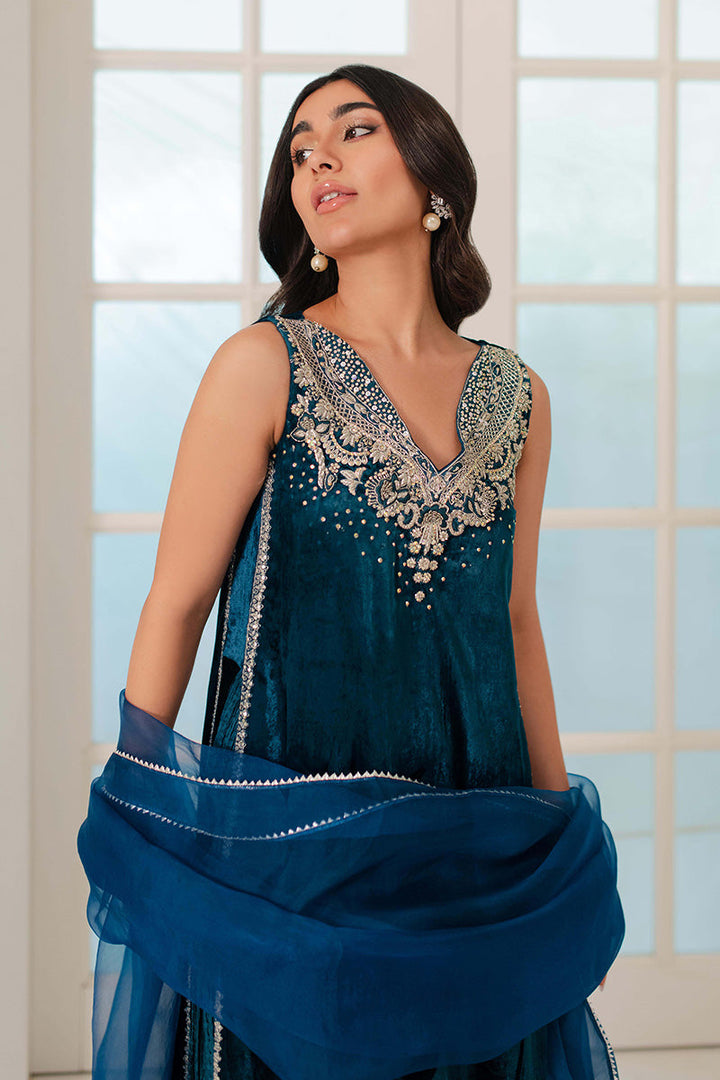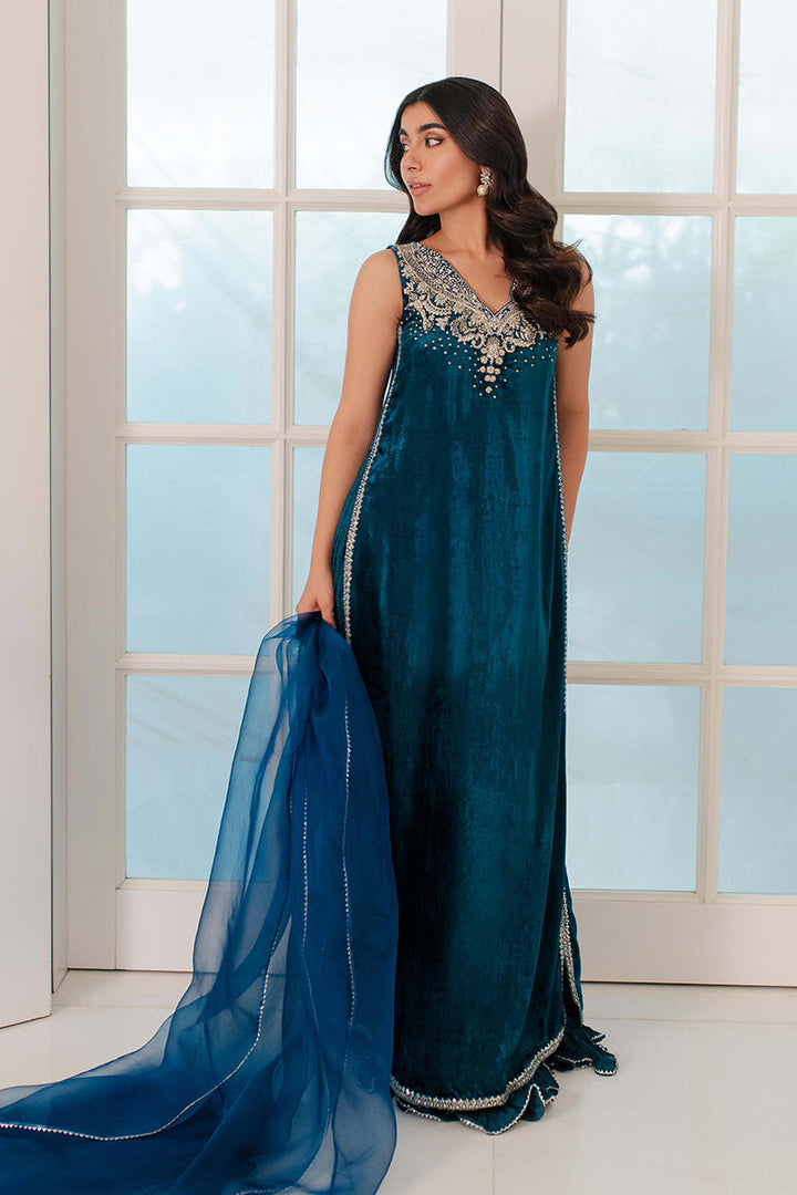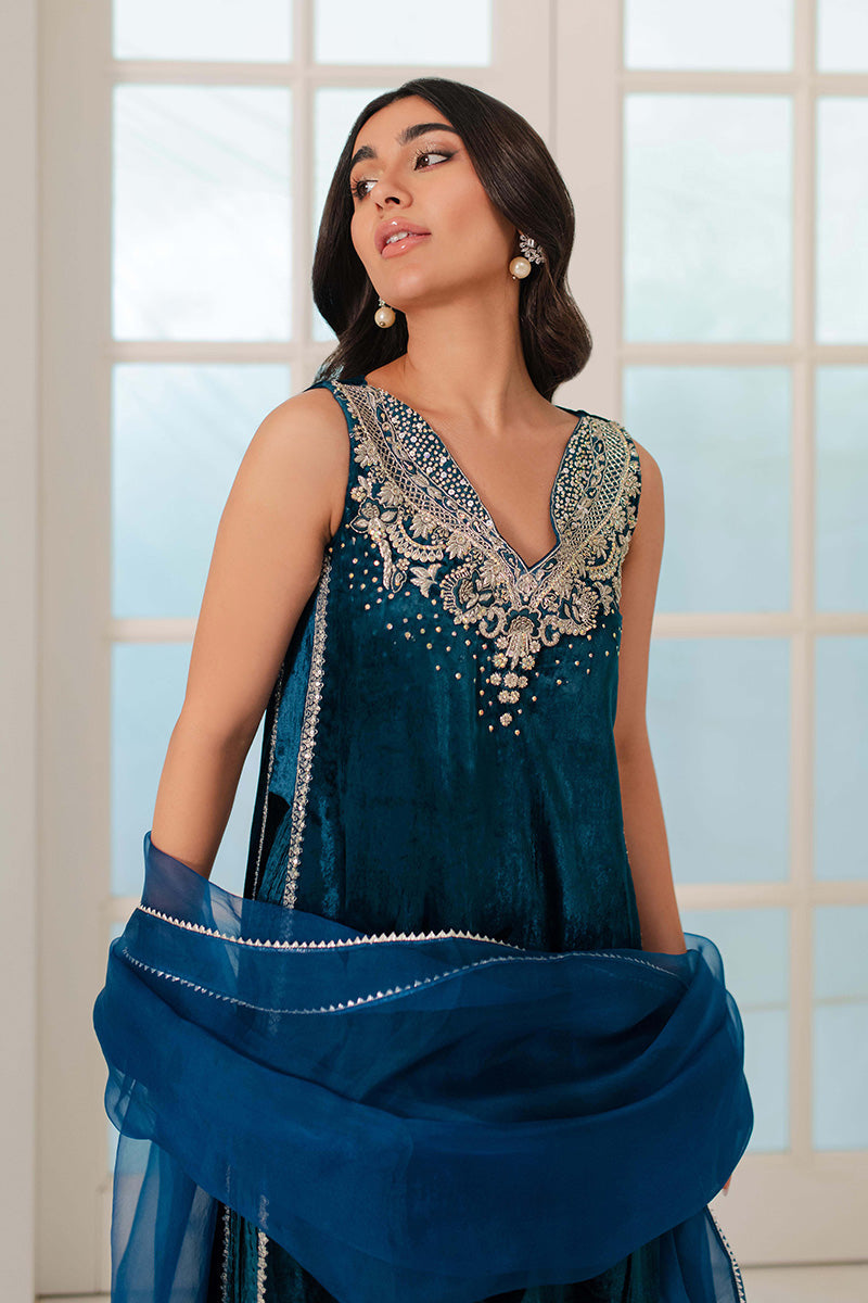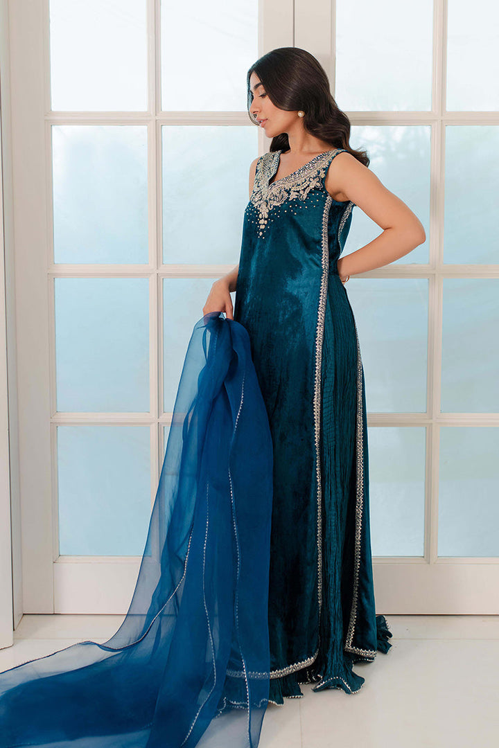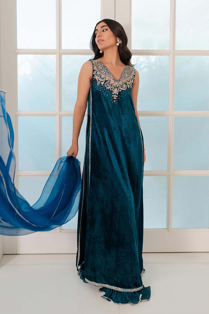 Velvet has never looked this luxe! This teal outfit features a floral neckline with a short collar neckline and a wide slit. The outfit is completed with a matching dupatta...