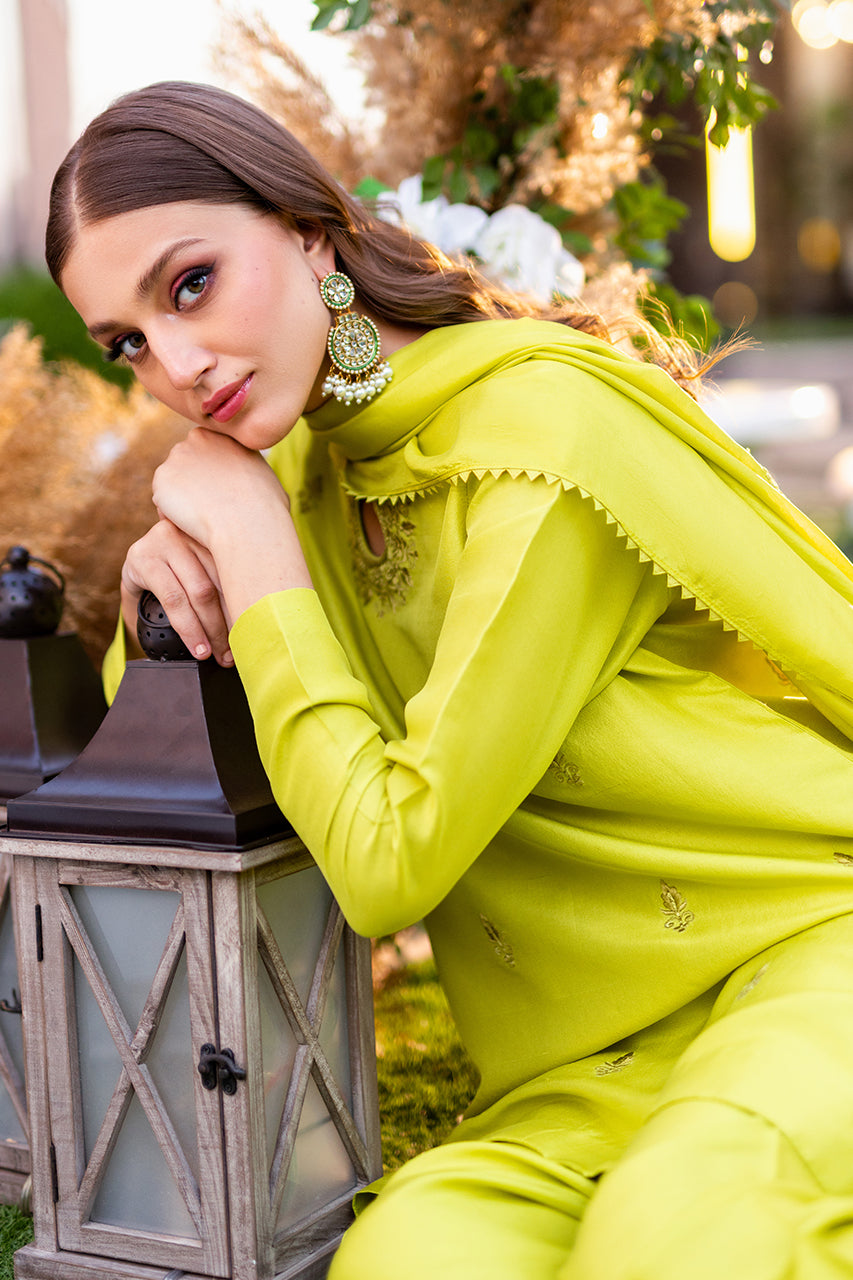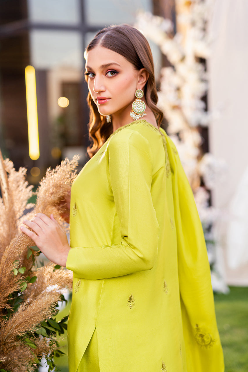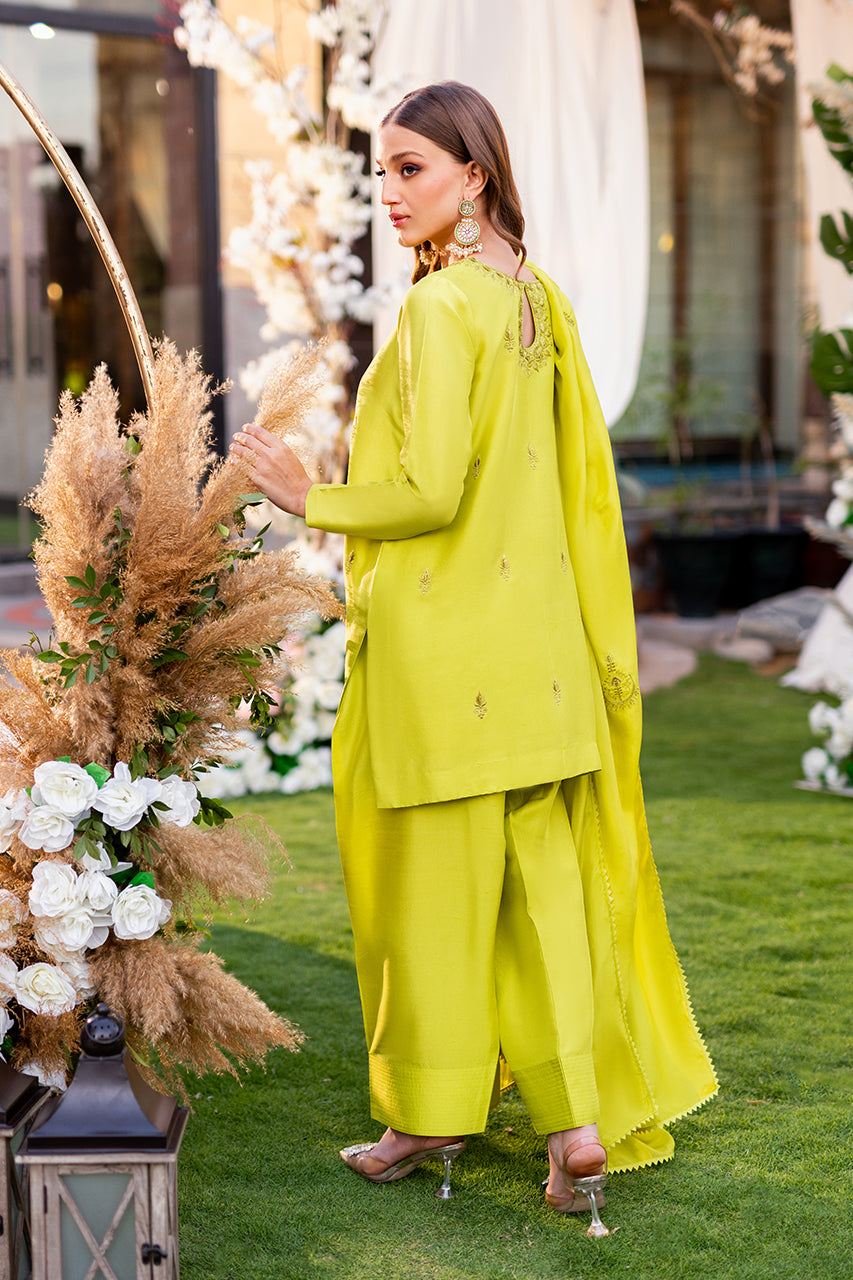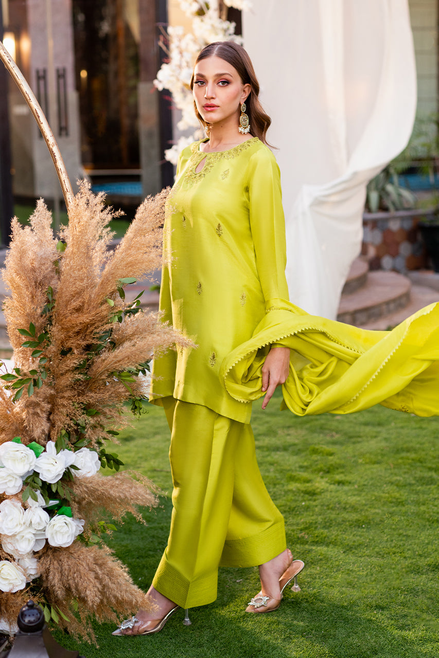 Introducing our luxurious raw silk shirt, meticulously adorned with intricate machine embroidery on both the front and back panels. Paired elegantly with a traditional shalwar and a medium silk embroidered dupatta, this ensemble exudes timeless charm and sophistication, ensuring you radiate elegance.ÂÂ
