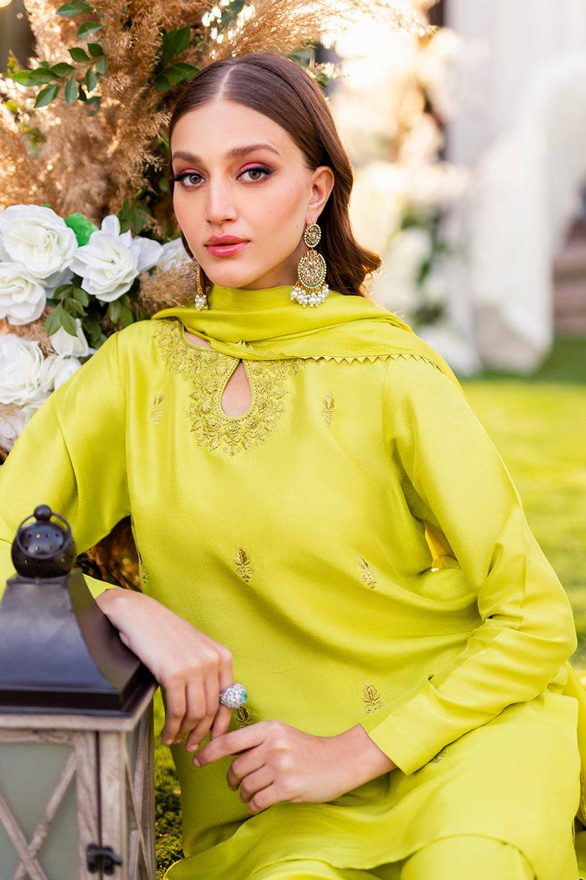 Introducing our luxurious raw silk shirt, meticulously adorned with intricate machine embroidery on both the front and back panels. Paired elegantly with a traditional shalwar and a medium silk embroidered...