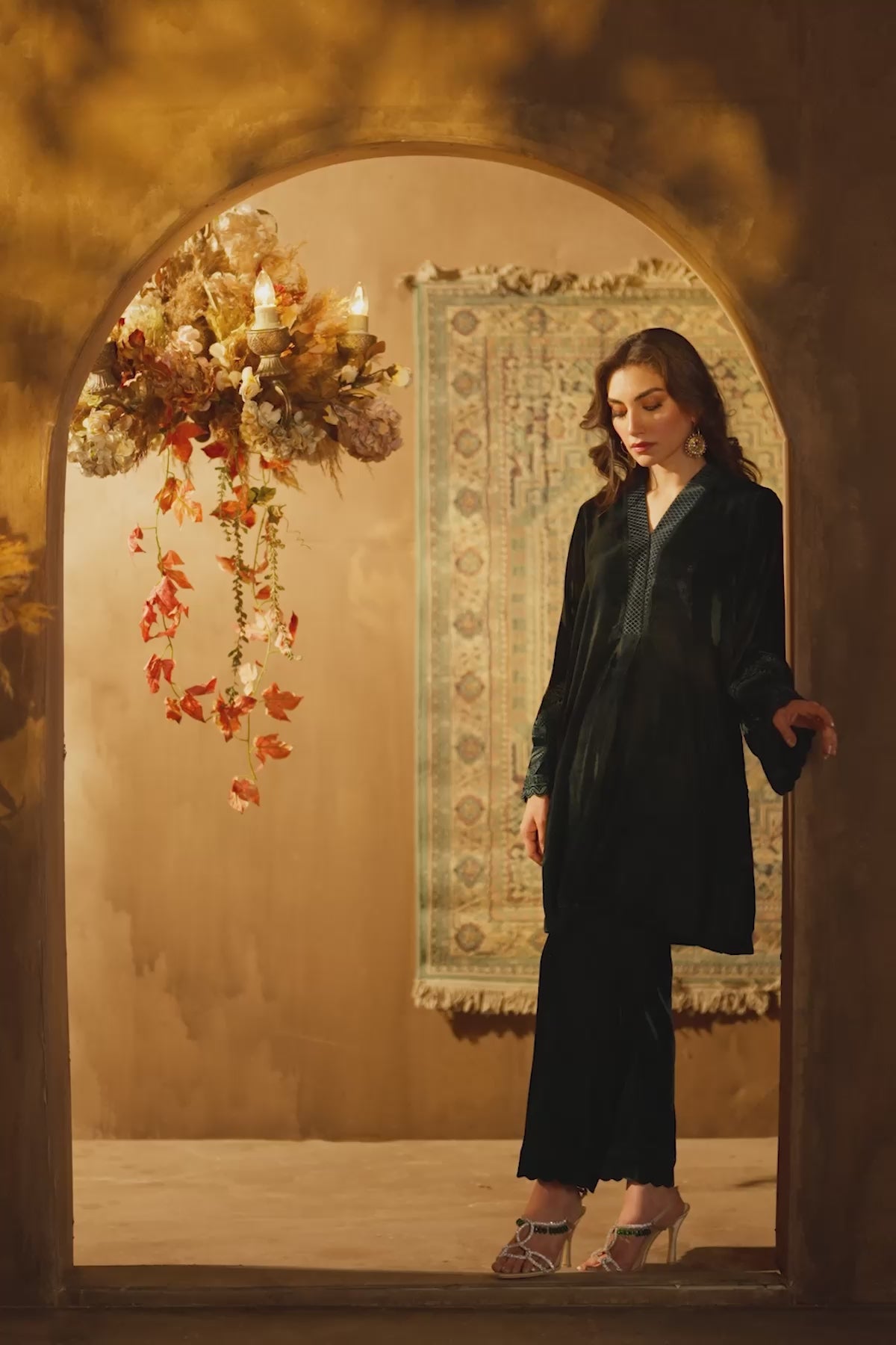 Exquisite Straight Shirt With Overlap Placket And Top Stitches Detailing Paired With Scalloped Culottes And Opulent Sleeve Embroidery.