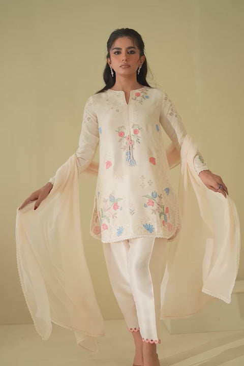 Perfect for summer, this outfit features delicate applique embroidery details in light hues throughout the shirt. The slit and the pants feature a delicate lace trim and the outfit is completed with a matching dupatta.