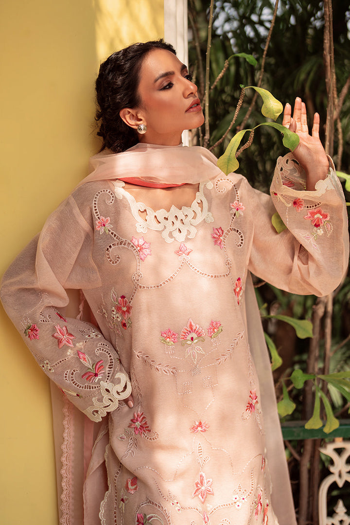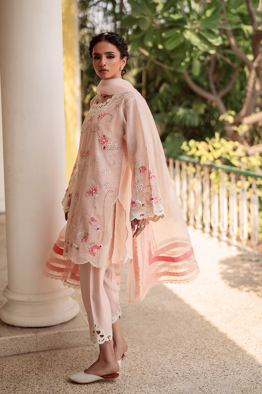 Classic & elegant, 'Fanoos' is a sight for sore eyes. The short shirt is artfully embroiderd with pastel florals and intricate cutork. The defining neckline in applique completes the look. Pair it with a colour block organza dupatta, for a head turning look this season