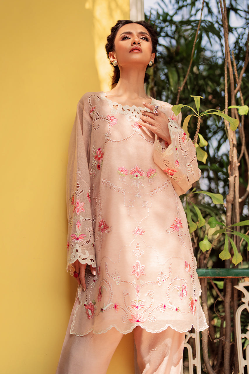Classic & elegant, 'Fanoos' is a sight for sore eyes. The short shirt is artfully embroiderd with pastel florals and intricate cutork. The defining neckline in applique completes the look....