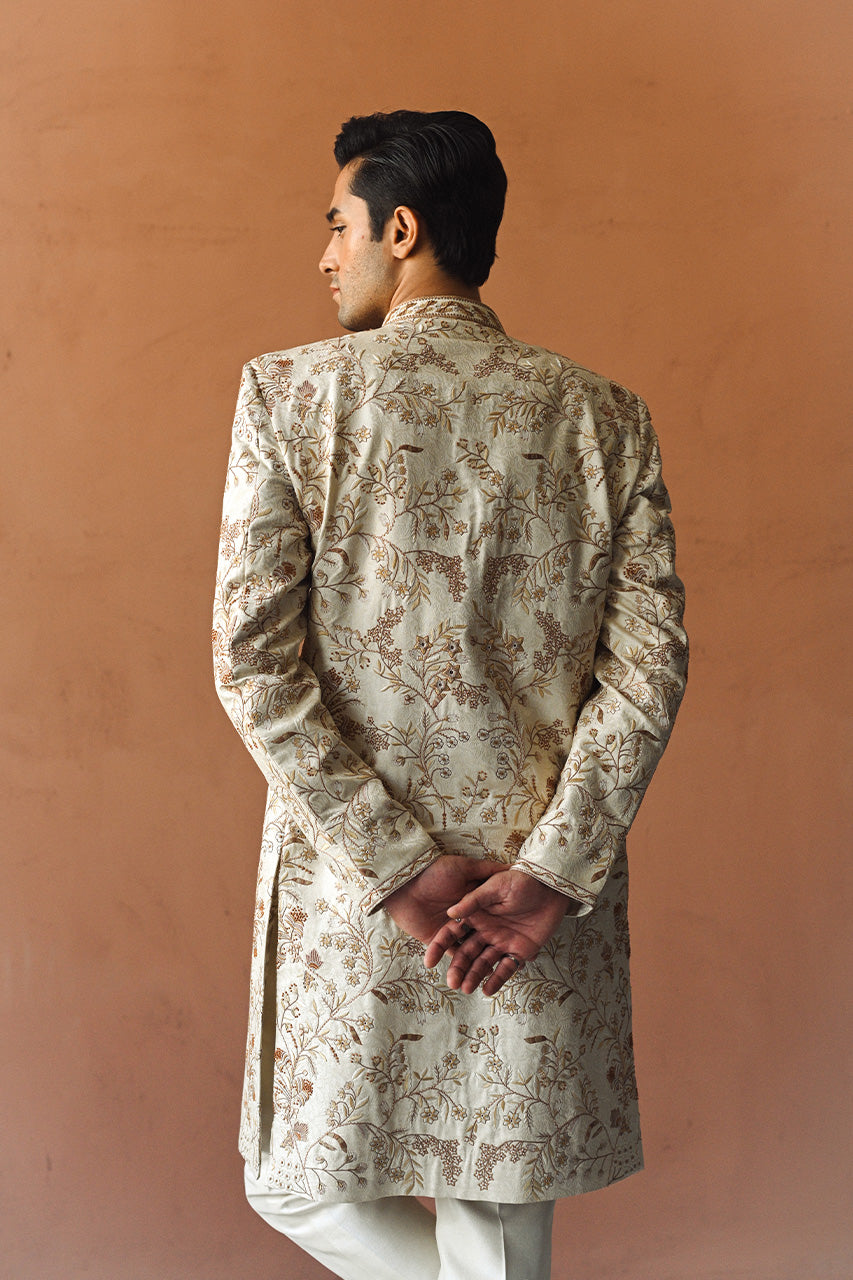 A regal ivory hued sherwani, cut from pure rawsilk, is an artisanal delight with hand embroidered aari details adorning the entire canvas. Lined with the finest medium silk featuring our quintessential print. Paired with matching pure rawsilk trousers and our signature printed pocket square.