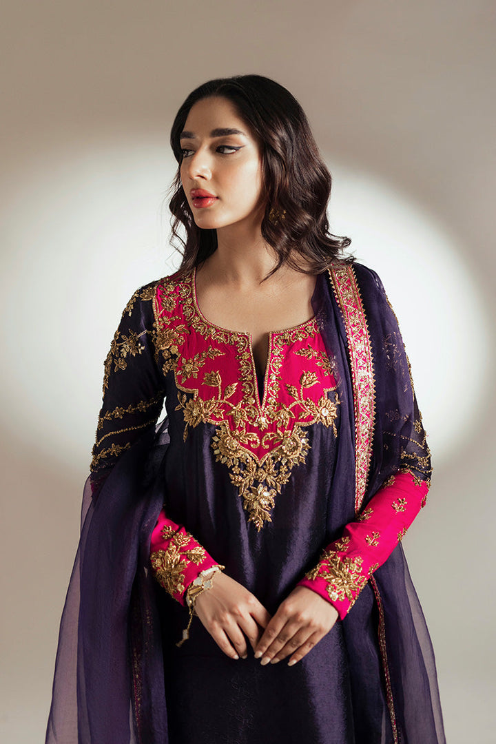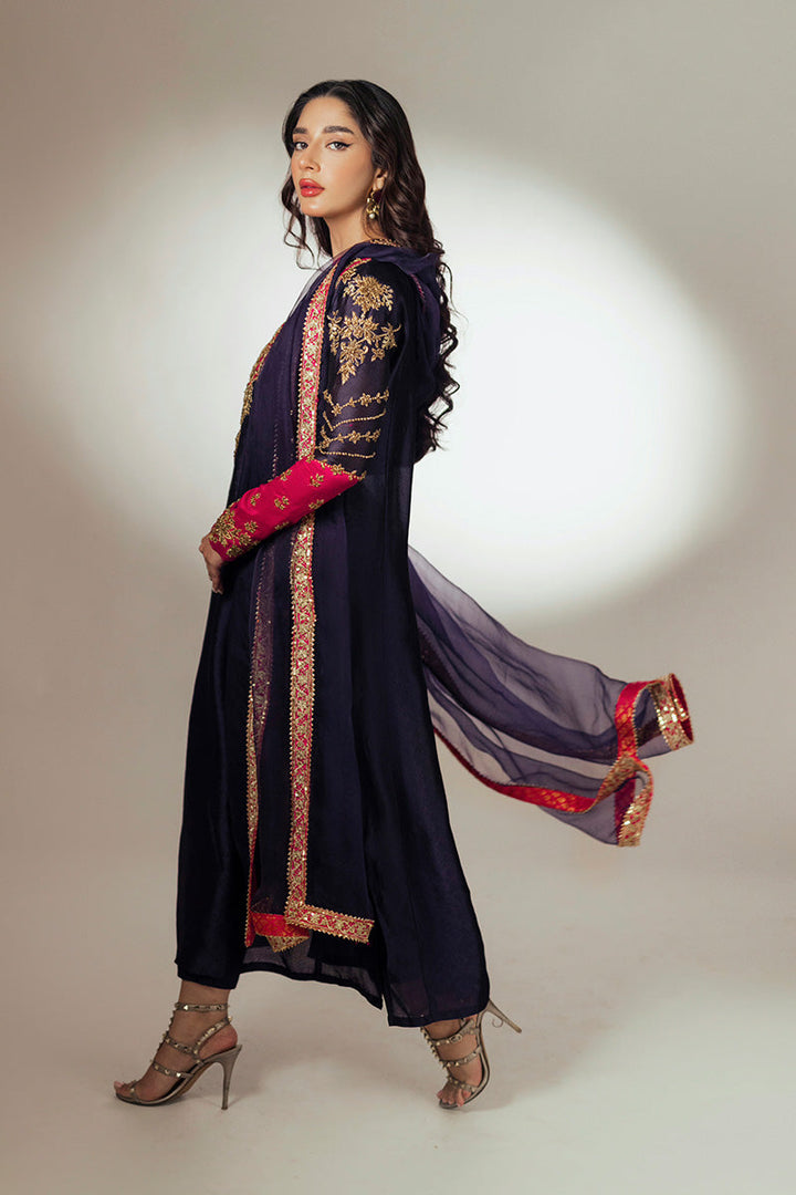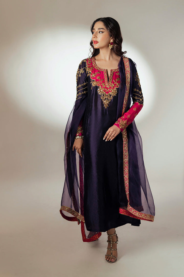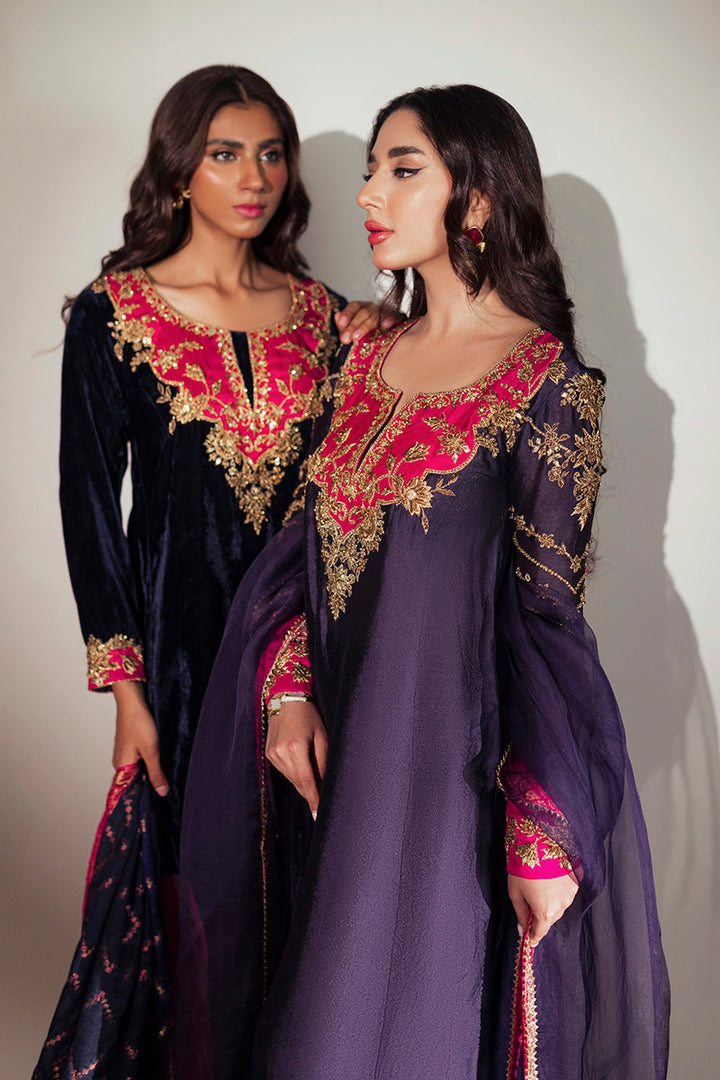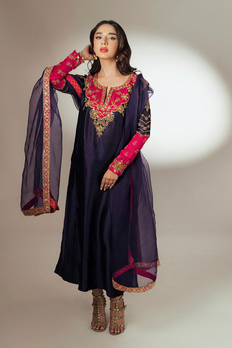 This matching separate gets an update! Glistening gold floral motifs ornately decorate contrasting navy and fuschia colors. The outfit is completed with a jamawar dupatta.